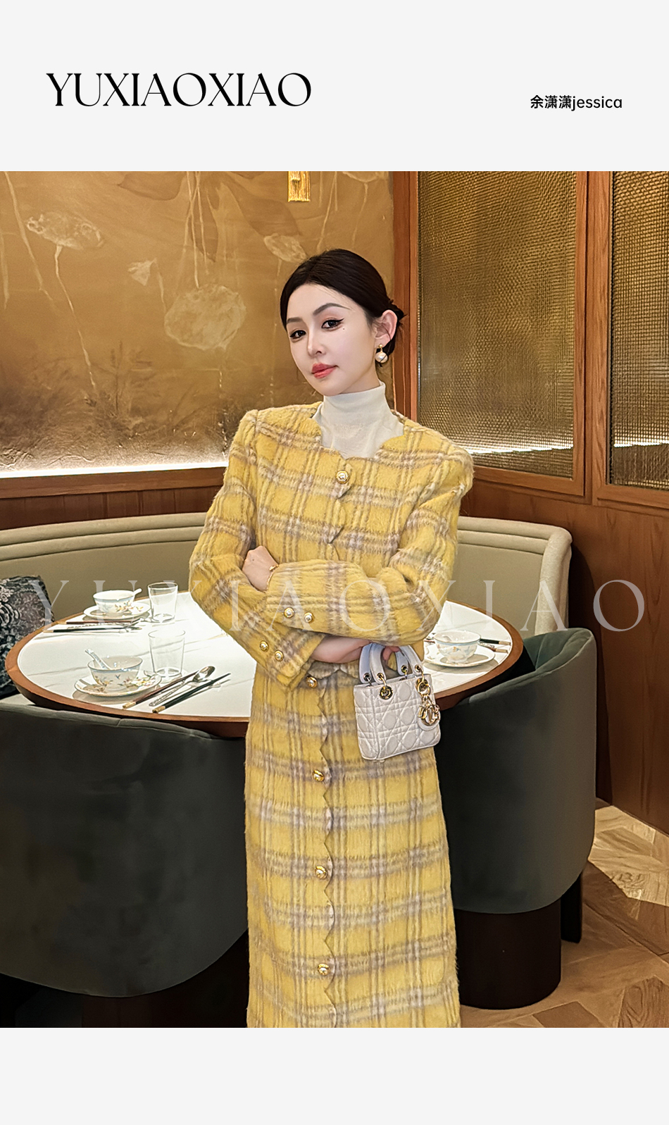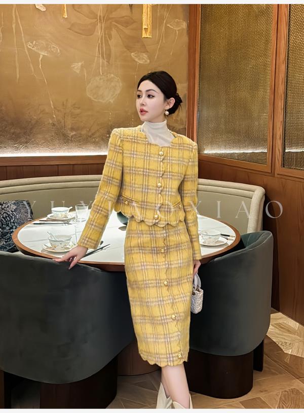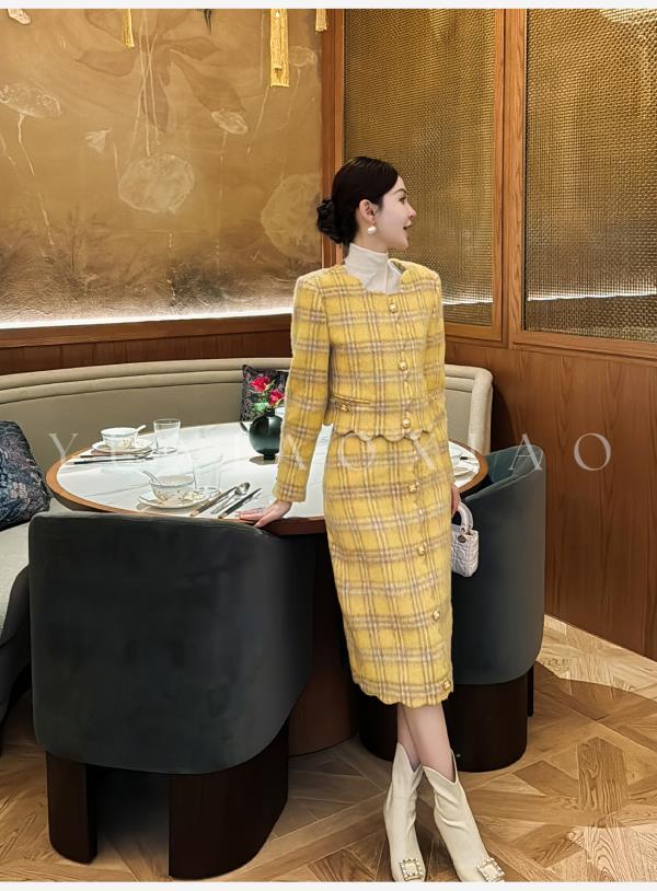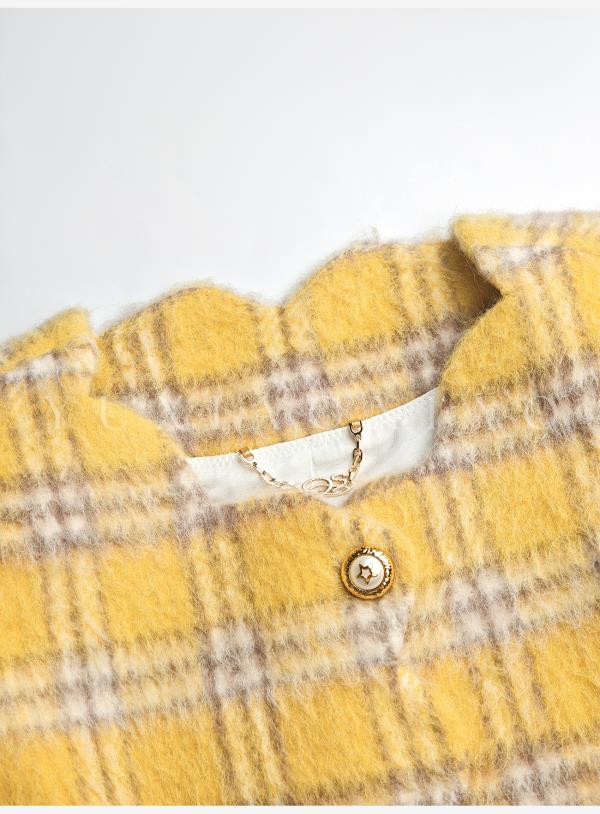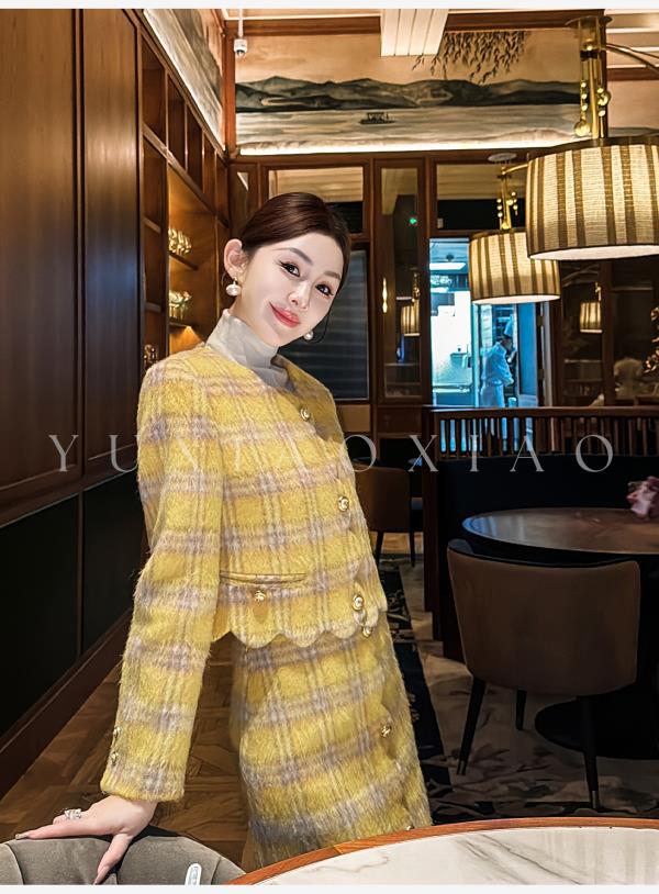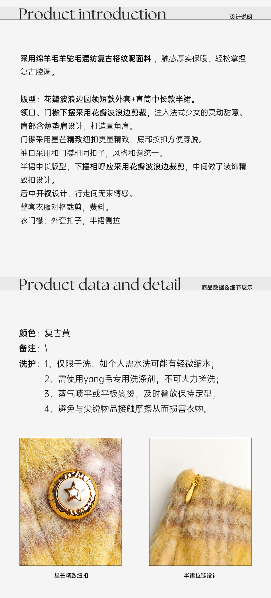 余潇潇【英伦格律】绵羊毛羊驼毛复古格纹花瓣波浪边外套&半裙套装