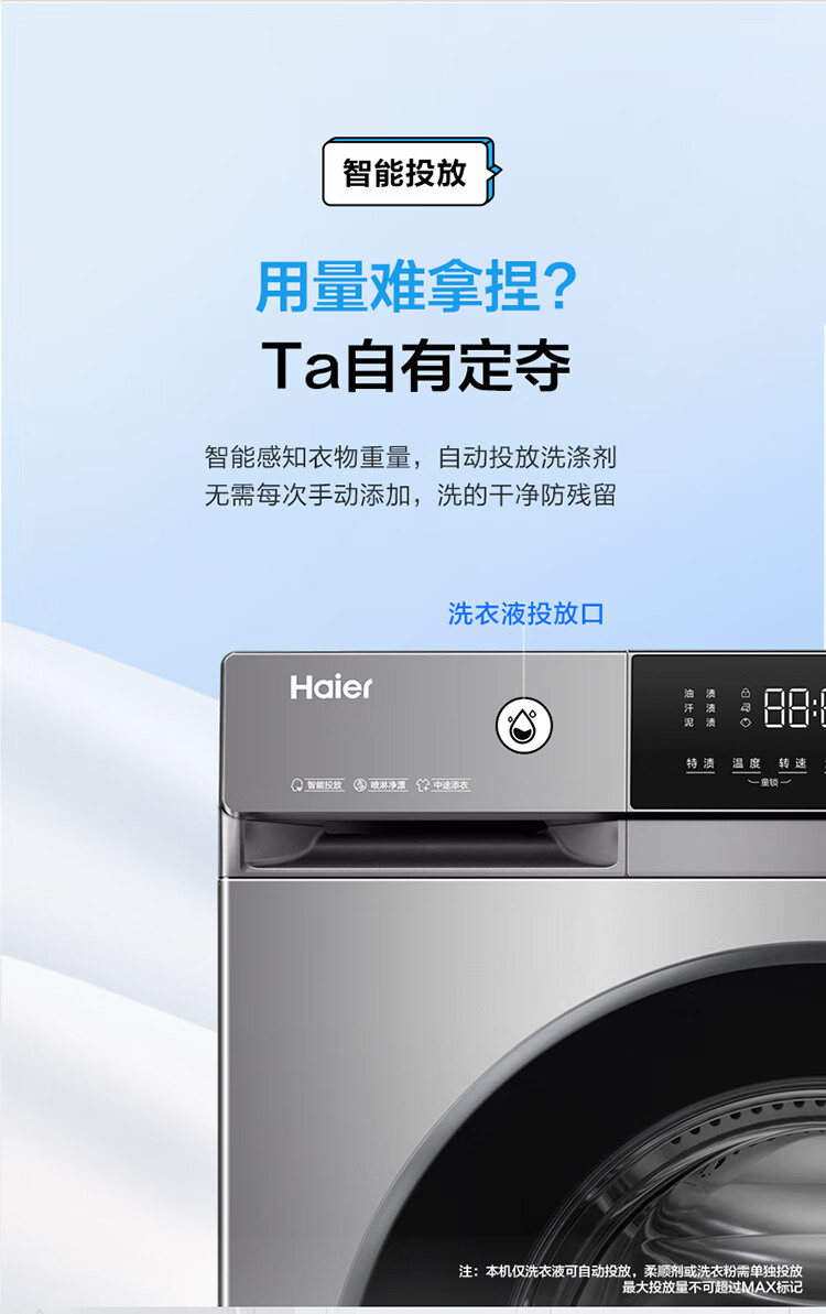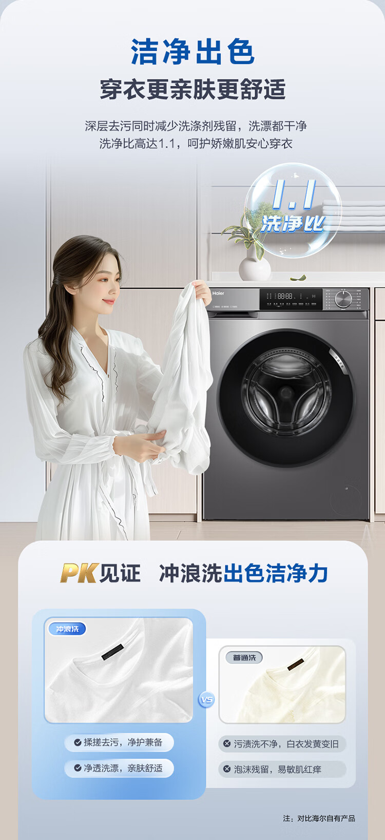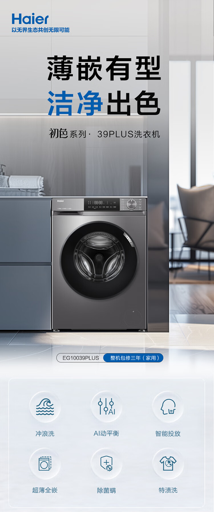 海尔(Haier)滚筒洗衣机全自动单洗 10公斤大容量 1.1洗净比 3D内筒 一级能效 家电国家补贴以旧换新 EG10039PLUS 超薄家用