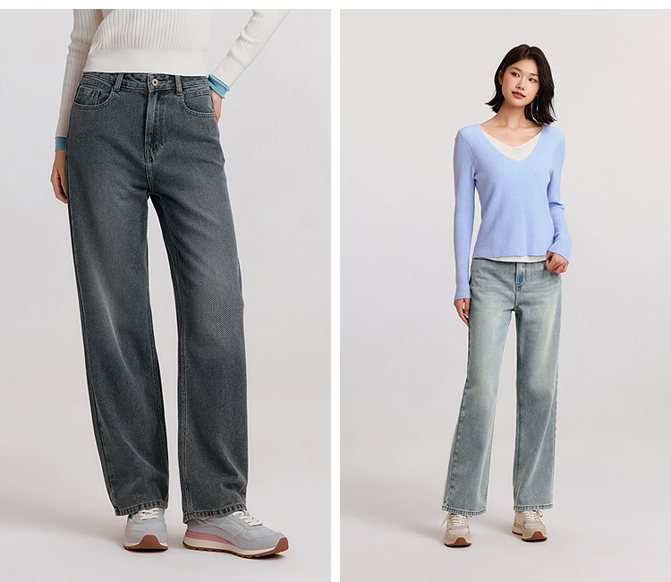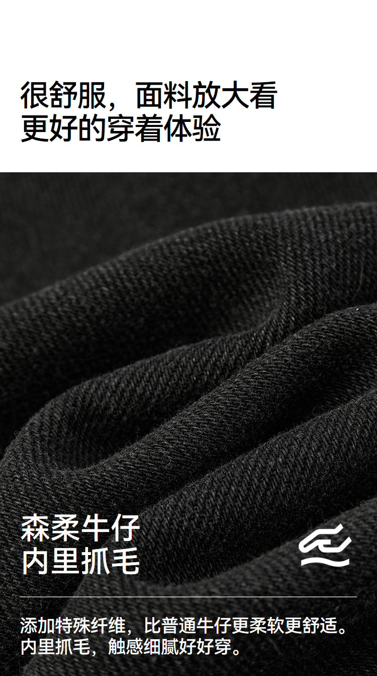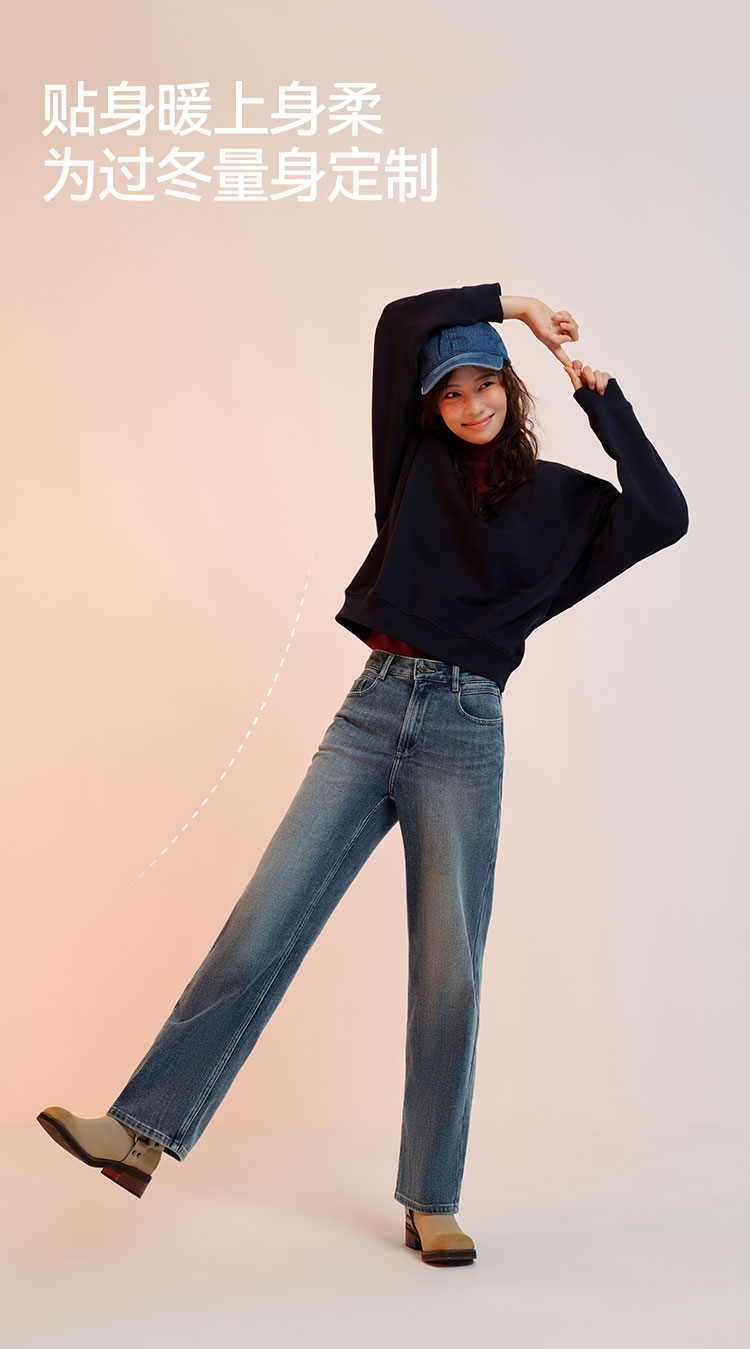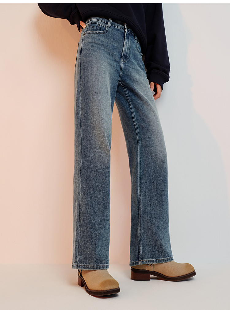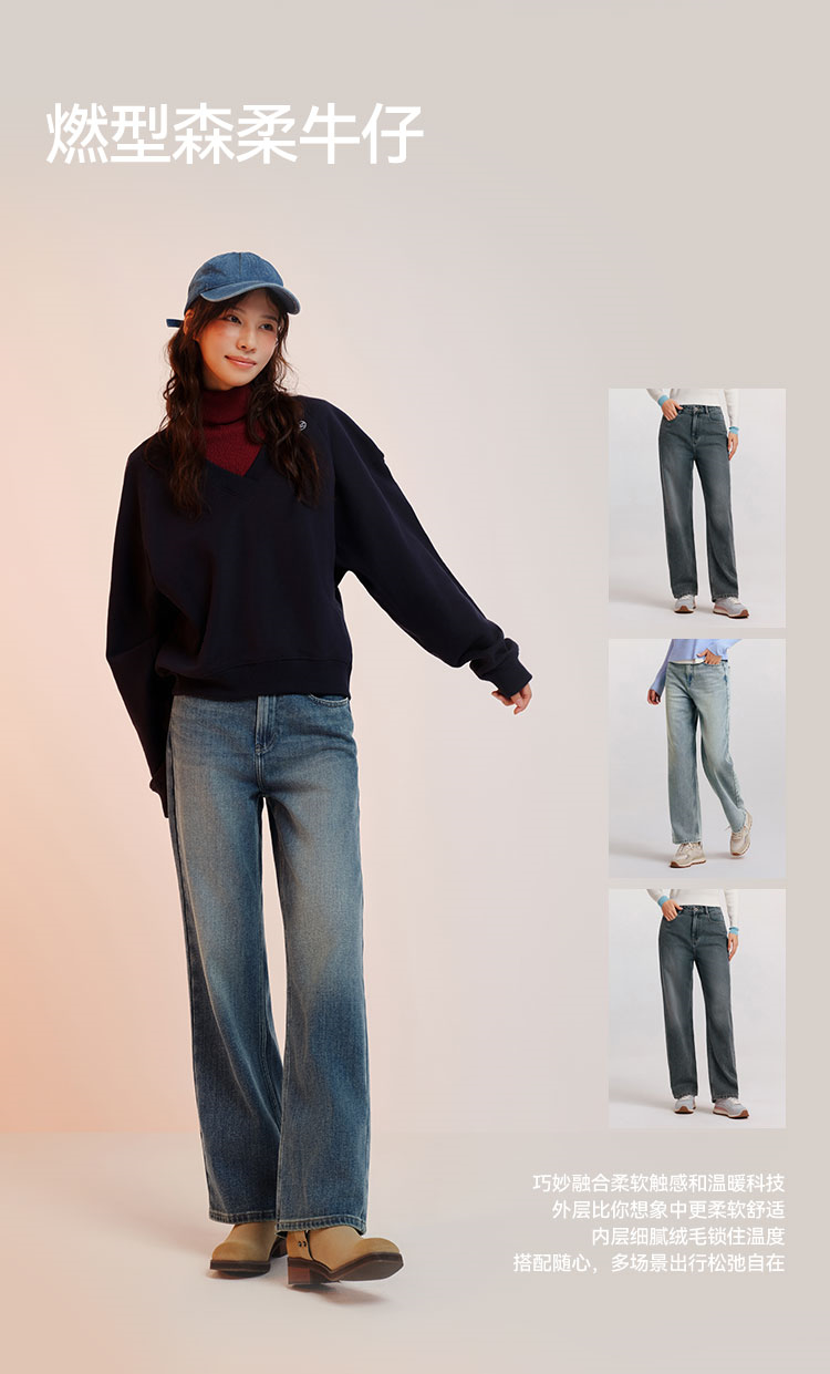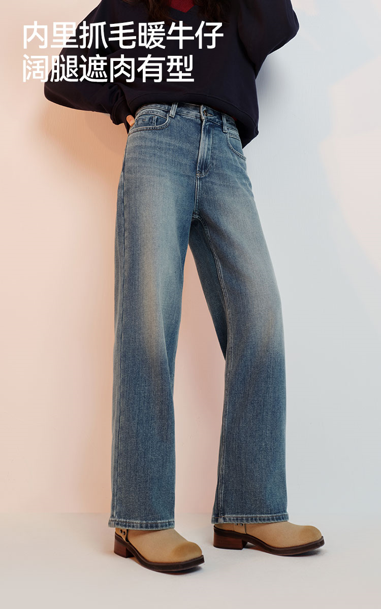 森柔牛仔|森马牛仔裤女舒适抓毛宽松阔腿裤冬季女士做旧长裤复古