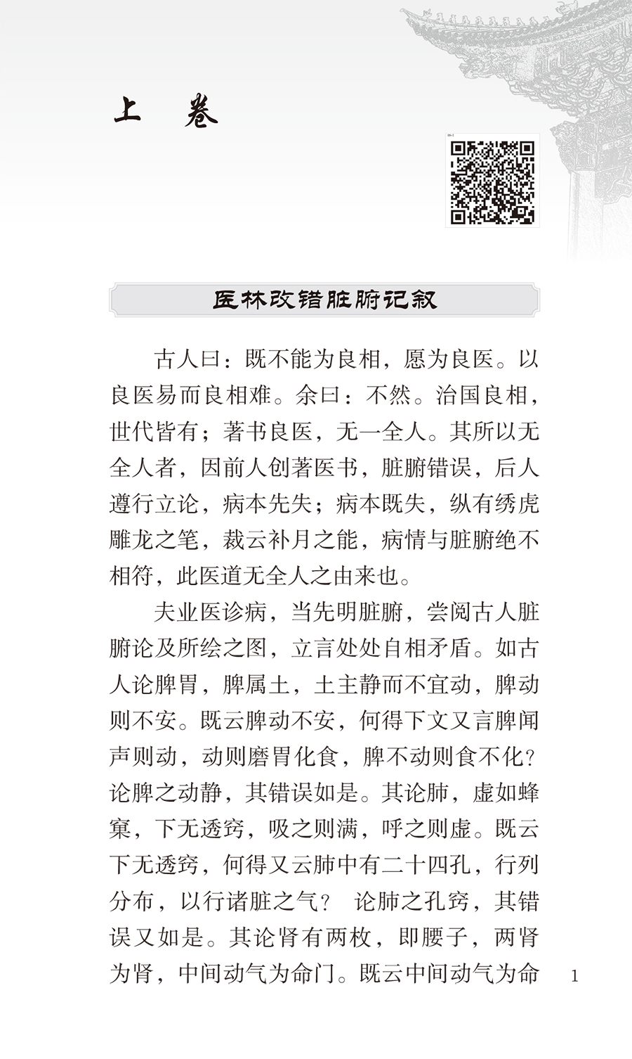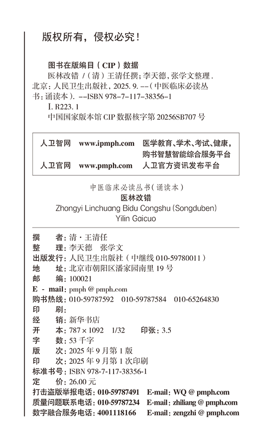 本书为中医临床人才必读丛书(诵读本)之一。《医林改错》为清代医家王清任所撰,成书于1830年。全书分上下两卷,记载了王清任40余年的医学心得和临证经验。其中上卷讨论了古医籍对人体脏腑结构认识的不足之处,并进行补充、更正;论述了通窍活血汤、血府逐瘀汤、膈下逐瘀汤所治之症目。下卷分别对半身不遂、瘫痿、瘟毒吐泻转筋、小儿抽风、痘症、妇人胎产等作了探讨,持论立方,便于临床检用。全书载方33首,其中大多具有临床效验,至今仍为临床所常用。本次整理以清道光庚寅年(1830)京都隆福寺三槐堂书铺刊本为底本,精心校勘,并增加原文朗读音频二维码,以满足读者诵读、记忆之需。本书广泛适用于中医临床医生、基层医生参考。
