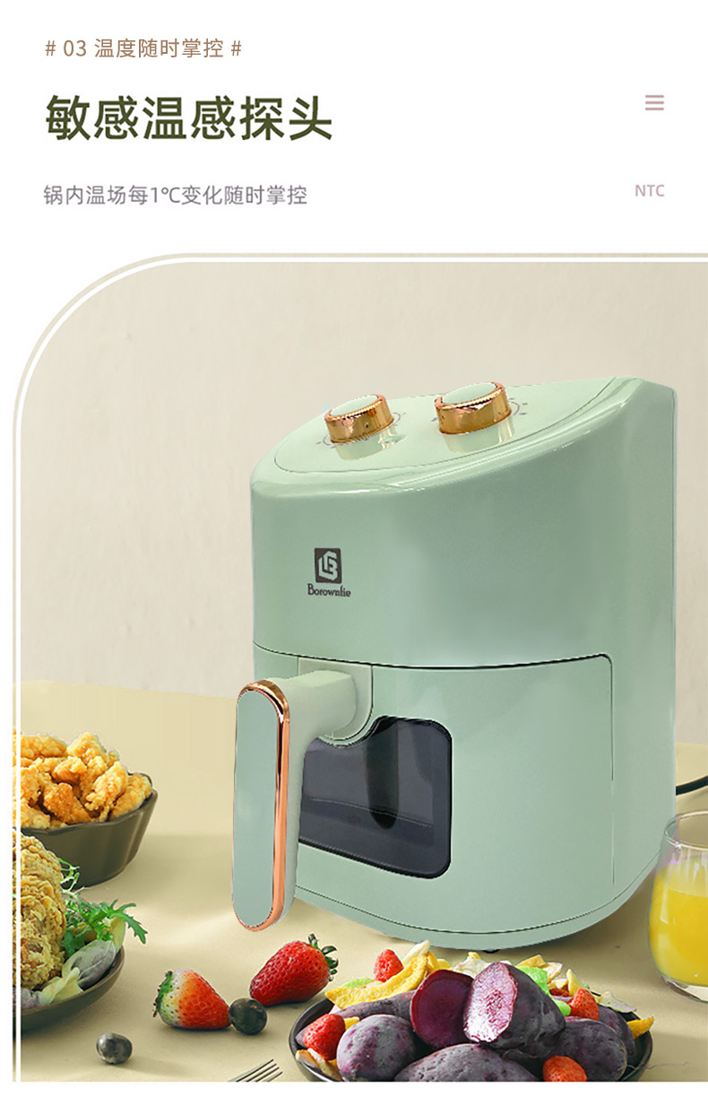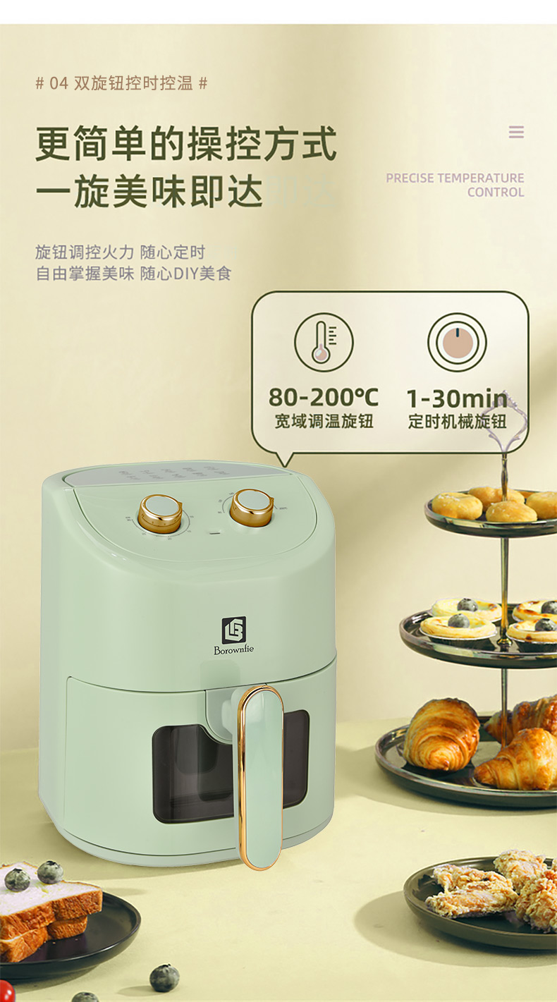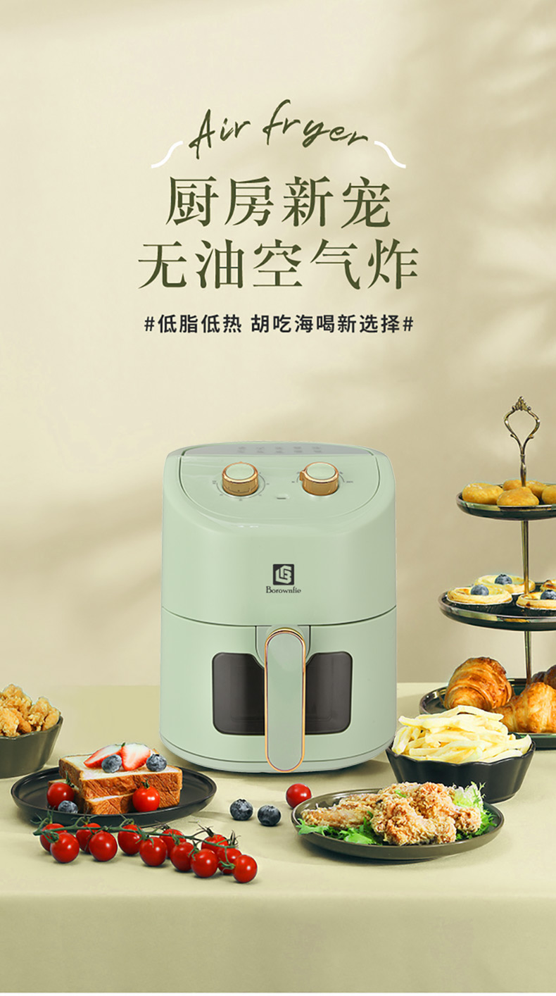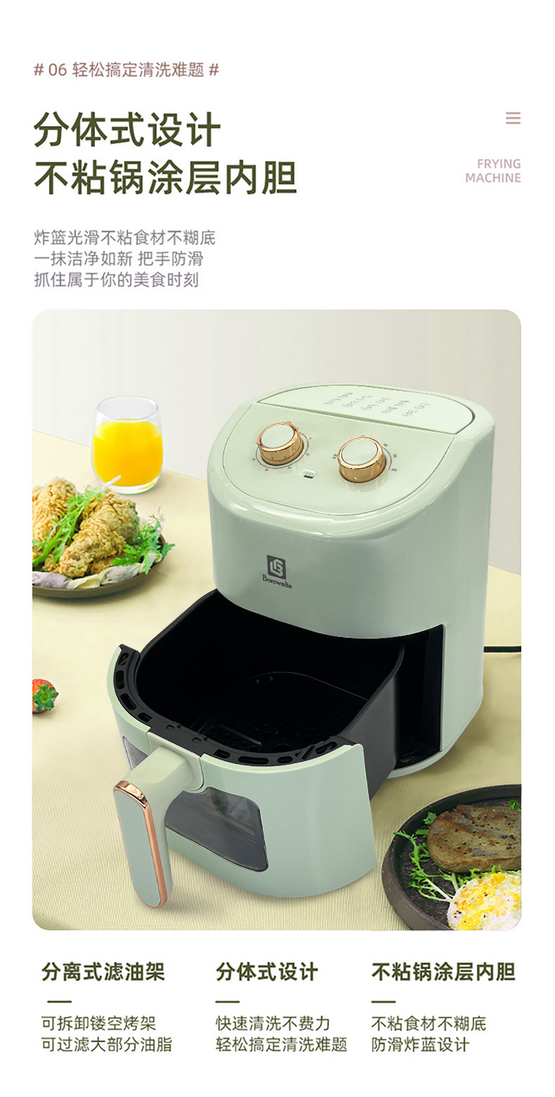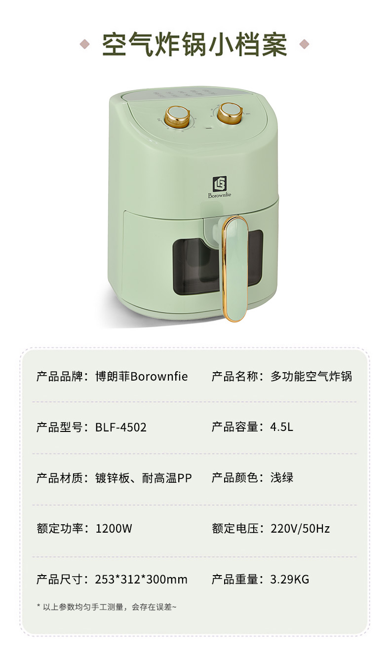 博朗菲多功能空气炸锅可视窗口4.5L大容量低脂无油不粘煎炸锅 智能定时薯条机 浅绿色