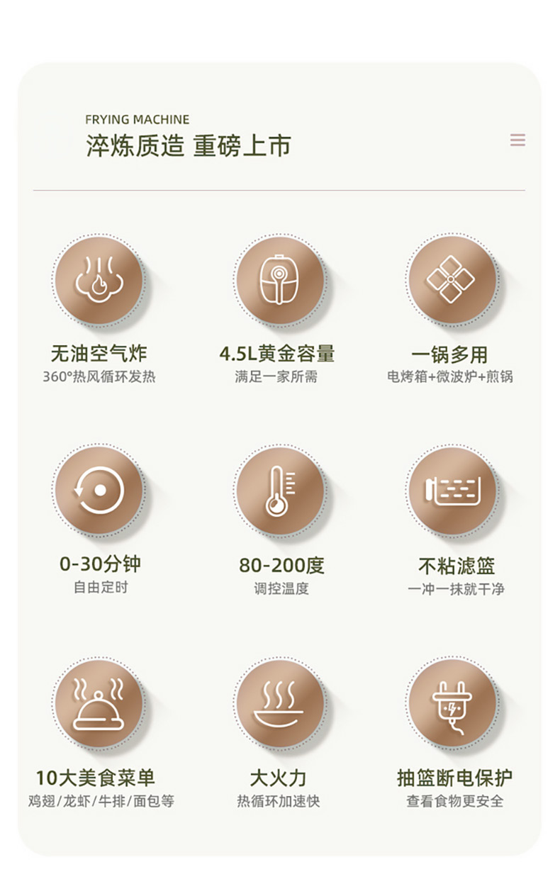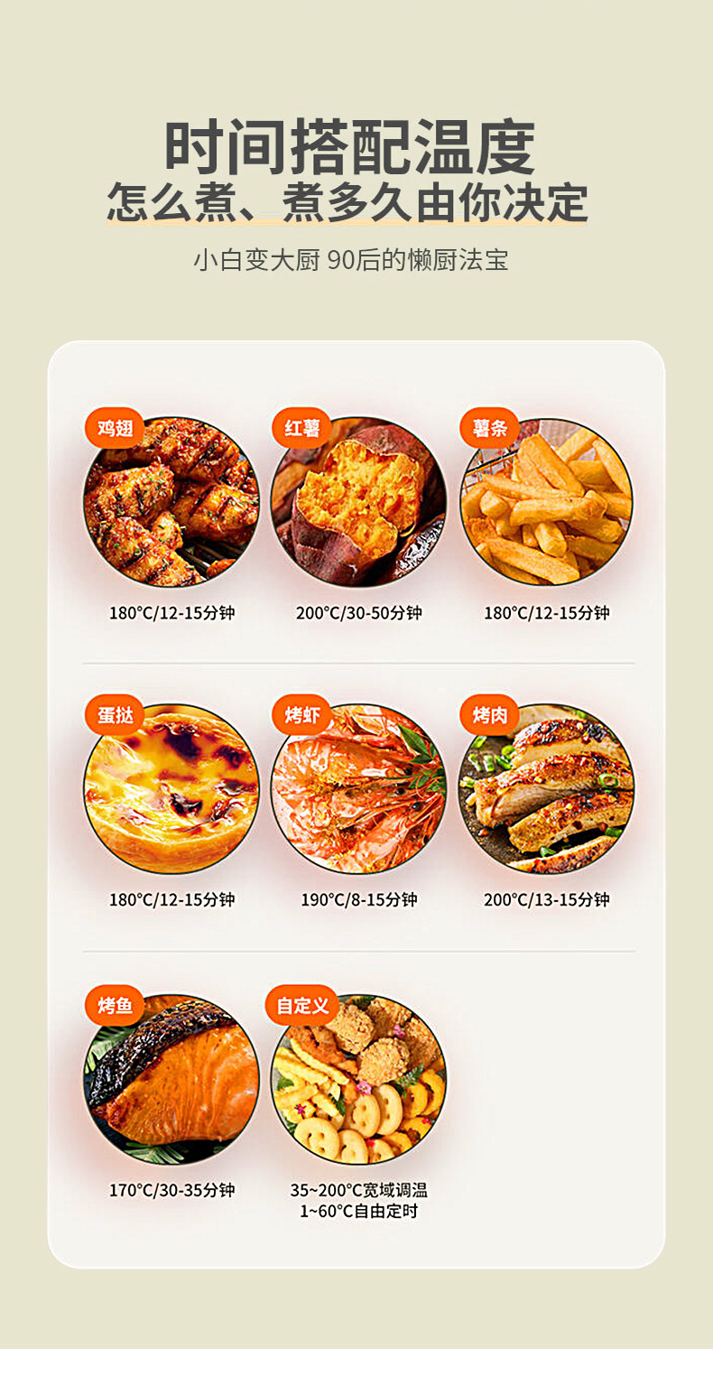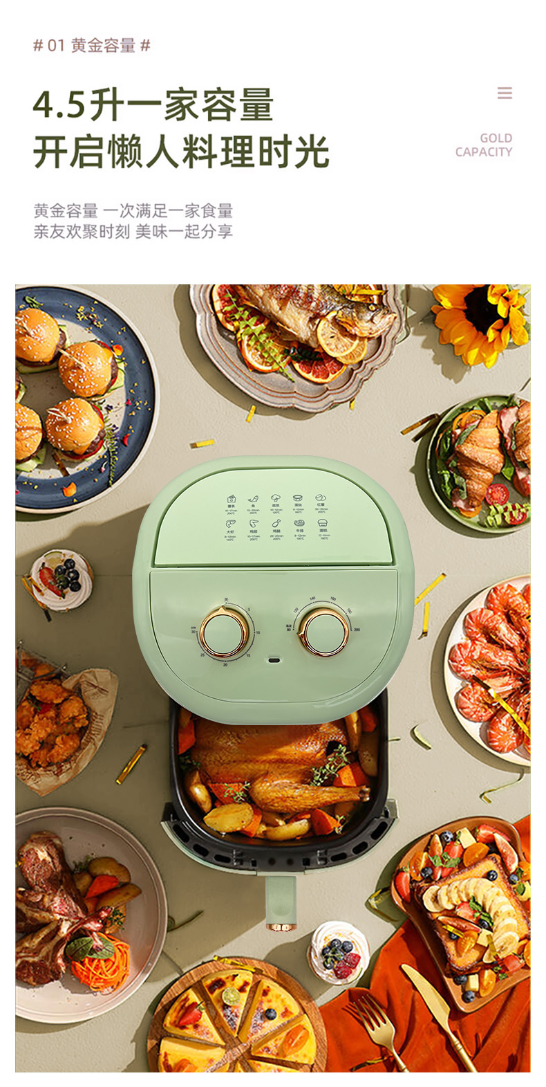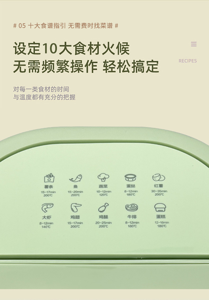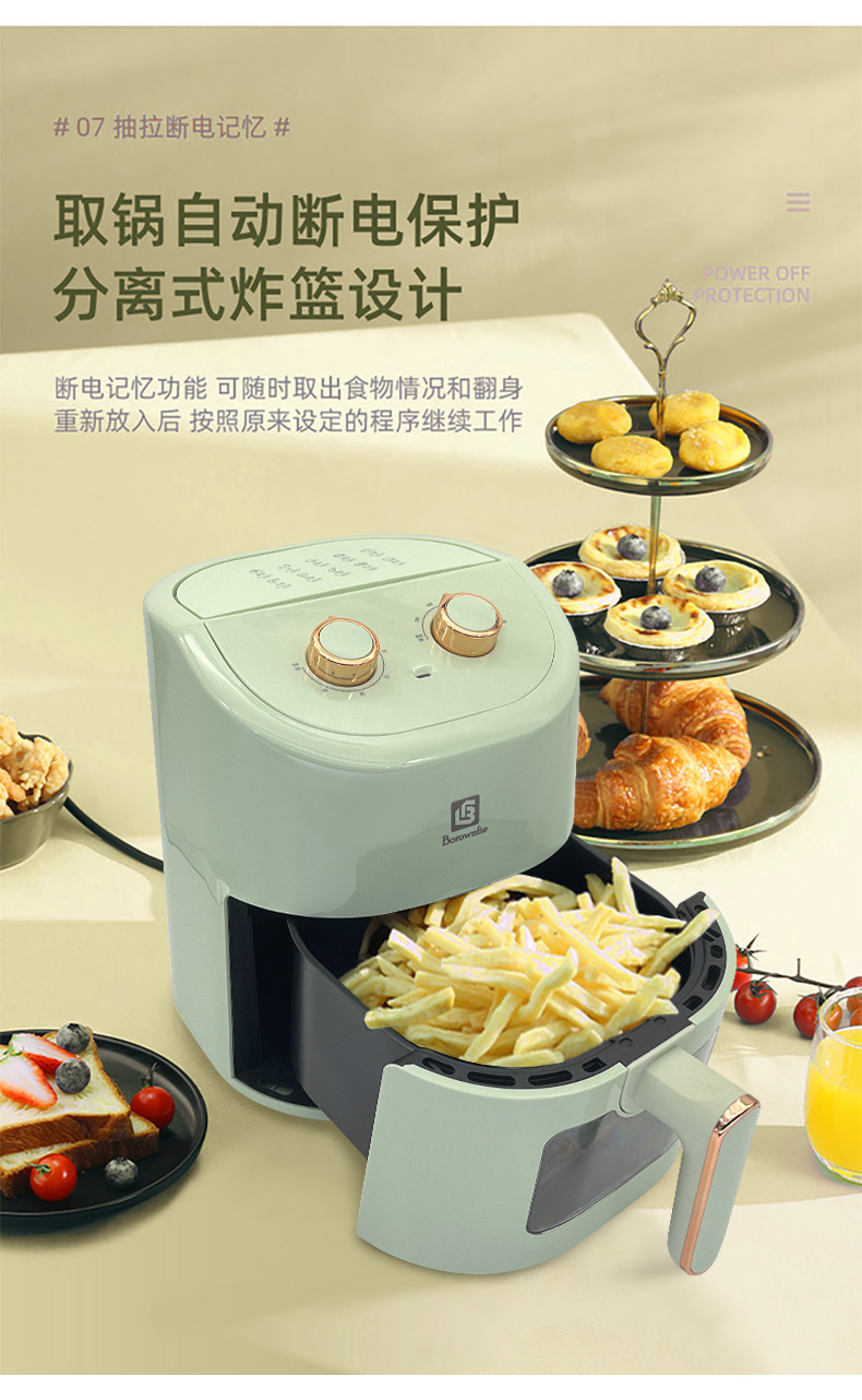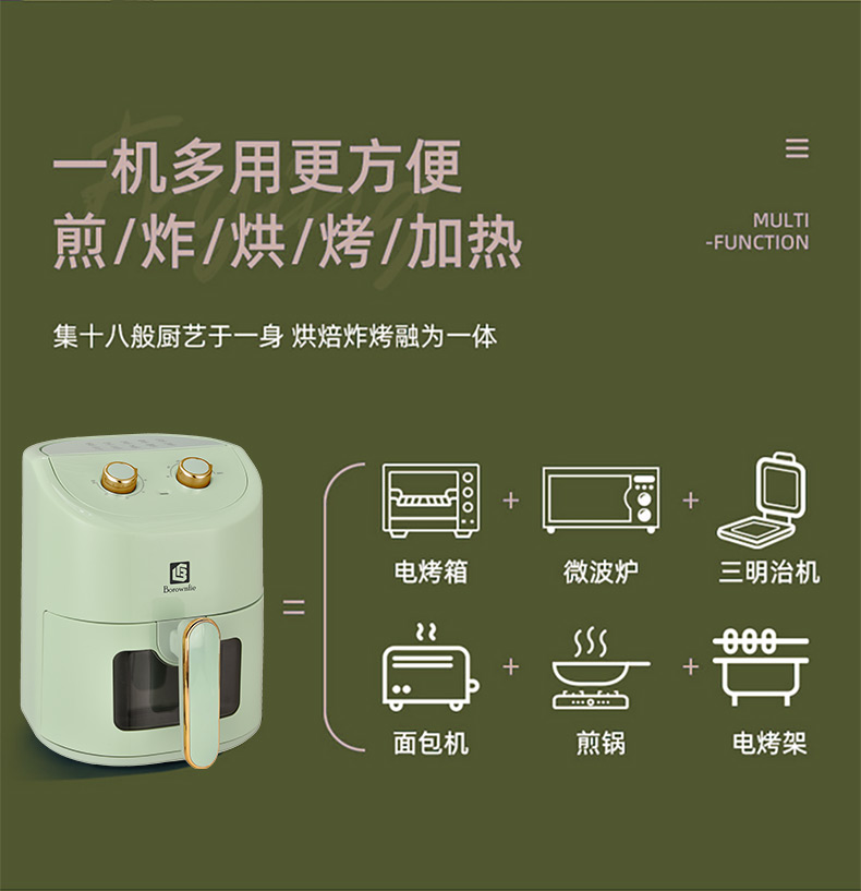 博朗菲多功能空气炸锅可视窗口4.5L大容量低脂无油不粘煎炸锅 智能定时薯条机 浅绿色