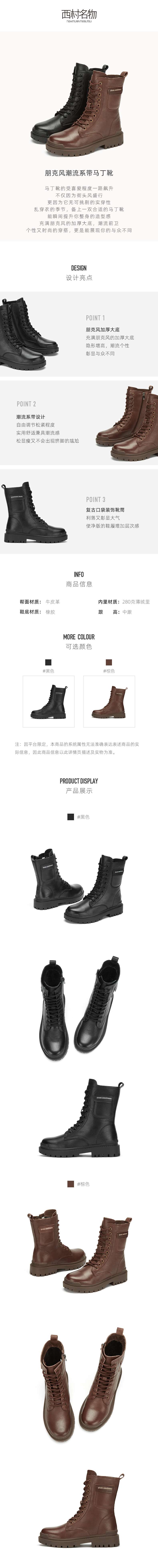 西村名物2020冬季新款朋克风潮流系带加绒马丁靴牛皮革平底女靴X20DC42141