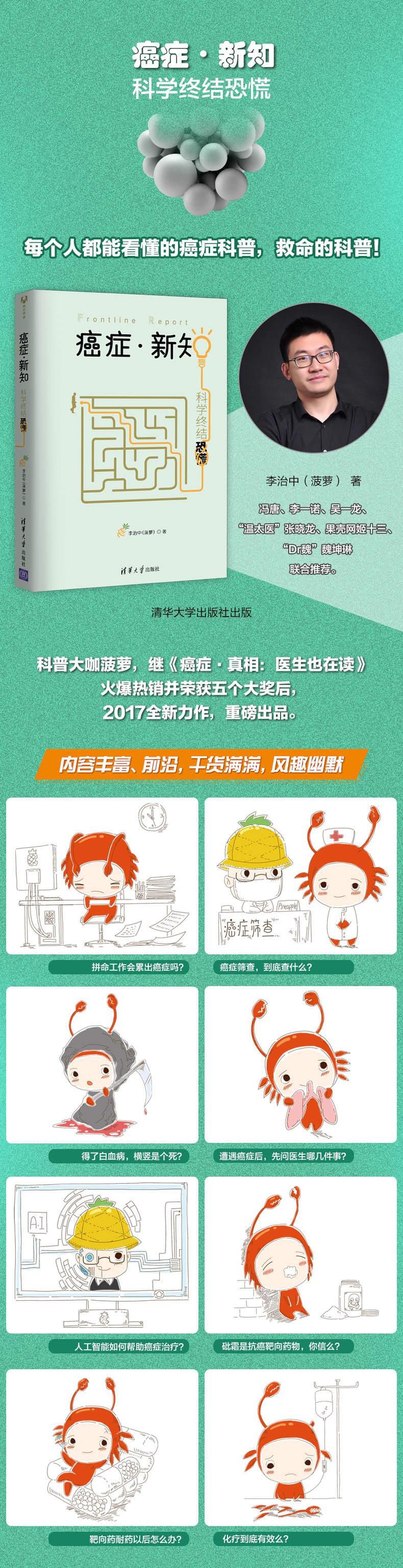 和李菠萝学科学,破除迷信和错觉,挺好。——冯唐(作家,古器物爱好者,投资人,前妇科大夫)我做“一土学校”,菠萝做“菠萝因子”,其实出发点都一样:社会有很多问题,往往错综复杂,人在其中感觉看不到方向,但唯有怀抱希望,系统的思考,开始行动,联合协作,才能带来改变。即使悲观的想,这也是的道路。选择乐观,继而行动,让世界成为我们想要的样子。——李一诺(盖茨基金会中国负责人,一土学校联合创始人)我和医生这个职业有着不解之缘,从清宫太医到现代的西医,每一次对角色的诠释都会进一步了解,越是了解就越是对生活中真实的科学家和医生充满敬佩。菠萝是一位有情怀的年轻科学家,写出的文字也是有温度的。我熟识的医疗界专家都喜欢他的文章,也推荐给您!——张晓龙(《甄嬛传》温太医扮演者,中央戏剧学院教授) 把癌症变为慢性病,是科学的野望,也是这个星球上每个面对生老病死的普通人的梦想。菠萝的这本书,为你揭示这场征途的点点滴滴。——姬十三(果壳网CEO,分答创始人)这可能是我读过的好的癌症科普书籍。无论是常识普及、预防及治疗的要点,还是对流行的错误观点的辟谣,这本书都用轻松而平实的语言讲得清清白白。用理性和科学来管理自己和家人的健康,我向所有人推荐这本书。——魏坤琳(北京大学心理与认知科学学院教授)