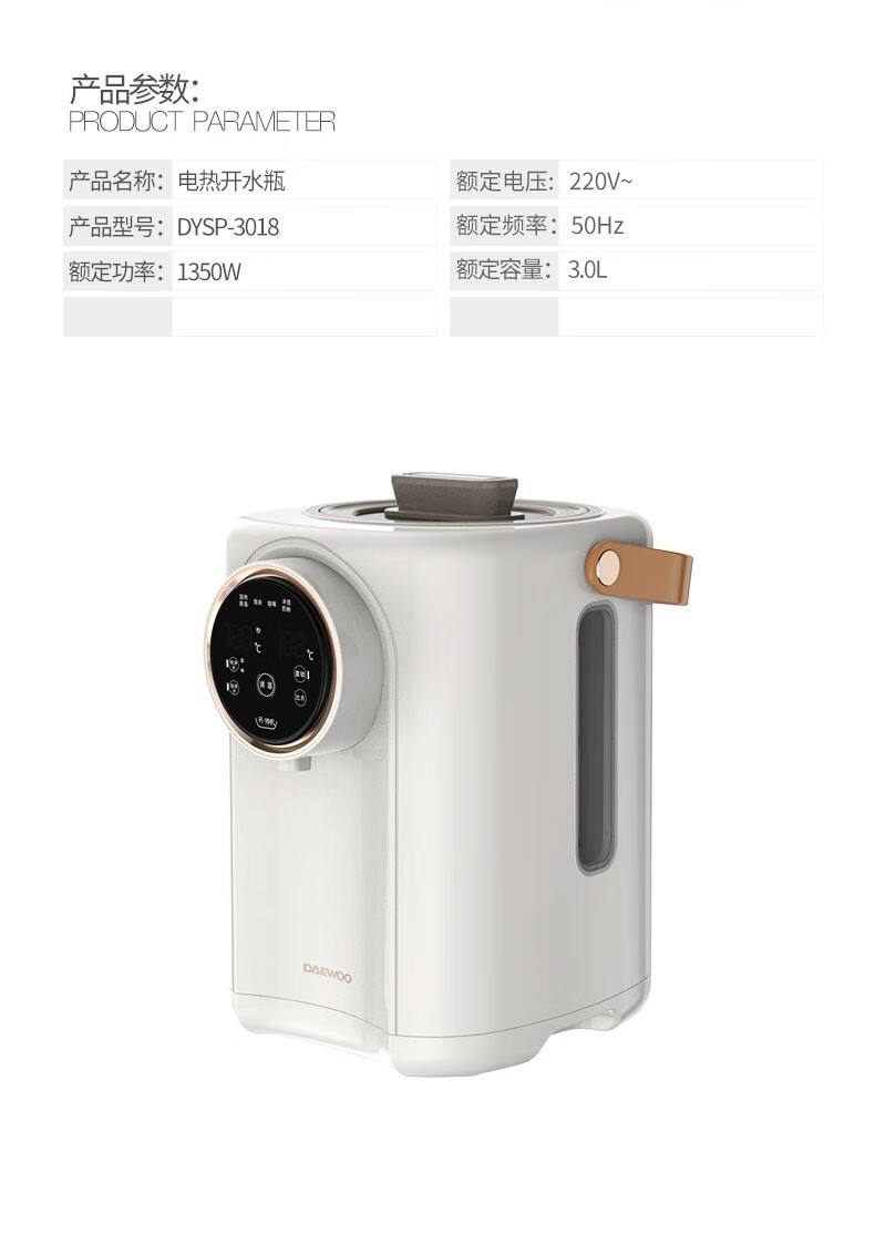 大宇(DAEWOO)家用多功能大容量烧水壶电热开水瓶DYSP-3018晴雪白