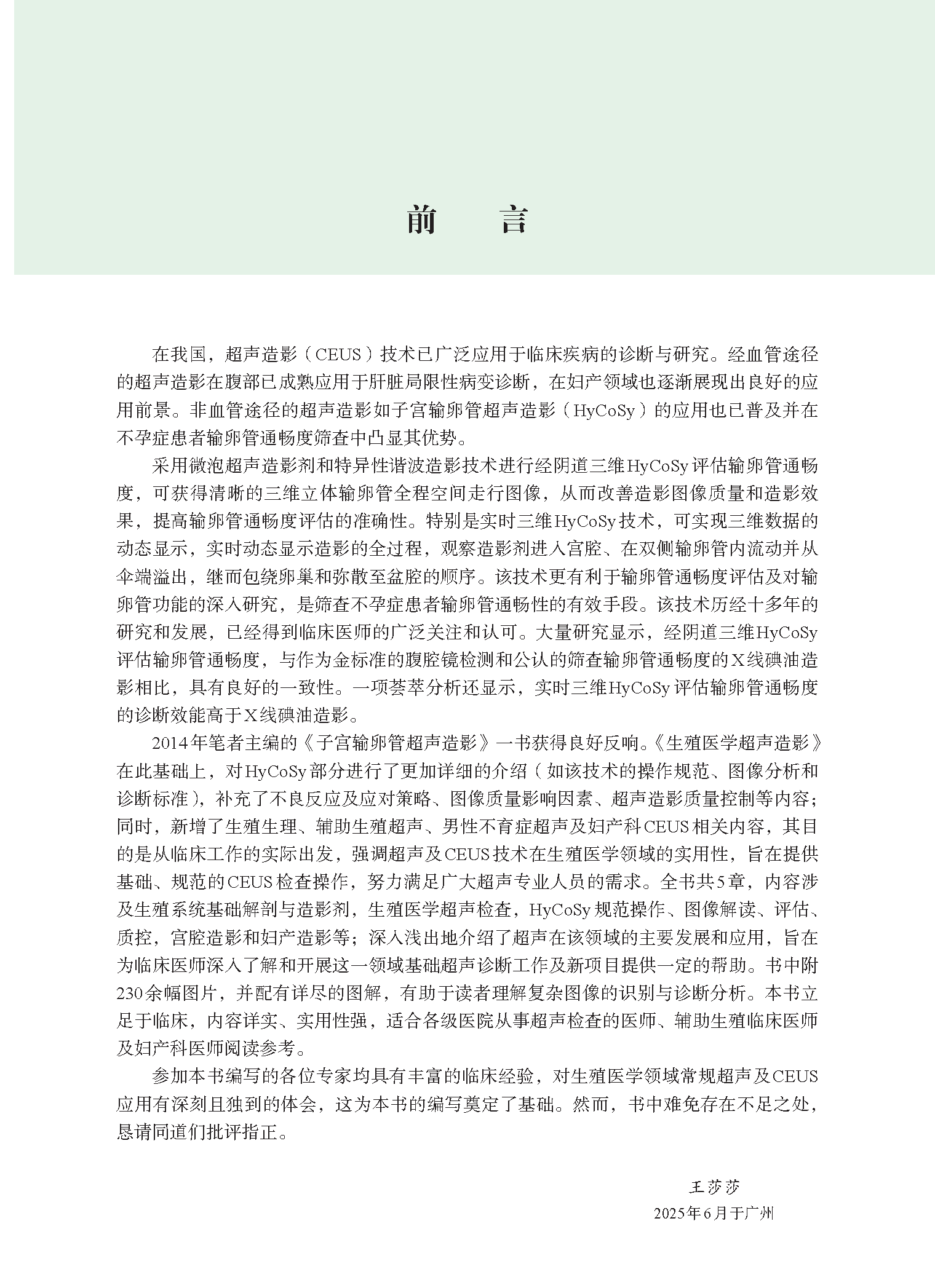 本书从生殖医学的胚胎学、解剖学及生理学基础入手,围绕常规超声在生殖医学领域的应用,尤其是超声造影技术在生殖医学领域的临床应用进行阐述,涵盖非血管途径的子宫输卵管超声造影及经血管途径妇产疾病的超声造影。本书基于编者多年运用新型微泡型造影剂开展经阴道三维子宫输卵管造影的经验,对子宫输卵管超声造影方法学、造影图像分析与解读、诊断标准、造影中不良反应应对策略、图像质量影响因素,以及造影过程中的质量控制等重点内容进行了全面总结;在经血管途径妇产疾病超声造影部分,详细描述了子宫、卵巢良恶性肿瘤及病理产科病变的超声造影特征性表现。