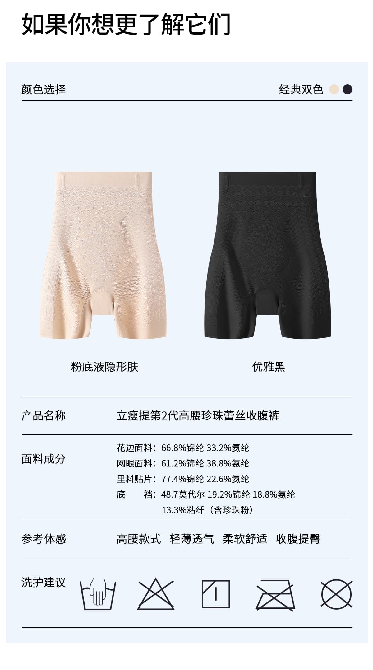 【底裆】:48.7%莫代尔 19.2%锦纶 18.8%氨纶 13.3%粘纤(含珍珠粉)