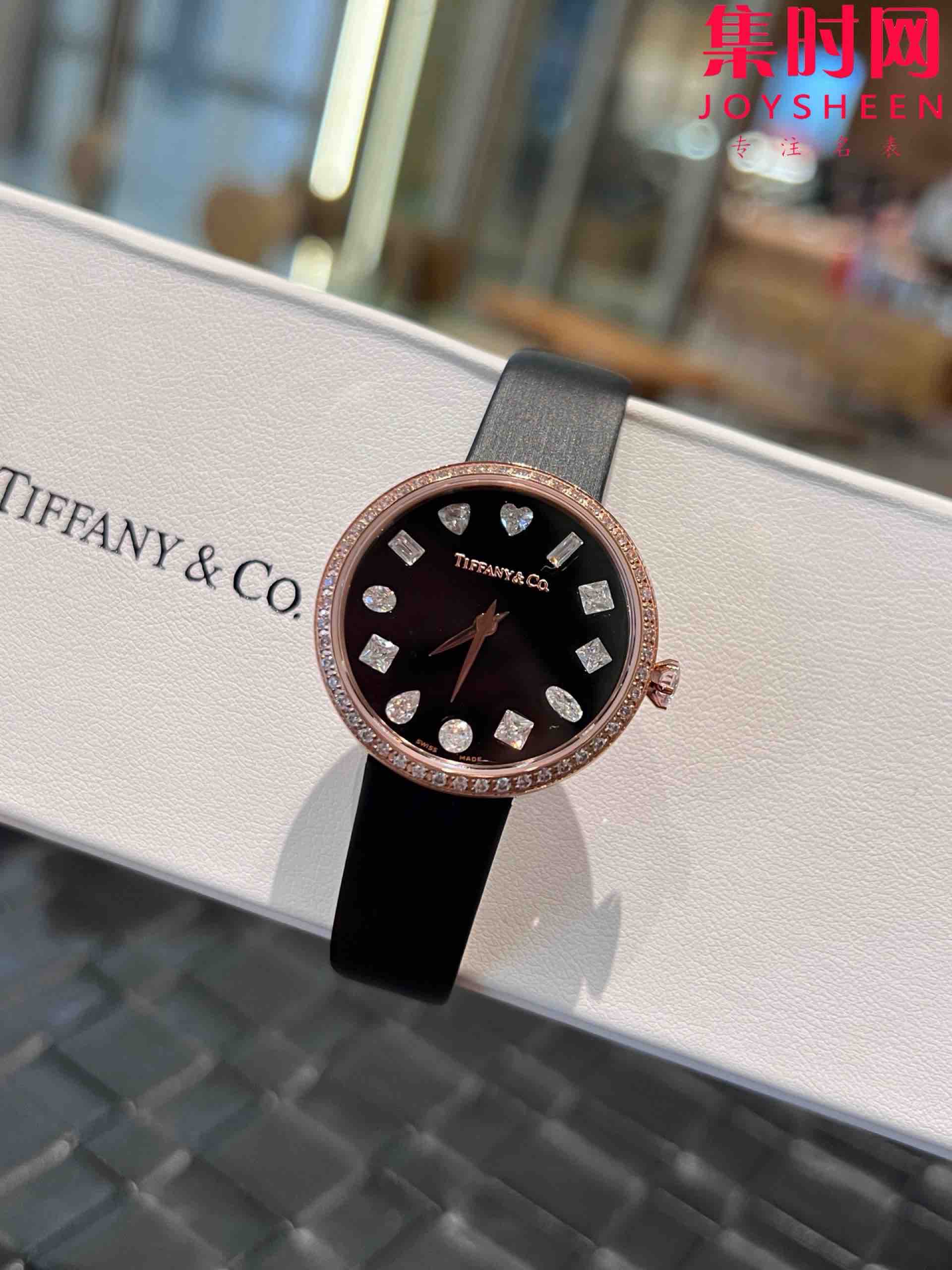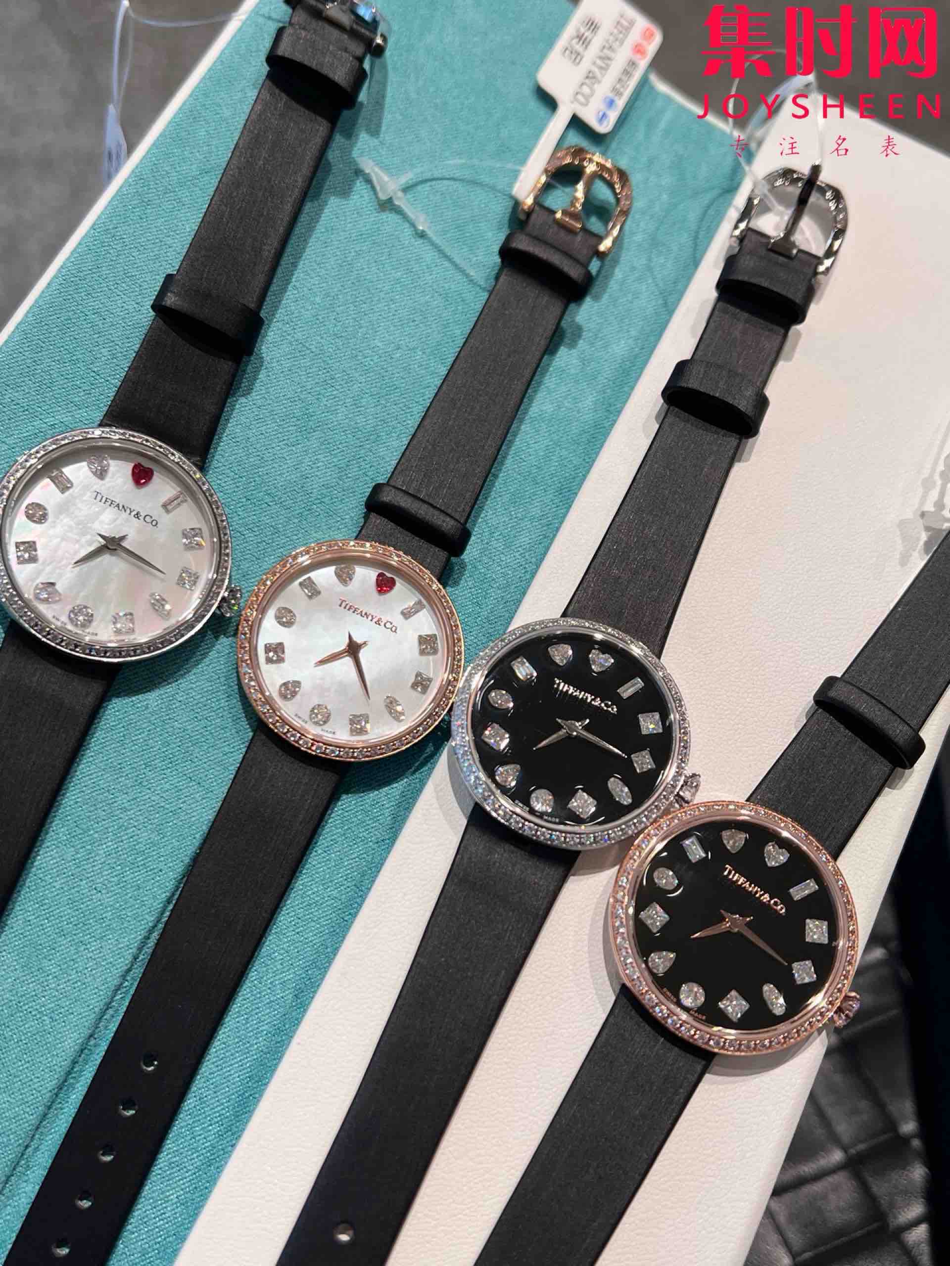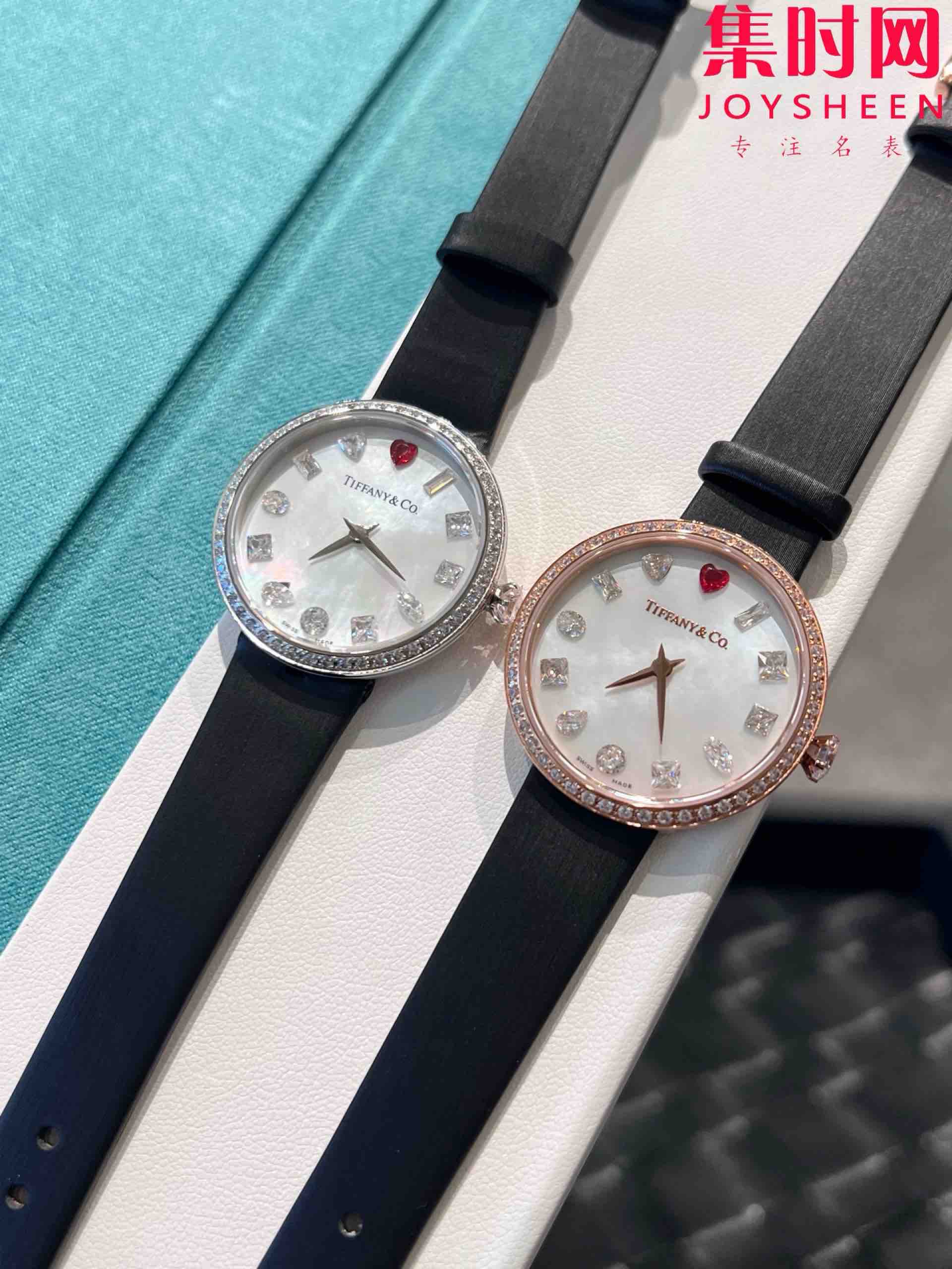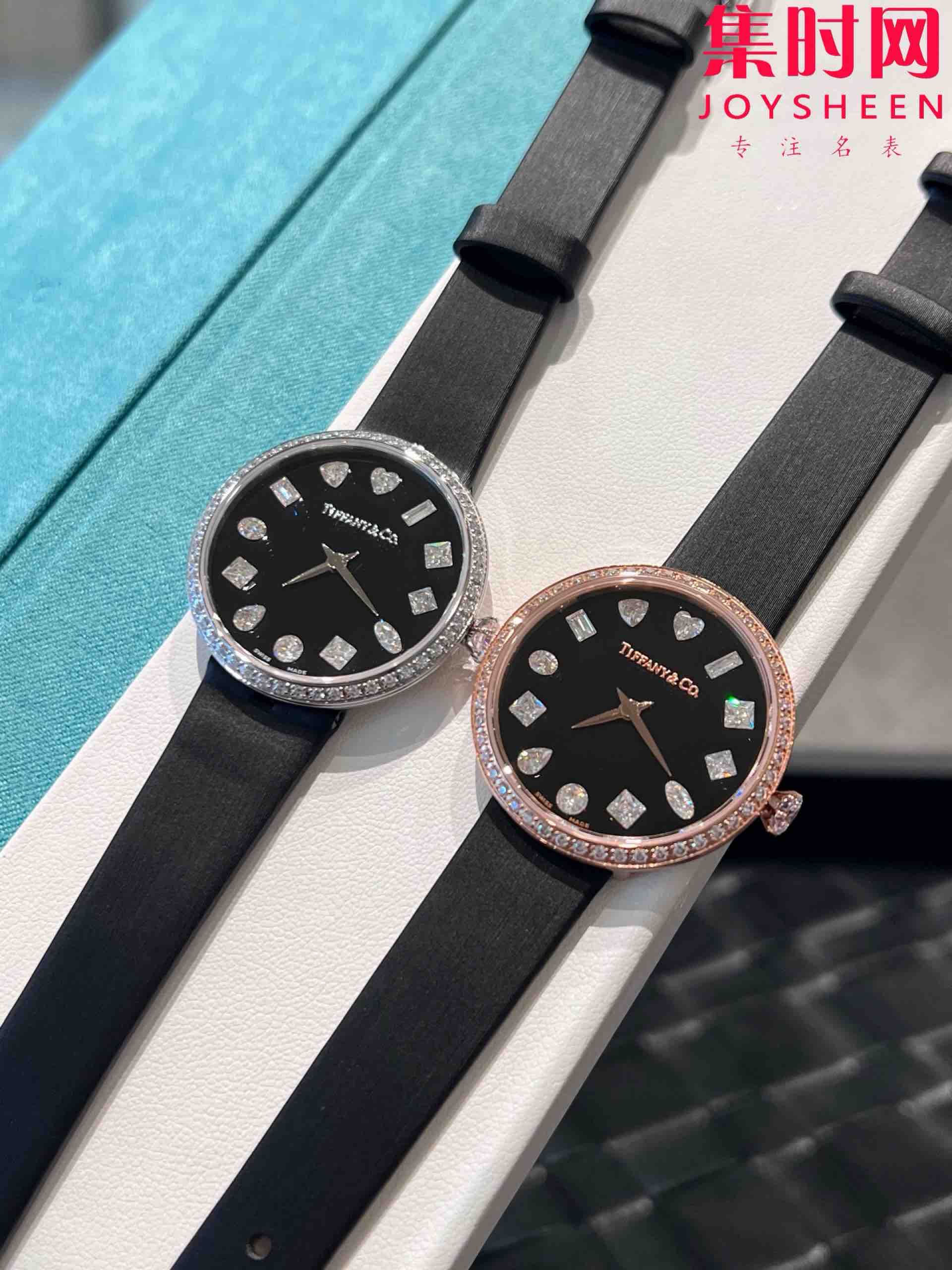 蒂芙尼新款 无始无终 唯有此时此刻 这款女士腕表的表盘设计灵感源自20世纪六七十年代的一系列蒂芙尼复古广告,每个时标分别镶嵌一颗采用不同切割方式的钻石,圆形漆层表盘点缀有12颗钻石,一次拥有所有精美切割形状的女士奢华手表 高强度蓝宝石玻璃镜面 搭配全新进口石英机芯 表壳尺寸32mm