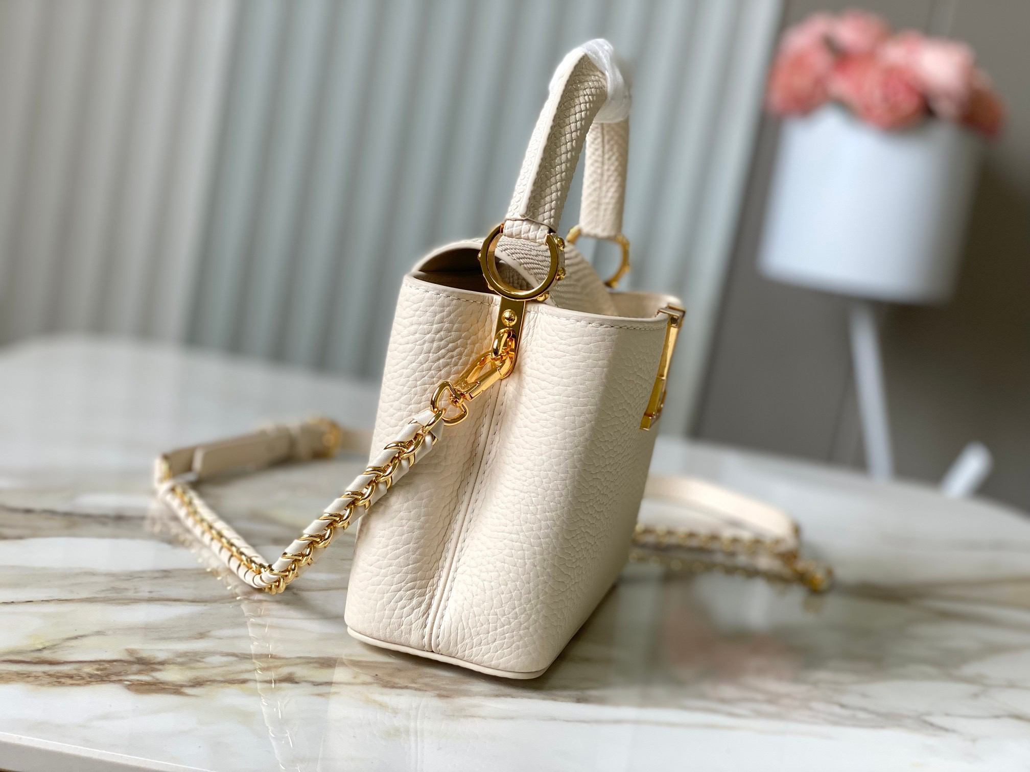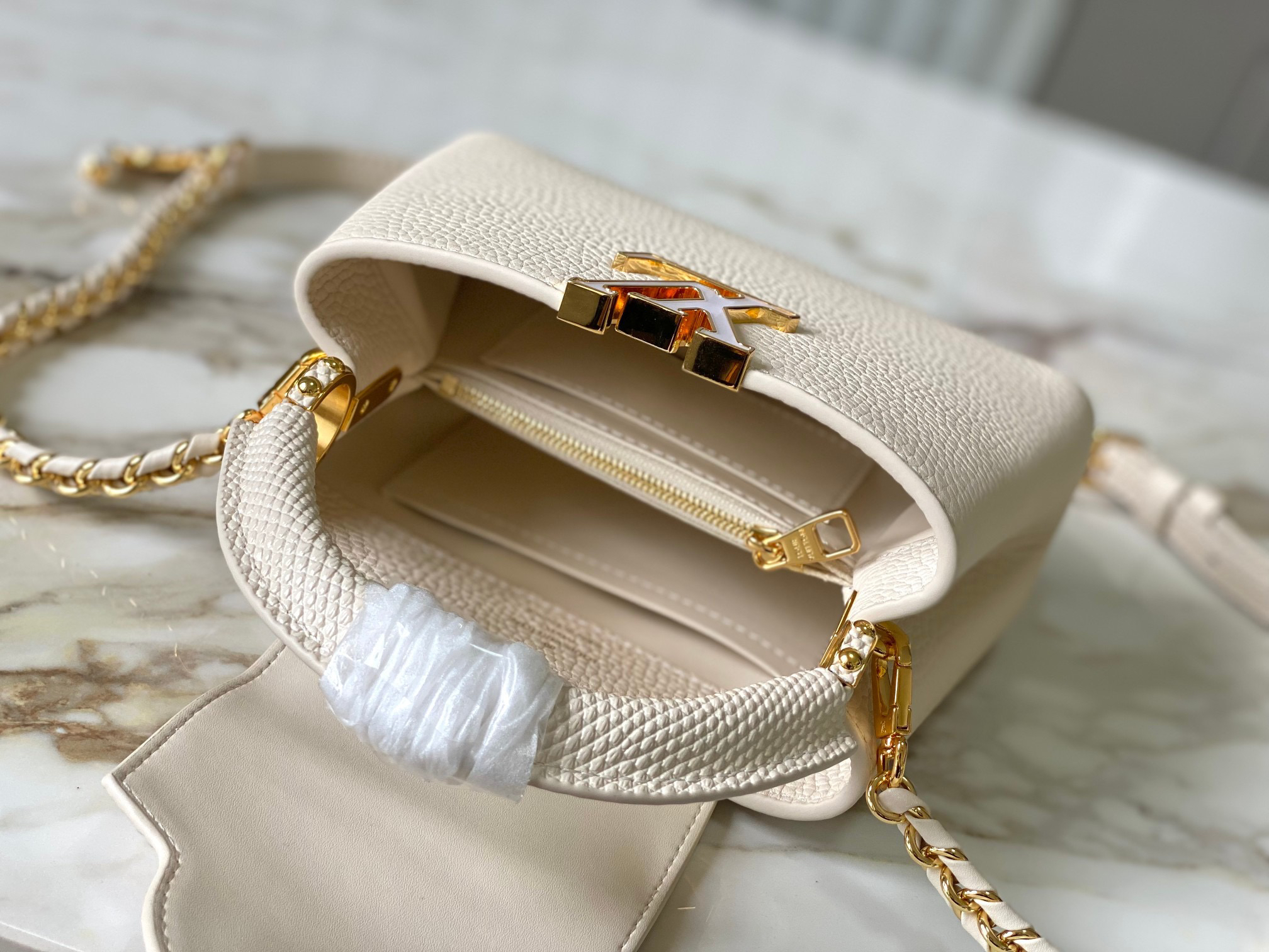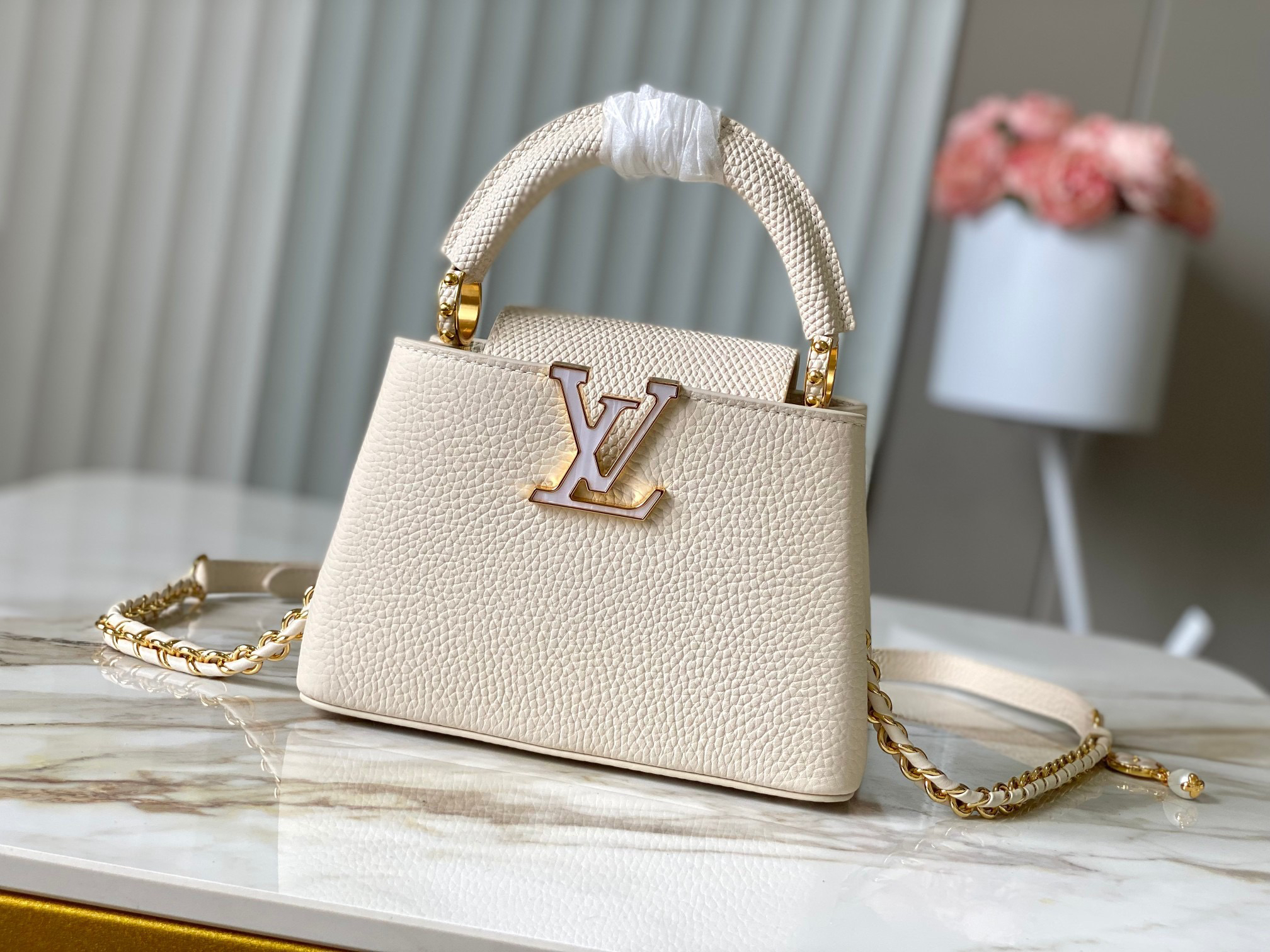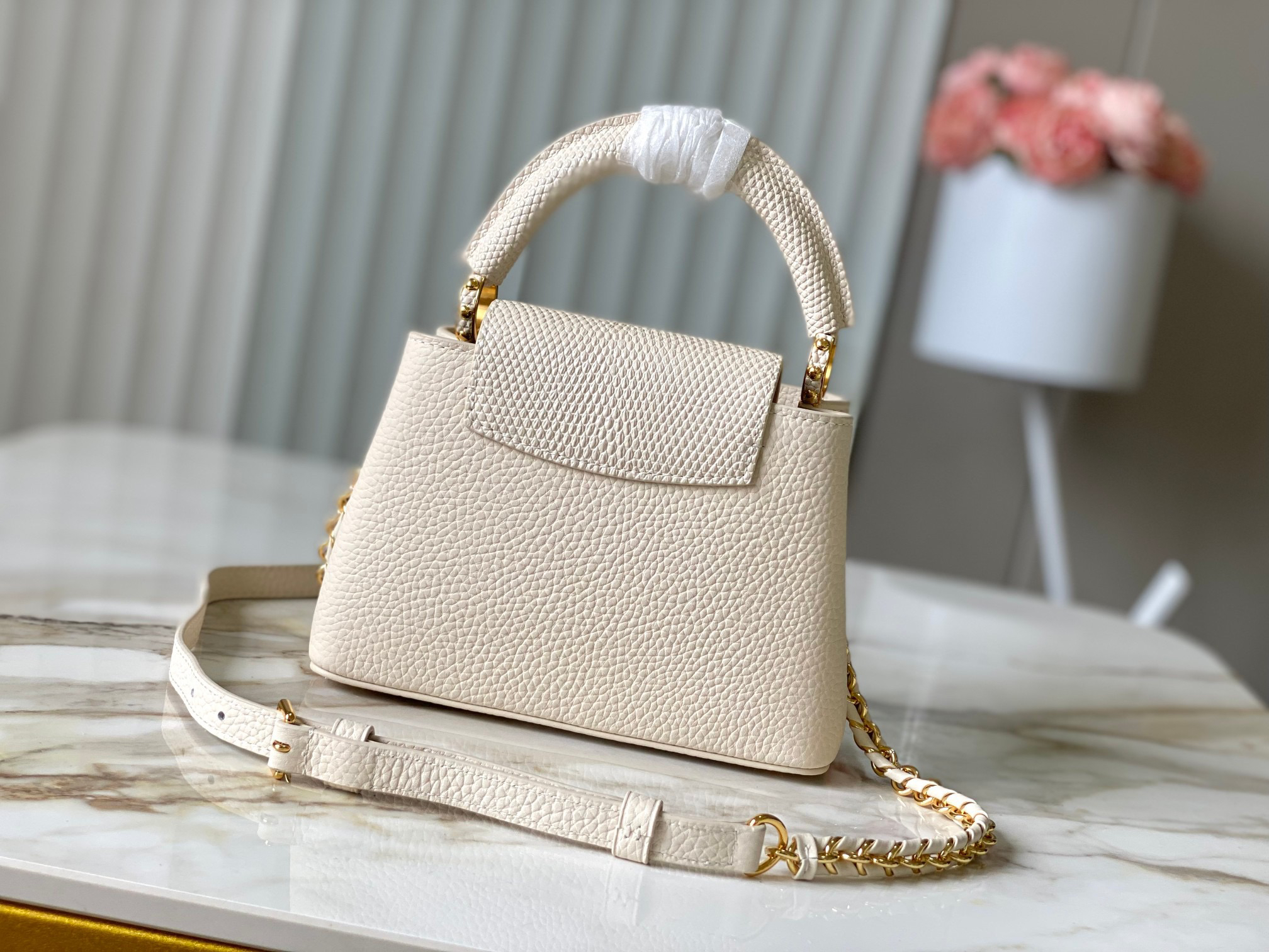 秋冬特惠💰1600 渠道级LV 新品 te级LV 动态芯片 M25611/M48865奶白蜥蜴贝母链条 本款手袋出自Capucines Daydream系列 为Taurillon 牛皮革浸染摩登色调 搭配贝壳质感元素、标志性LV字母和可拆卸编织链条 牛皮革和蛇皮革饰边营造撞色反差 翻盖提供外置或内收两式风尚 可轻松收纳短款钱夹和随行小物 Size : 21 * 14 * 8 CM