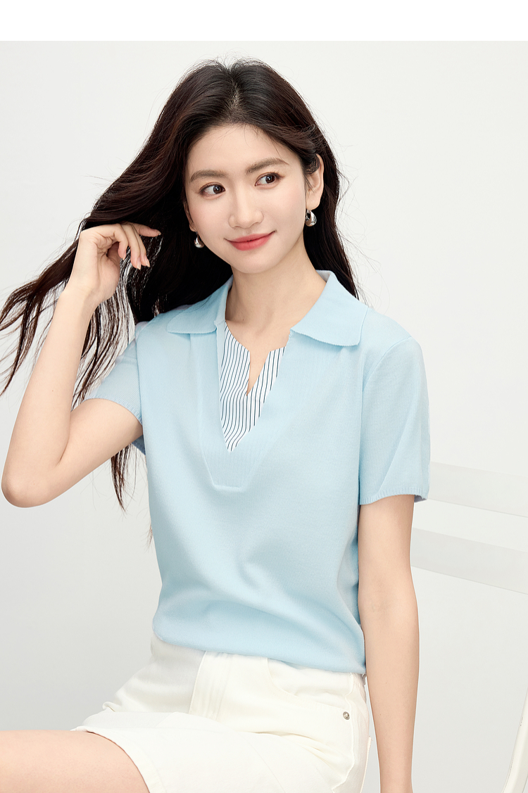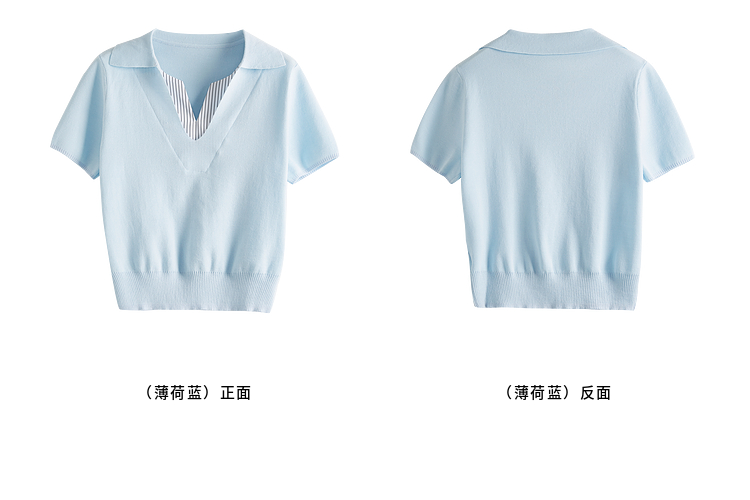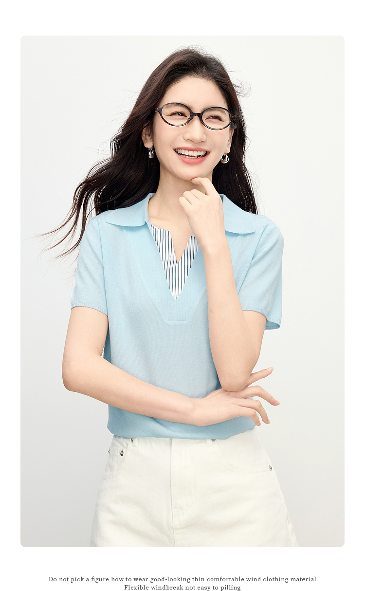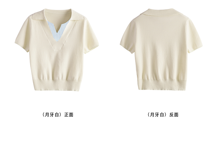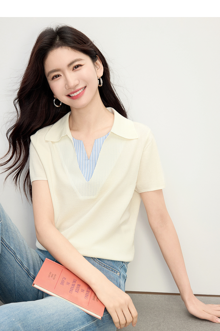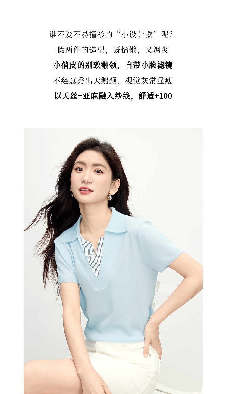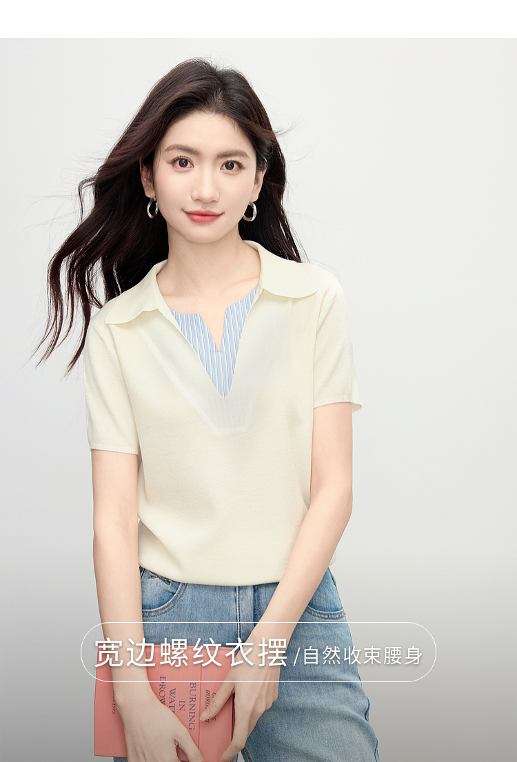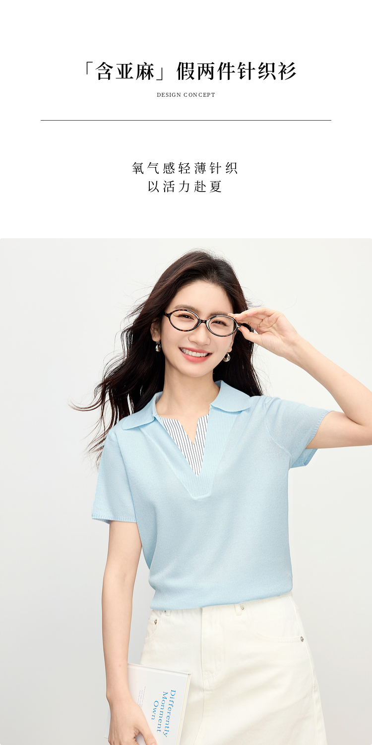 熙世界含亚麻假两件针织衫女短袖夏季薄款别致拼接条纹polo领上衣