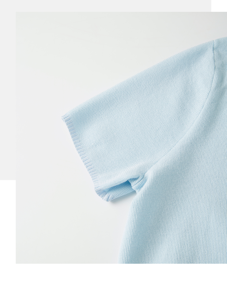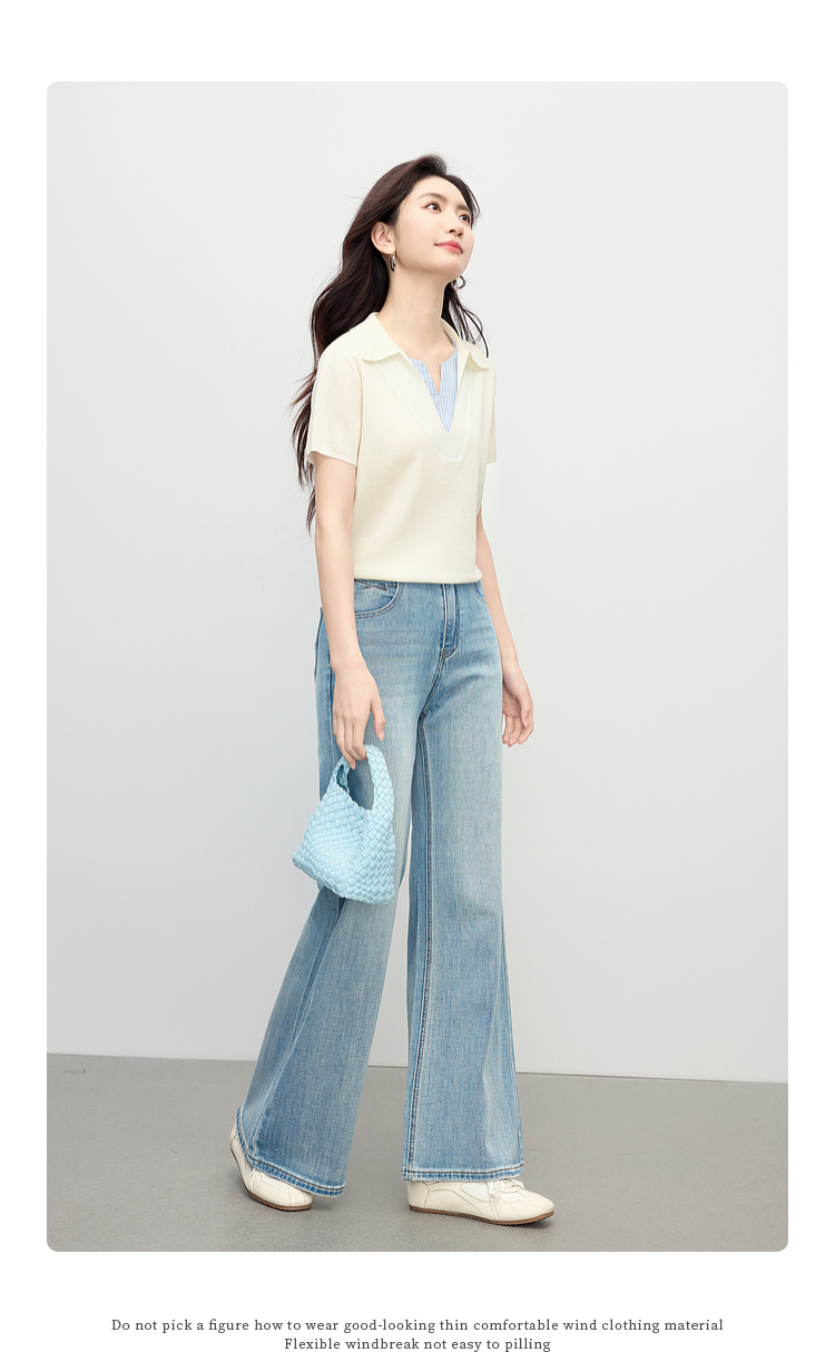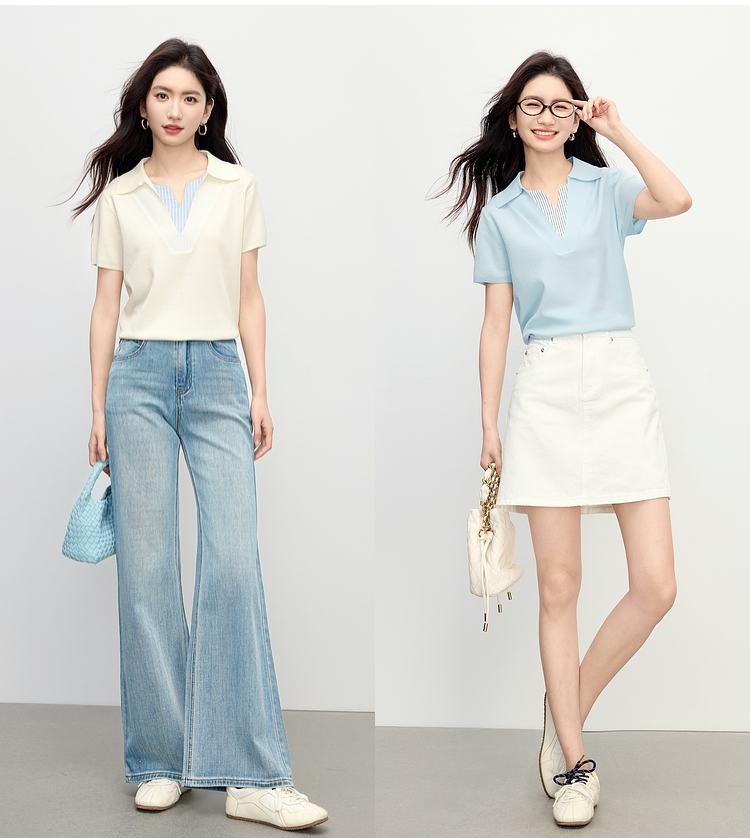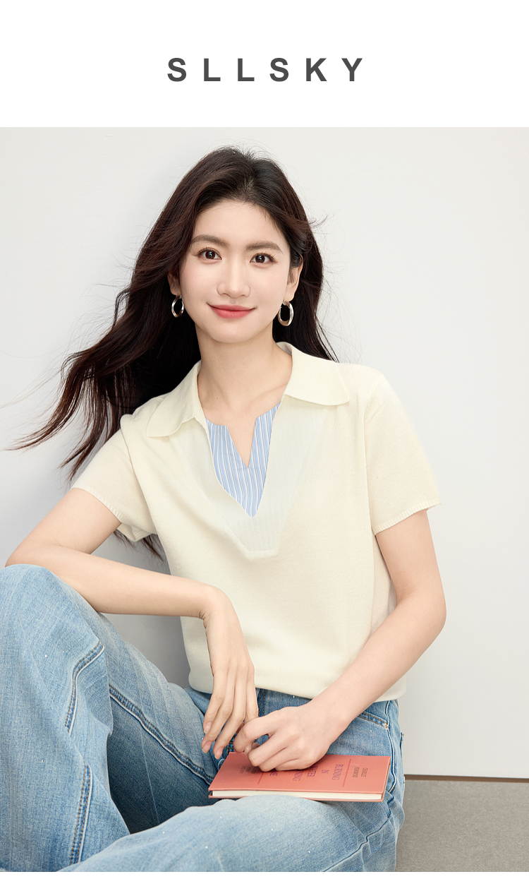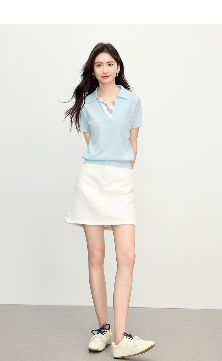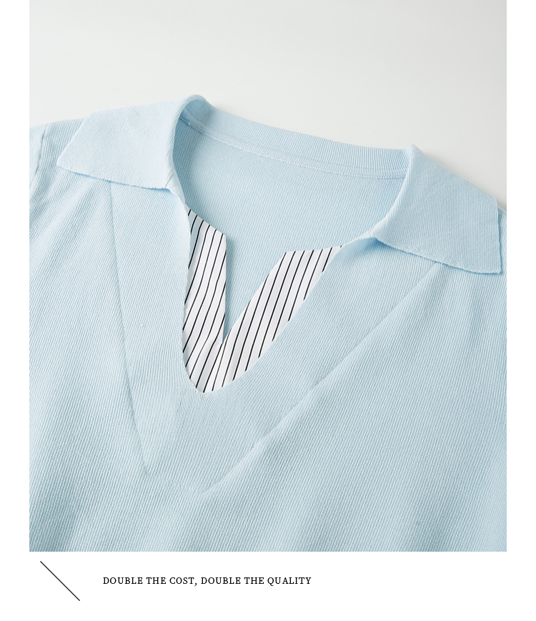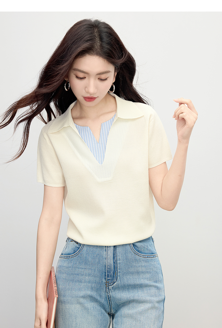 熙世界含亚麻假两件针织衫女短袖夏季薄款别致拼接条纹polo领上衣