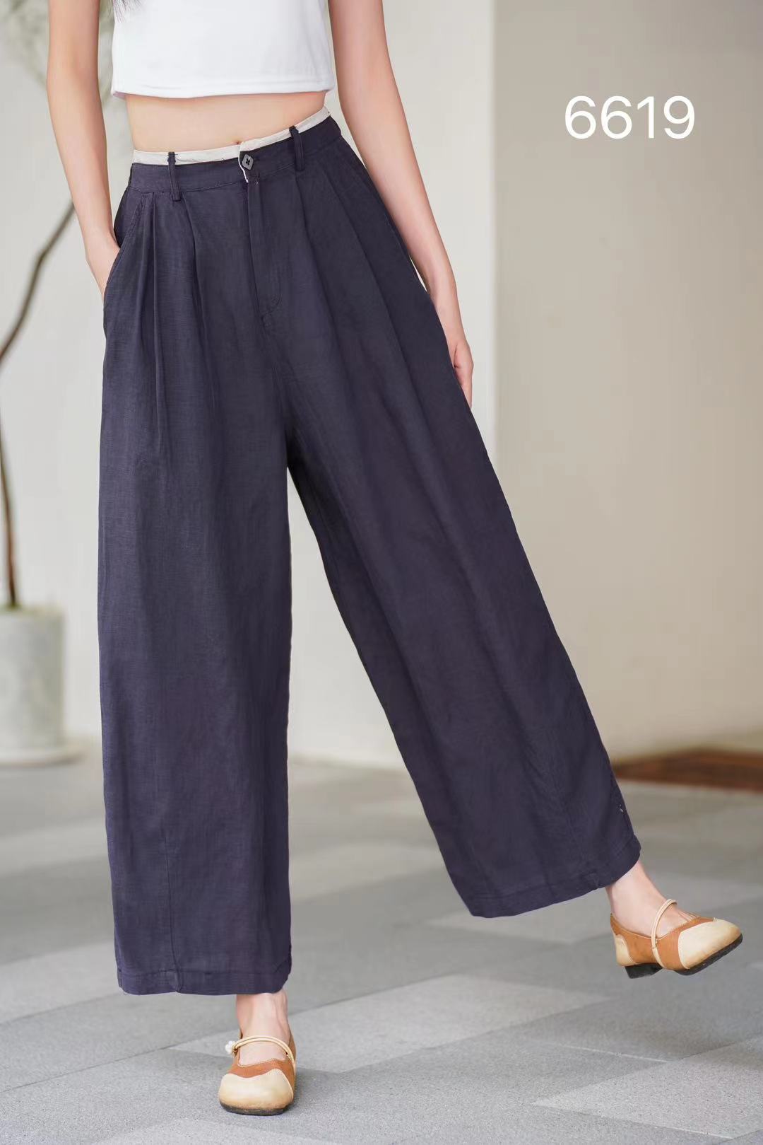 6619 黄 宝蓝 m l 春夏简约半松紧高腰亚麻 休闲裤宽松百搭显瘦长裤