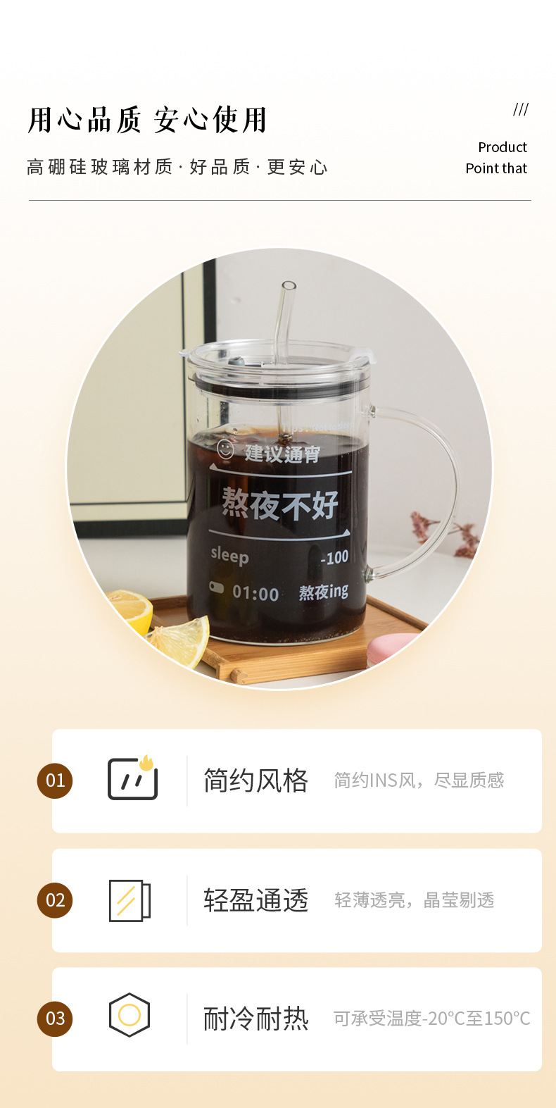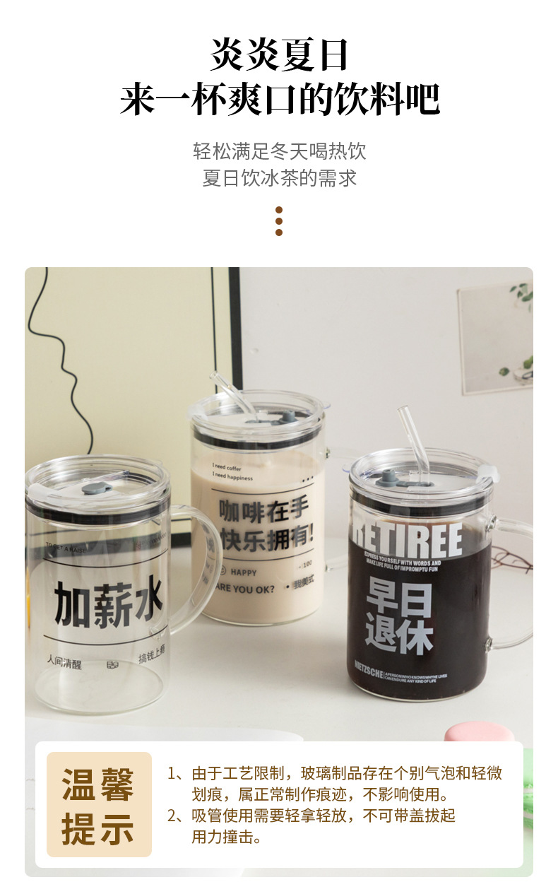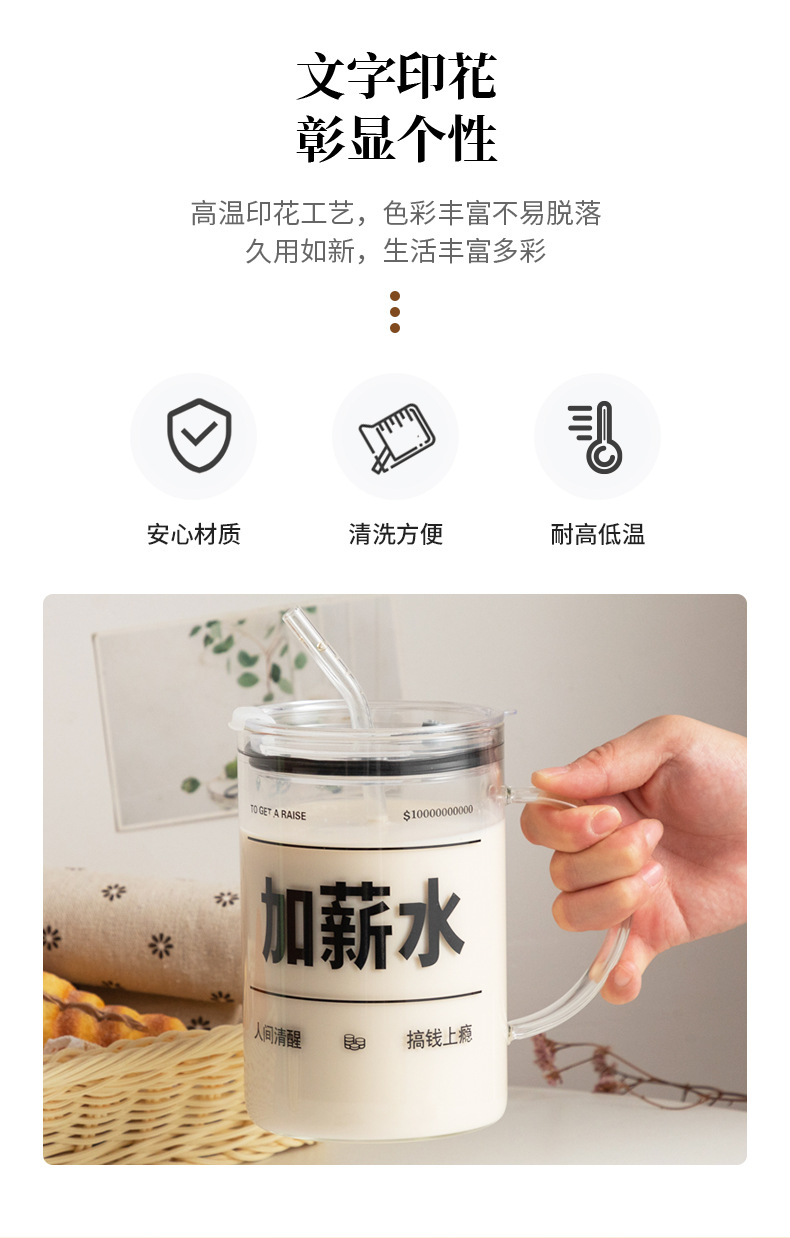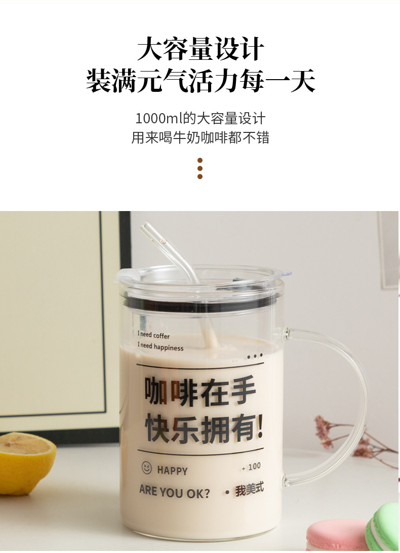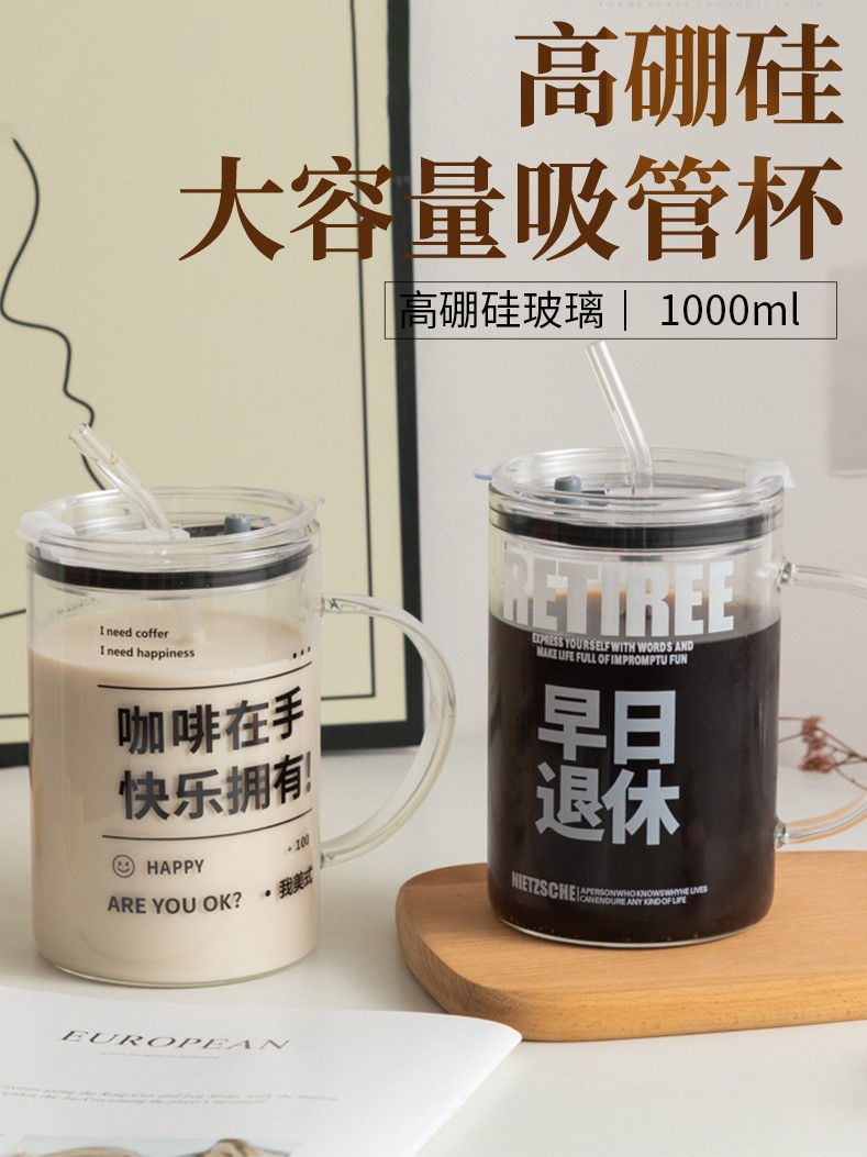【大容量吸管杯】1000ml玻璃杯子批發带手柄高颜值高硼硅大容量咖啡牛奶吸管杯带盖,带手柄轻松拿取,牛奶、咖啡等多种饮品可装,吸管杯盖一应俱全。ry
