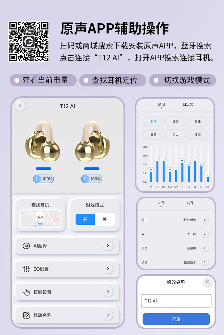 ✅连接耳机/使用AI翻译的操作 ◼ 扫码或商城搜索下载安装【原生APP】 ◼ 蓝牙搜索点击链接T12 AI,打开APP右上角+号搜索链接耳机 ◼ 点击已连接的耳机,进入操作界面 ◼ 查看电量/查找耳机定位/切换游戏模式/AI翻译/EQ设置/按键设置/修改名称等功能 它搭载了人工智能大模型的耳机 就像一个智囊团!耳机实时语音翻译 手机上还会实时显示翻译文字 看没有字幕的演讲、访谈不再抓瞎