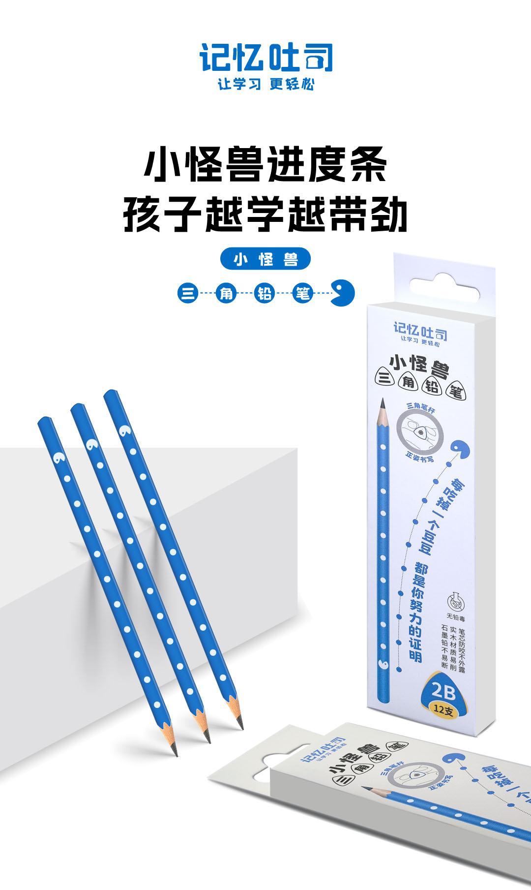 【商品名称】记忆吐司小怪兽三角铅笔 【包装规格】HB12支+2B12支 【发货时效】72h内浙江发货 【物流说明】新疆、西藏不发货 【售后说明】1.商品不影响二次销售的情况下,支持7天无理由退换,运费自理,并承担寄出运费;2.质量、缺件问题请签收后48小时内反馈请拍下【实物图+含快递面单的包裹图】,过期无法为您处理喔;3.快递送货外观有严重破损的请拒收;4.快递一经发出,不接受任何理由的拦截、拒收! 特别提醒:物流异常问题,比如无信息更新、退件等,请于发货后1个月内反馈,超过1个月不做处理! 注意:自用户签收之次日零点起7天内: 使用过程中,非人为损坏,产生的产品质量问题,消费者要求退换货,并提交客服确认,在售后确认通过后7天内邮寄,超过时间不予处理。