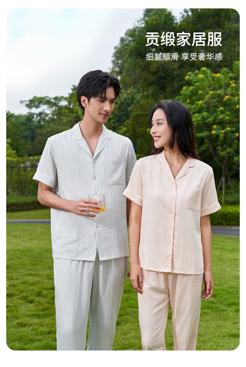 【商场同款】熳洁儿 情侣家居服贡缎方格女士夏季开衫短袖长裤套装24203007/24203907