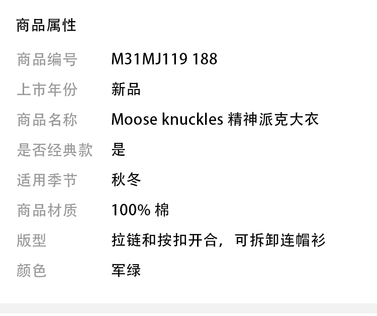 MOOSE KNUCKLES 男士金属驼鹿指关节徽标绗缝连帽羽绒服 军绿色 M31MJ119 188