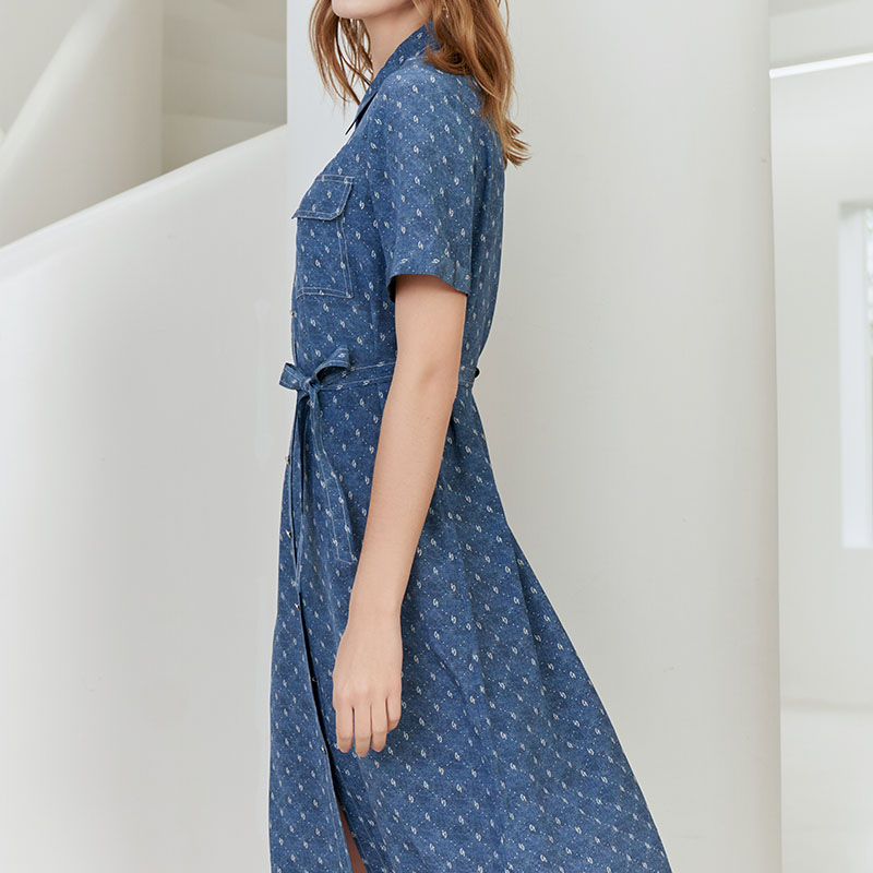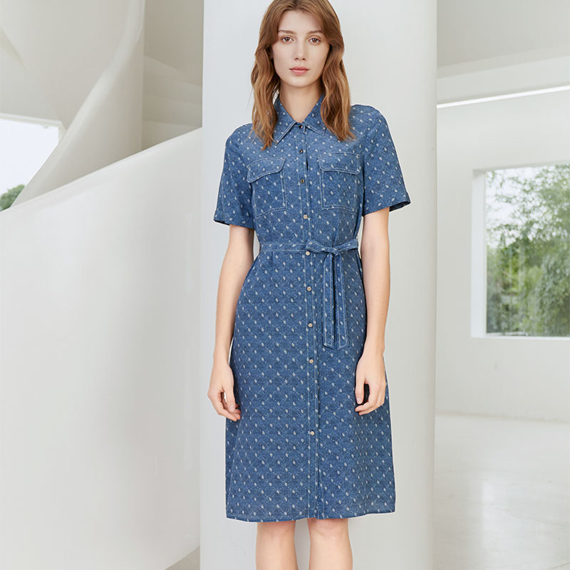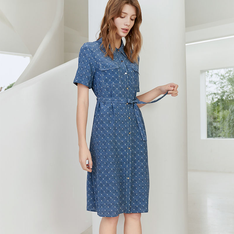 【100%桑蚕丝衬衫款连衣裙】23年夏季新品女士中长款连衣裙时尚系带衬衫裙