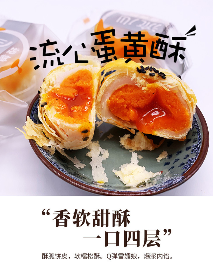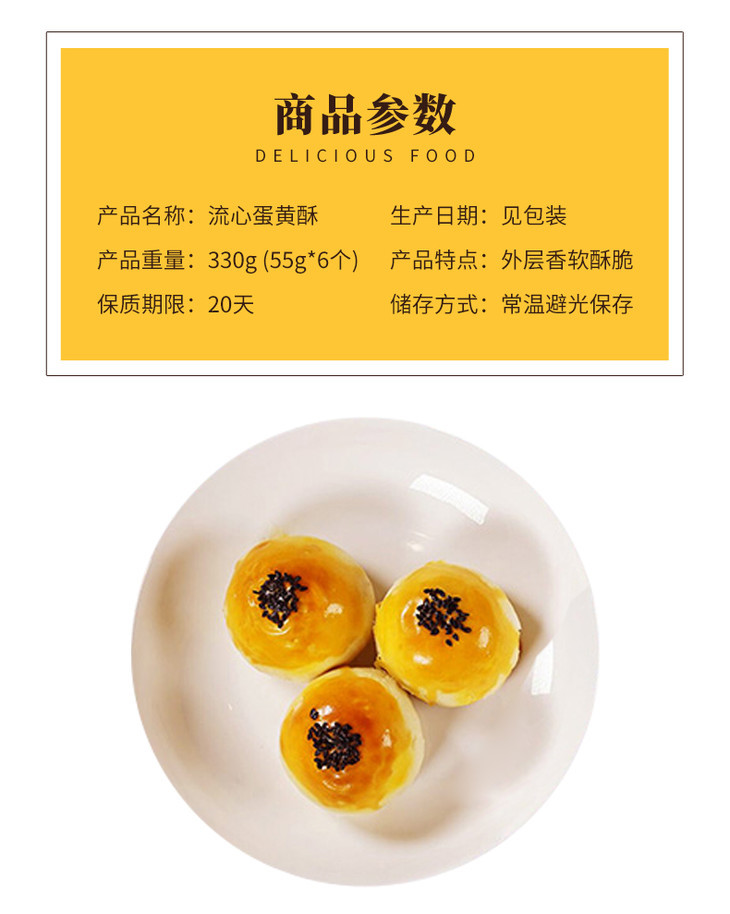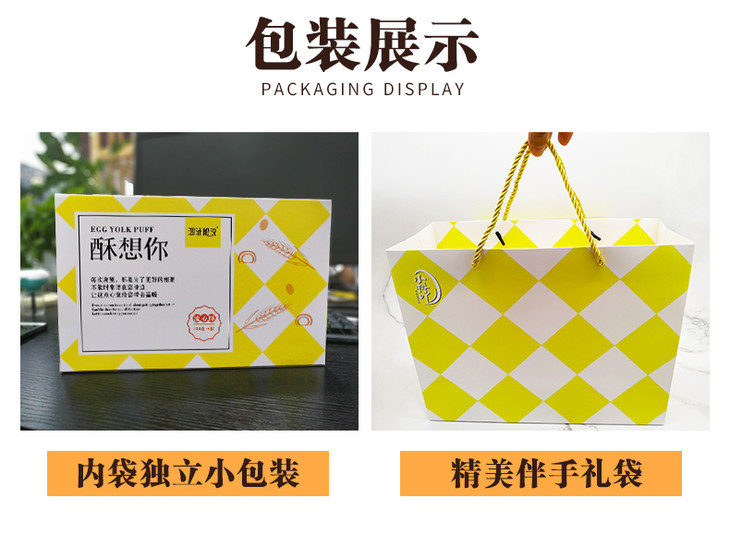 【产品规格】蛋黄酥普通装1盒(每盒6枚,55g/枚),蛋黄酥手提礼品装2盒(每盒6枚,55g/枚)(每份都是独立的包装,如购买多件分多个包裹发出,可能会前后陆续到货)。