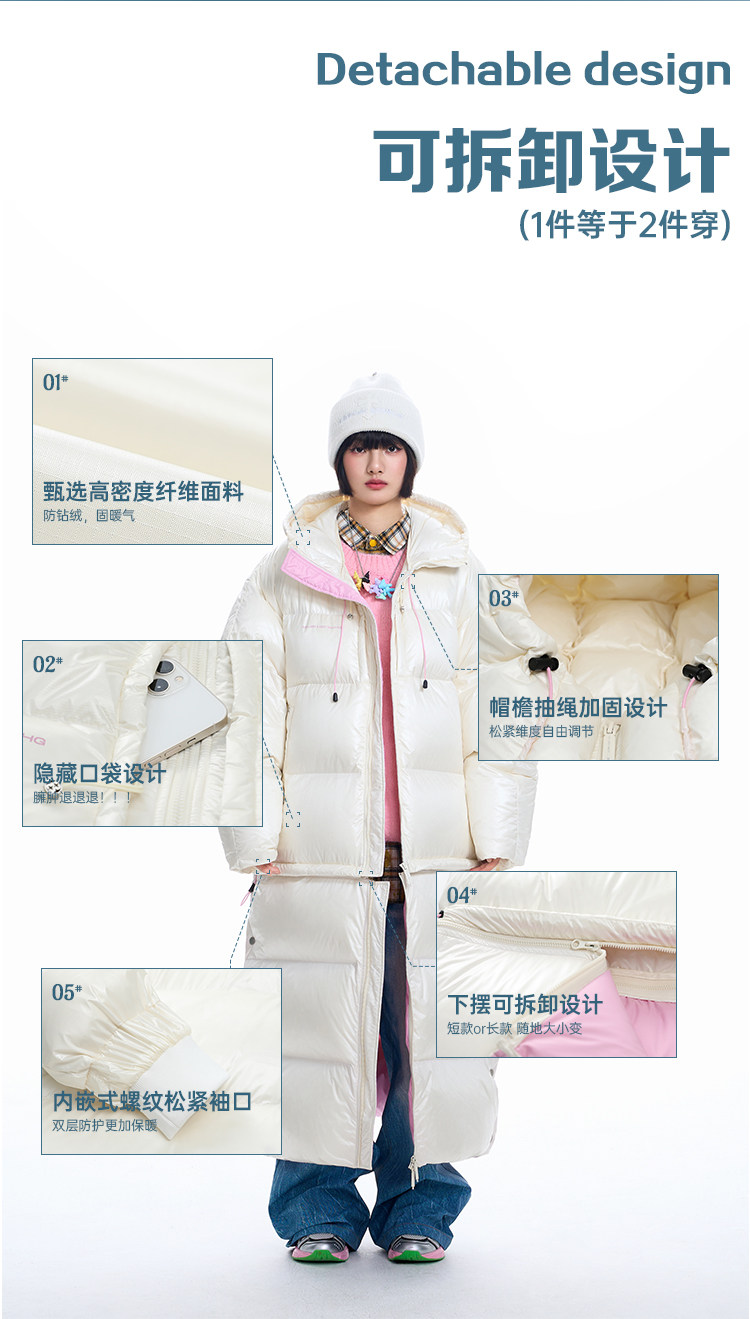 BJHG不计后果可拆卸白鹅绒长款羽绒服男冬季潮牌宽松加厚情侣外套