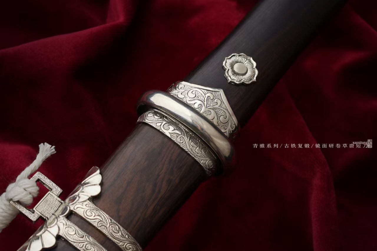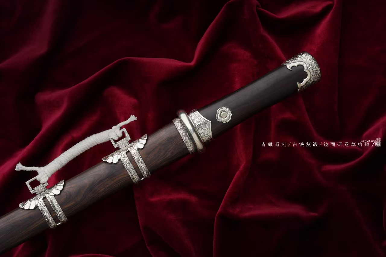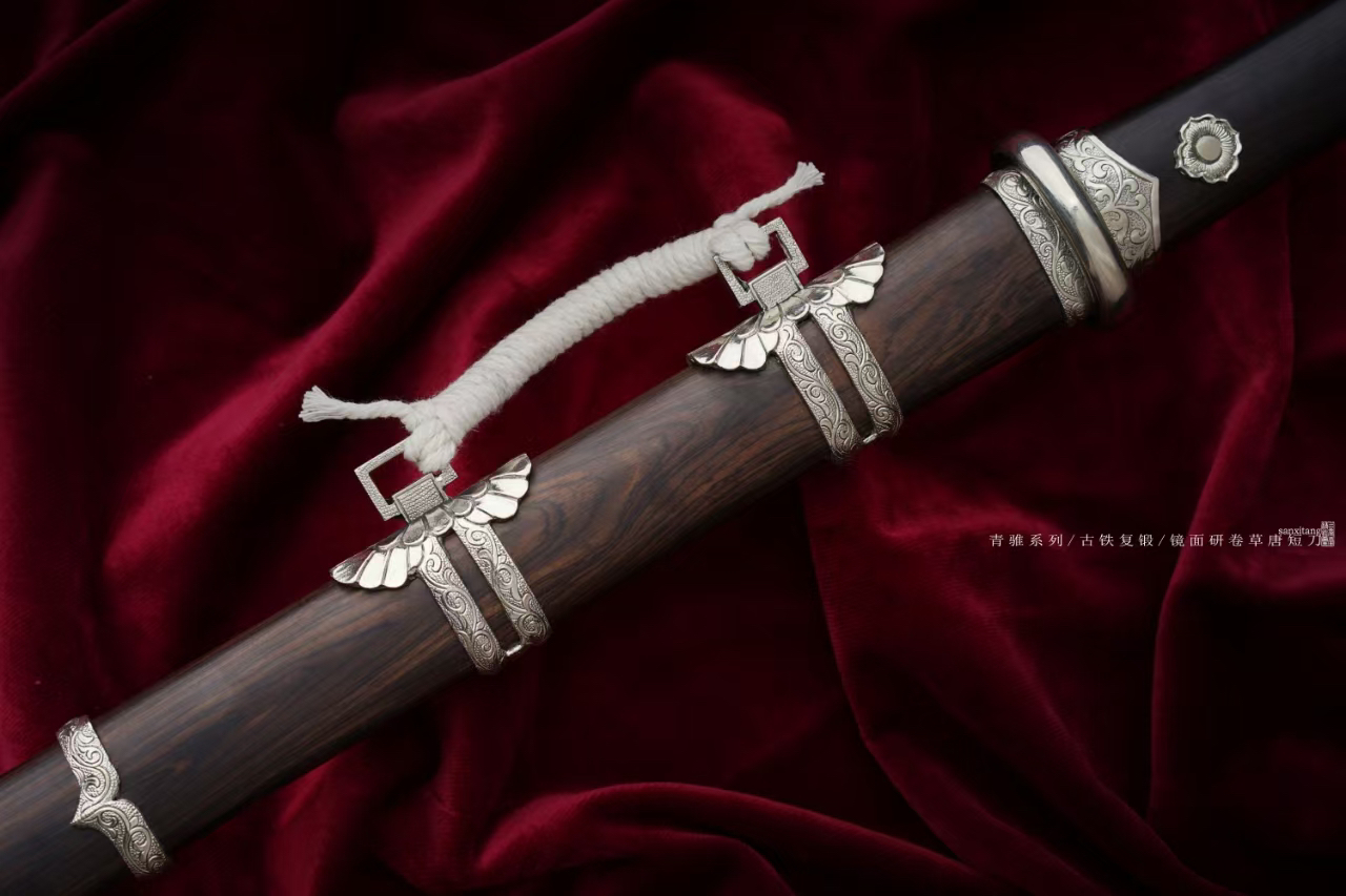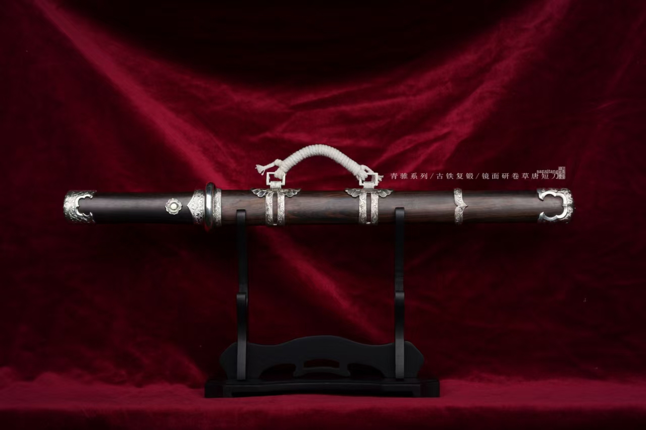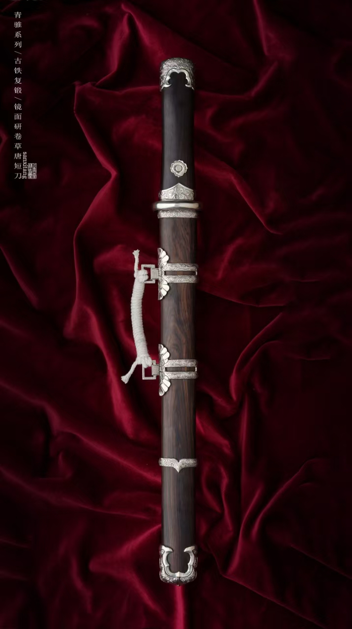 今年是回归传统作品的一年,给大家的价格都会到比较低,希望能有更多人体验。陨铁锻打在刀剑里面有着特殊地位,天外来物,自古以来人类就用它锻造兵器。例如大名鼎鼎的埃及图坦卡蒙法老匕首,流失海外的铁刃青铜钺和铁援青铜戈,现藏于美国华盛顿弗里尔美术馆。还有国家博物馆的商代青铜钺。陨铁材料比较贵,混合锻打工艺复杂,所以价格一直高居不下,刀剑本身是文化产业,应该让更多人了解解除,所以我们一直在研究怎么能在低价格的作品上用上陨铁锻打。现在终于突破了技术,首先尺寸缩小,做了一把比较经典的小唐刀,全长大概50。这里面加了一点陨铁,然后混合其他材料一起锻打,尽量展现出了加入大量陨铁锻打后钢的效果,既保证了效果又有极高的性价比,非常推荐大家入手。仍然搭配了三希堂核心研磨工艺,在灯光下一丝丝细纹洁白圣洁,刃部研白,柔顺和冷艳并存,高级感十足。白铜雕唐卷草金具,复古处理,做了一点内包的造型,质感提升不少。用了实打实的黑檀木,阴干两年以上,性能稳定,花纹自然,没有任何染色之类的操作,虽然成本高一些,但是也值得。这只作品大家喜欢的可以入手,自己玩或者送人都合适[合十][合十]