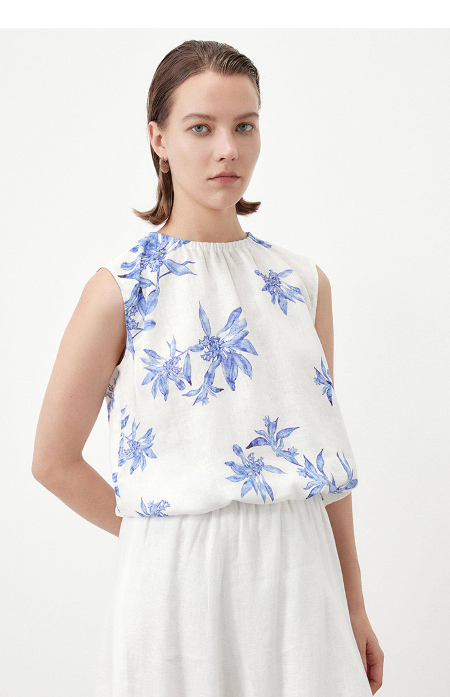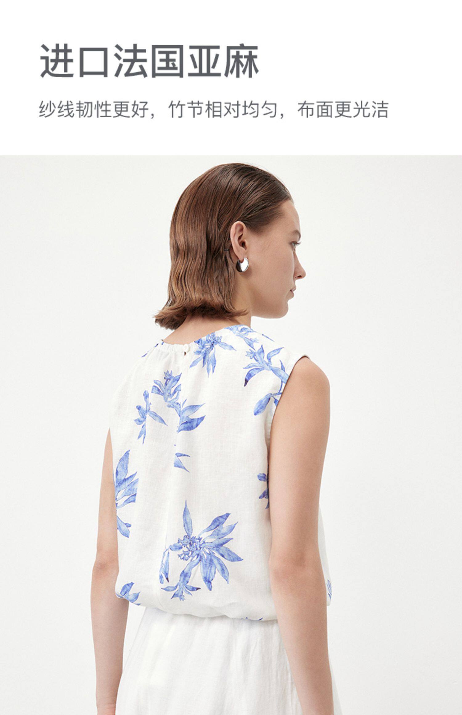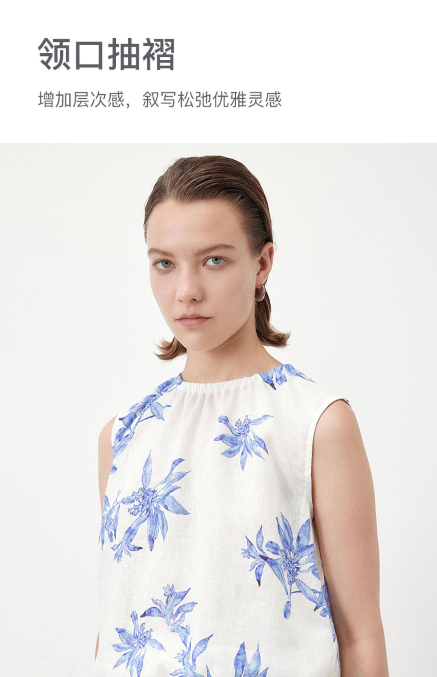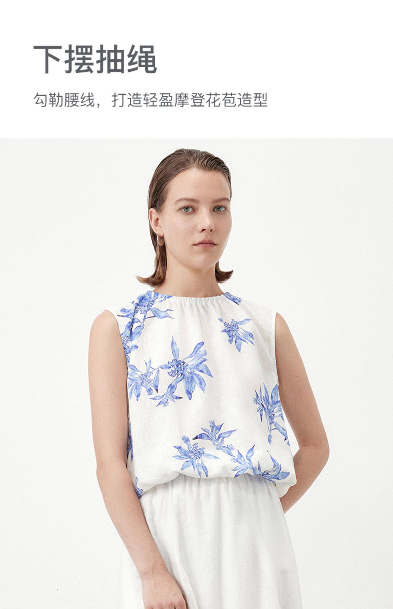 Marc O'Polo/MOP夏季新款好看植物印花亚麻打褶无袖背心女士上衣