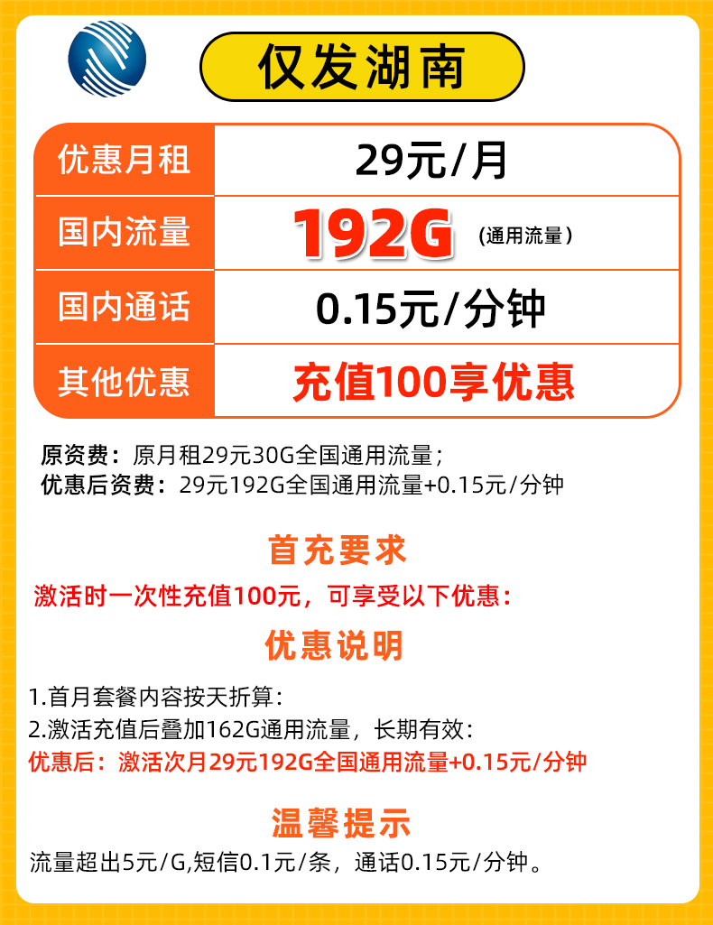 【仅发浙江】电信19元145G+300分钟 29元205G+300分钟