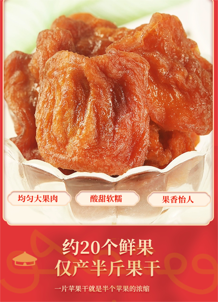 1.苹果干由于配料表干净简单,果干放久颜色会变深,不影响食用。