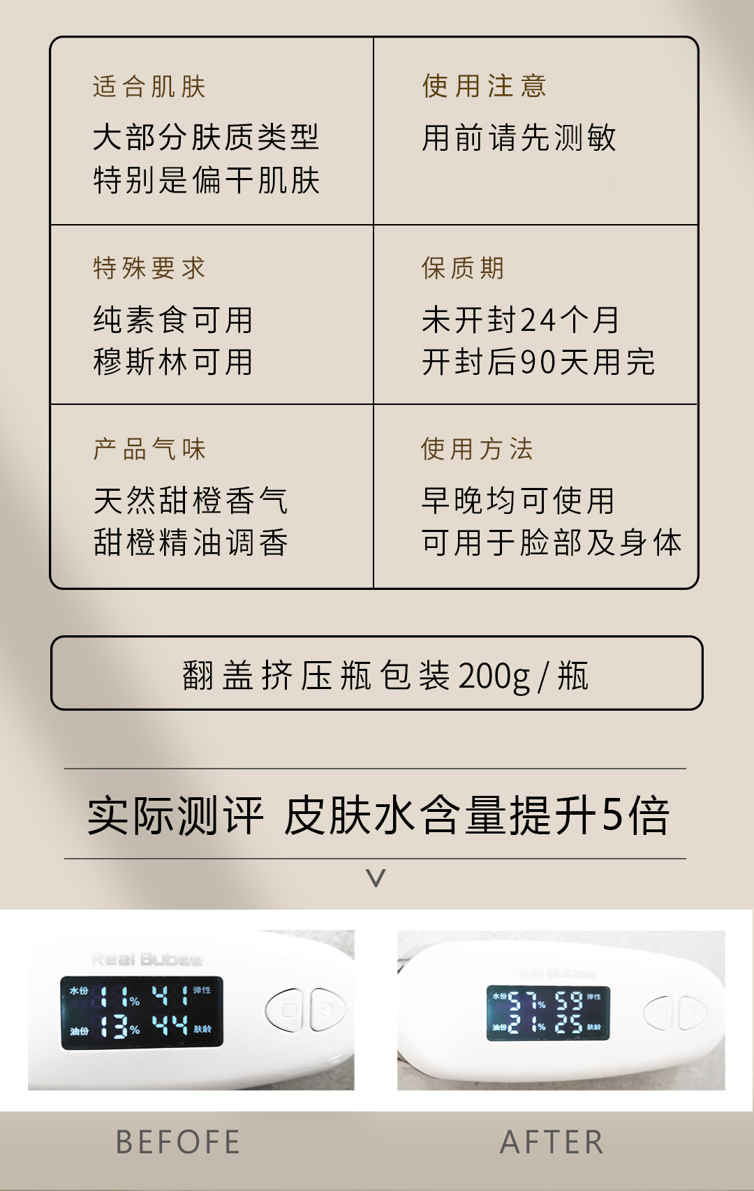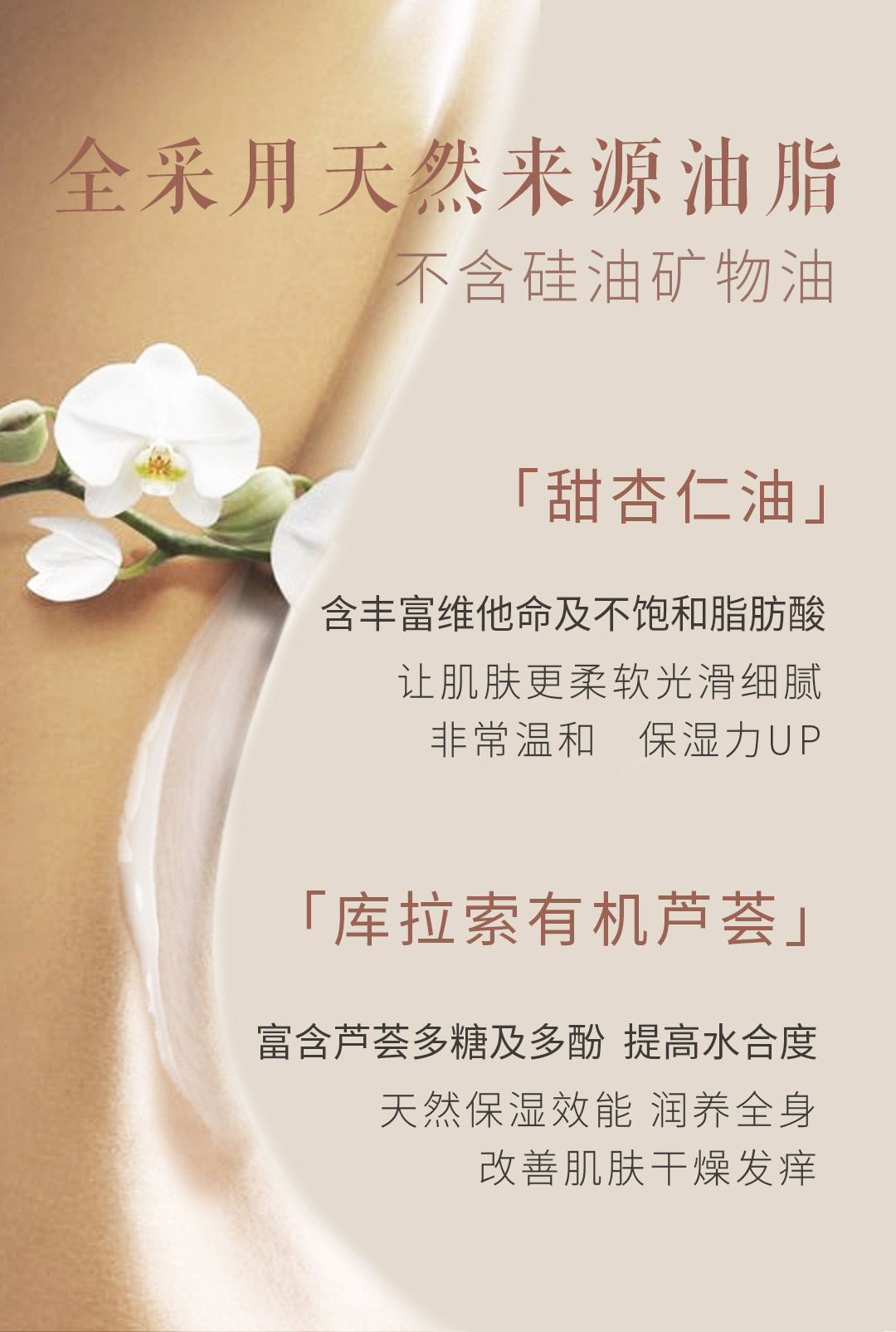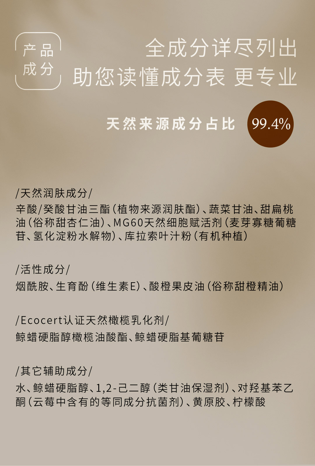 【规格】200g/瓶 【全成分表】水、辛酸/癸酸甘油三酯(植物润肤酯)、蔬菜甘油、甜扁桃油、烟酰胺、Ecocert认证橄榄乳化剂(山梨坦橄榄油酸酯、鲸蜡硬脂醇橄榄油酸酯)、Ecocert认证小麦乳化剂(鲸蜡硬脂醇、鲸蜡硬脂基葡糖苷)、生育酚(维生素E)、麦芽寡糖葡糖苷、、酸橙果皮油(俗称甜橙精油)、氢化淀粉水解物、1,2-己二醇(类甘油多元醇保湿剂)、对羟基苯乙酮(云莓中含有的等同成分抗菌剂)、有机库拉索芦荟叶汁粉、黄原胶(植物凝胶)、柠檬酸 【生产日期】见包装 【保质期】见包装 【贮存方法】见包装 【适用范围】成人、青少年均可作为面部或身体乳使用 【使用注意】首次使用前请先测敏