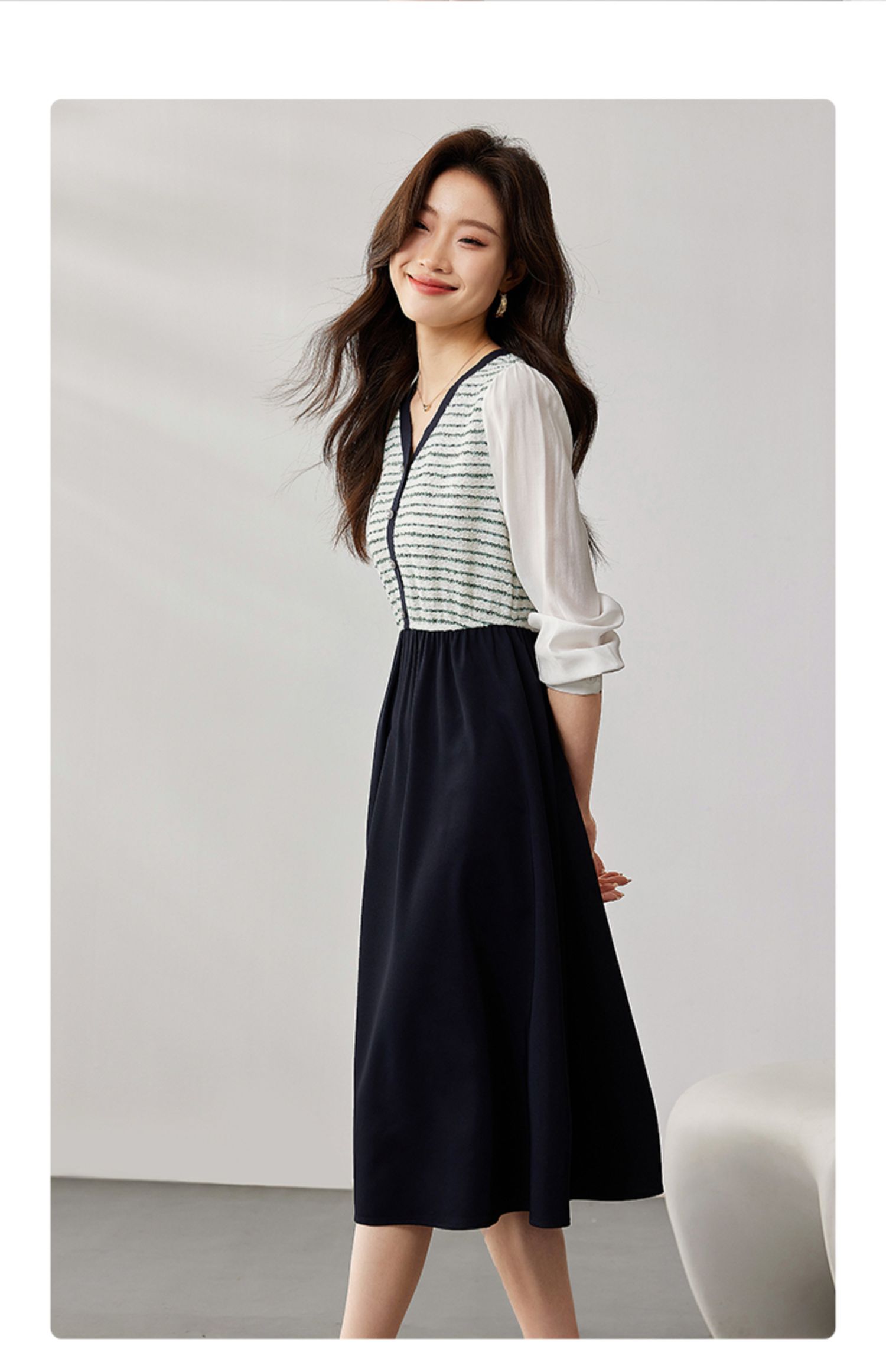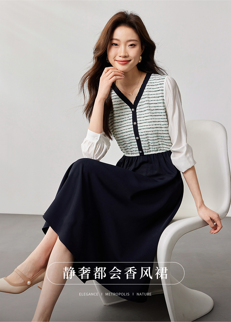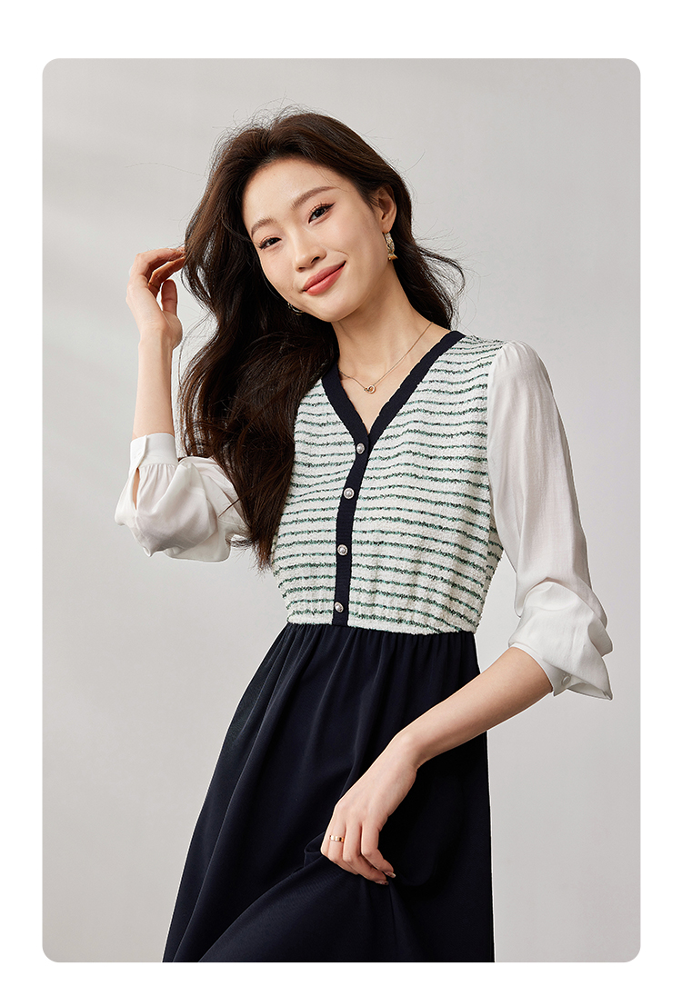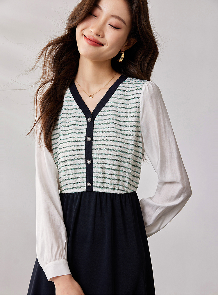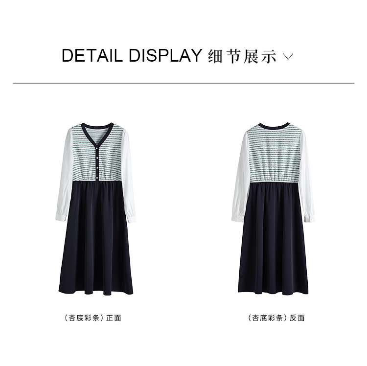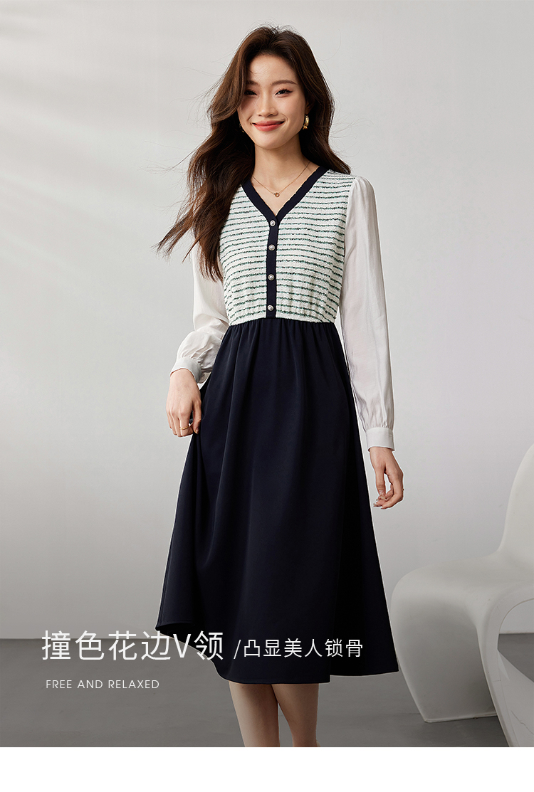 【129选3件,不退换】熙世界假两件条纹V领连衣裙女2025秋新款时尚长袖小香风a字裙子