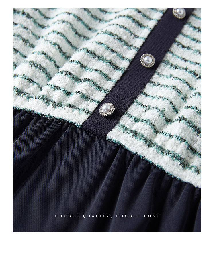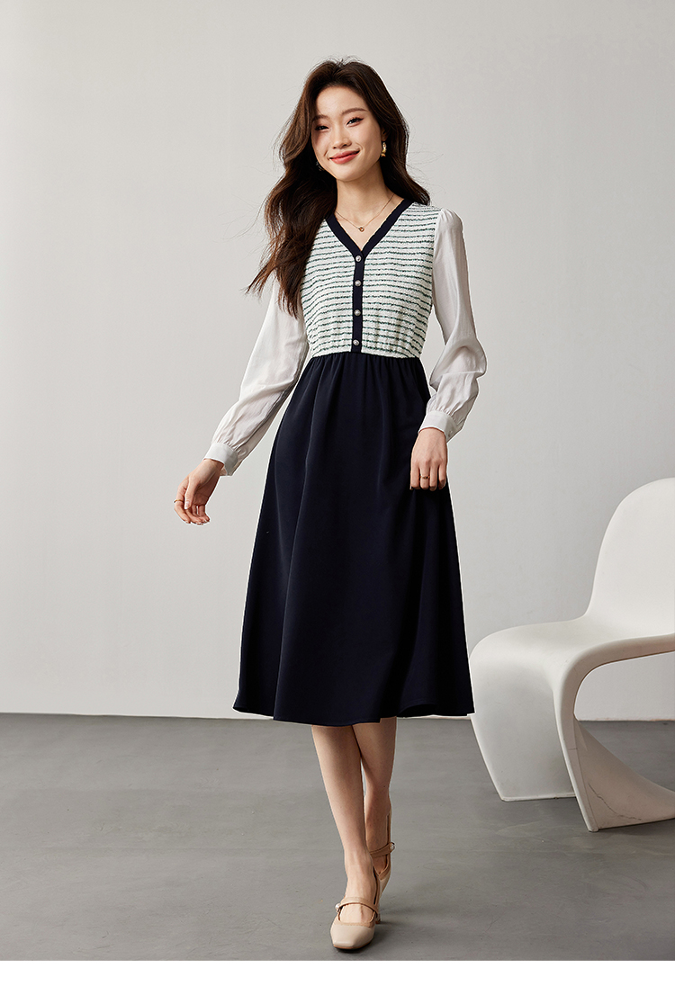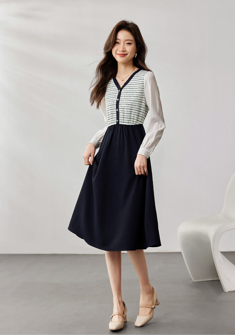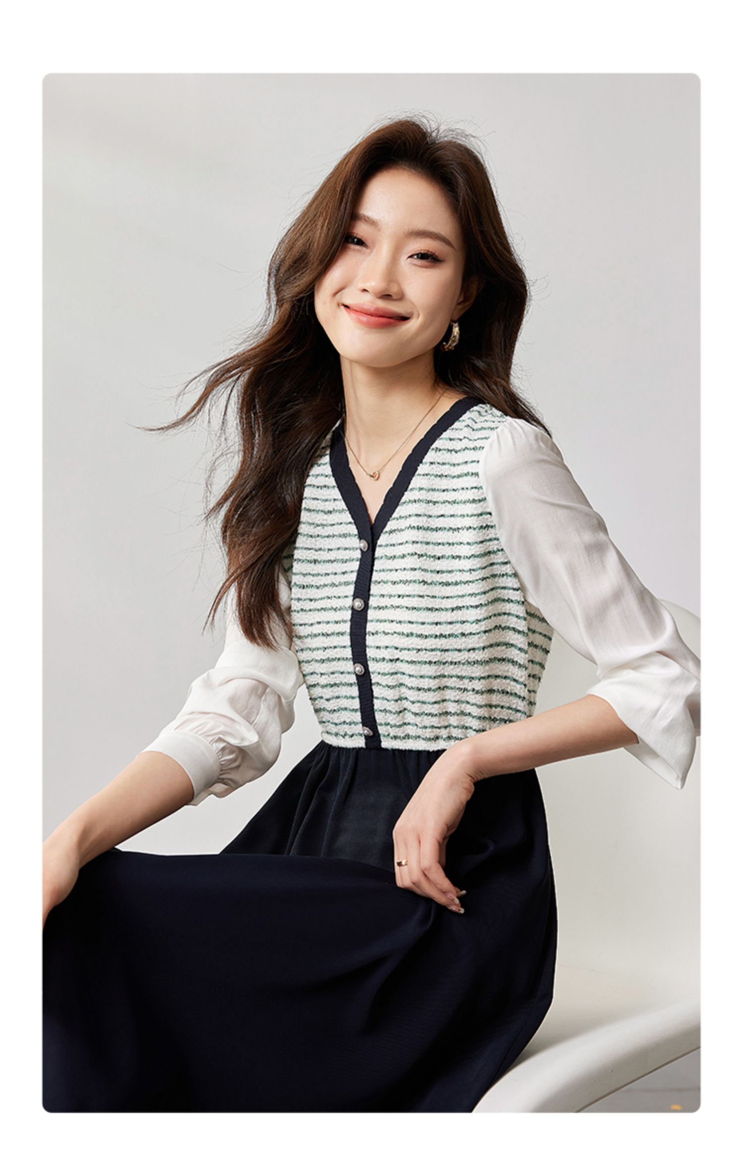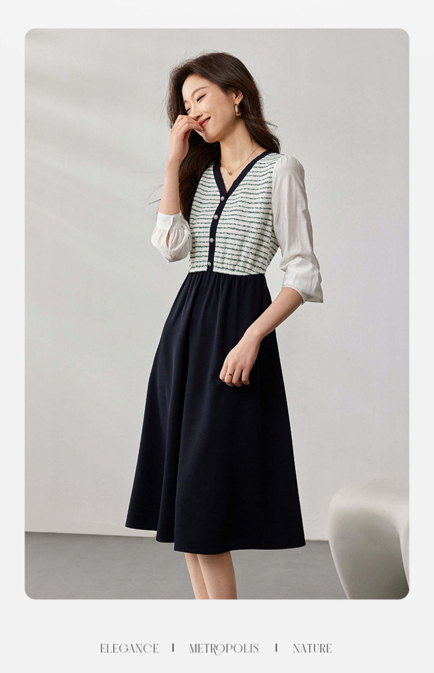 【129选3件,不退换】熙世界假两件条纹V领连衣裙女2025秋新款时尚长袖小香风a字裙子
