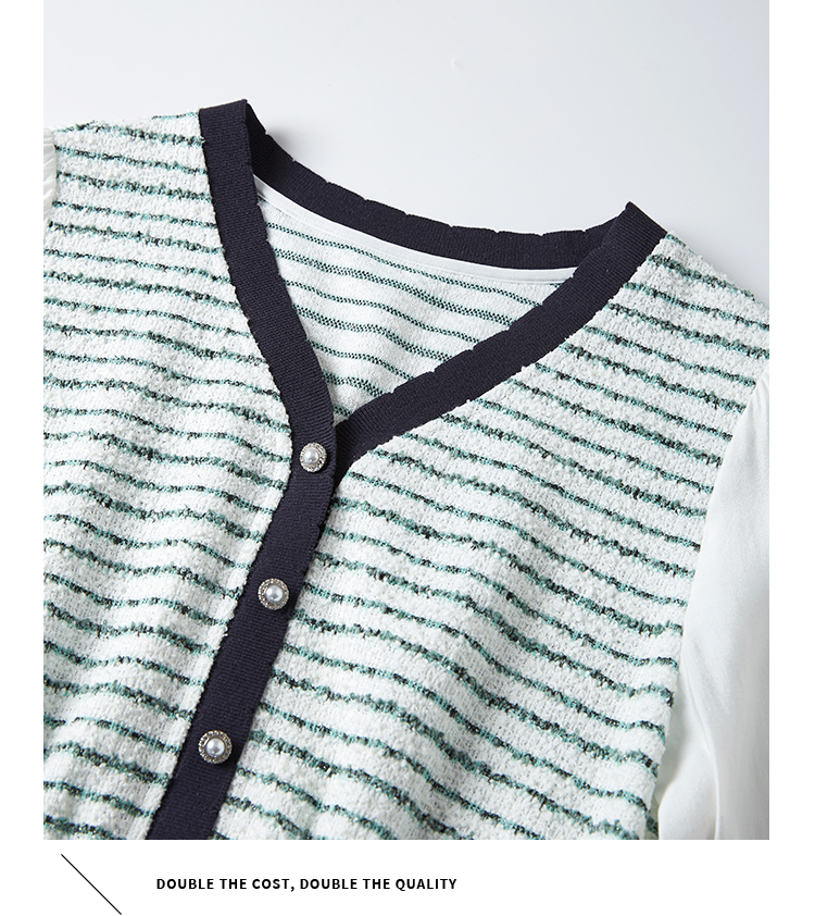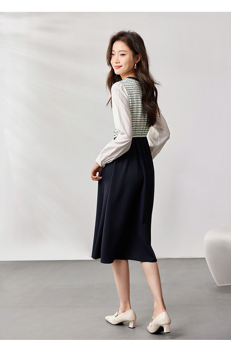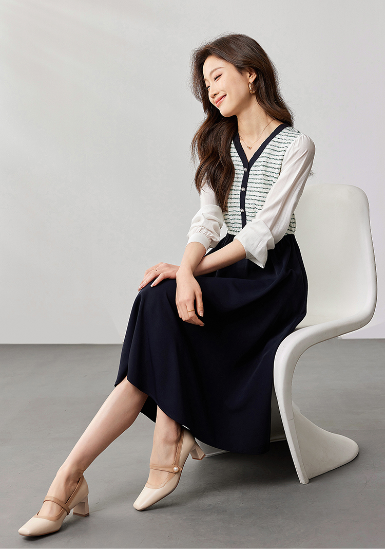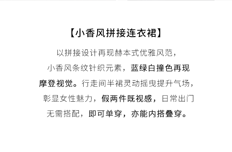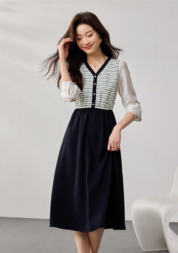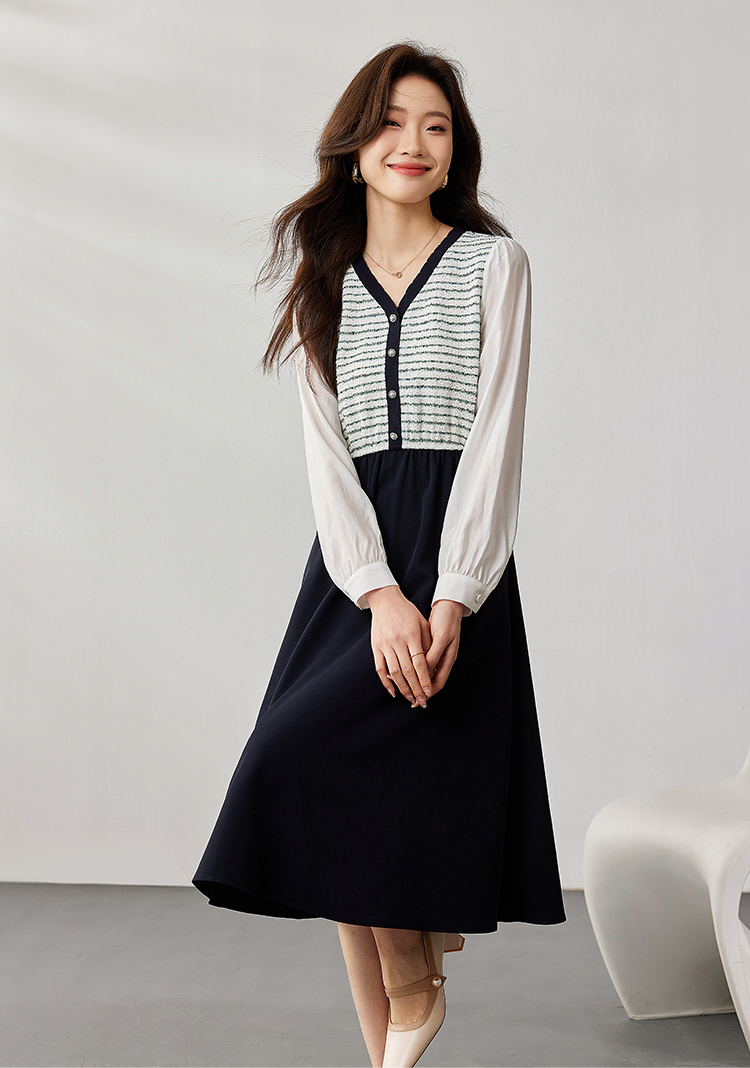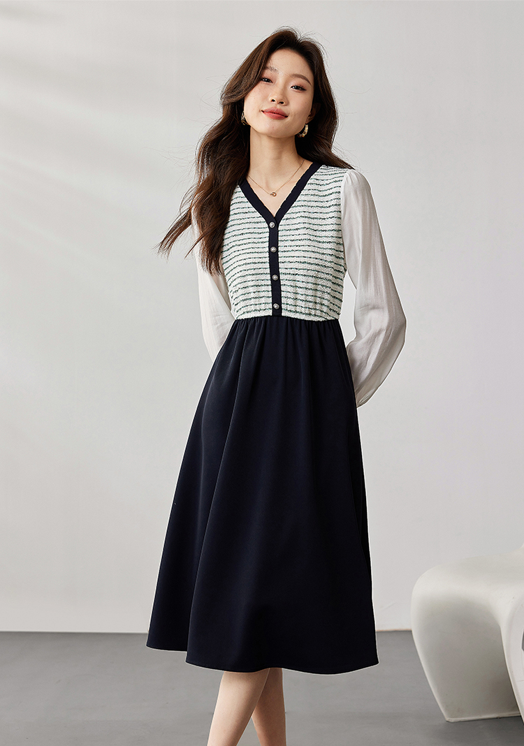 【129选3件,不退换】熙世界假两件条纹V领连衣裙女2025秋新款时尚长袖小香风a字裙子