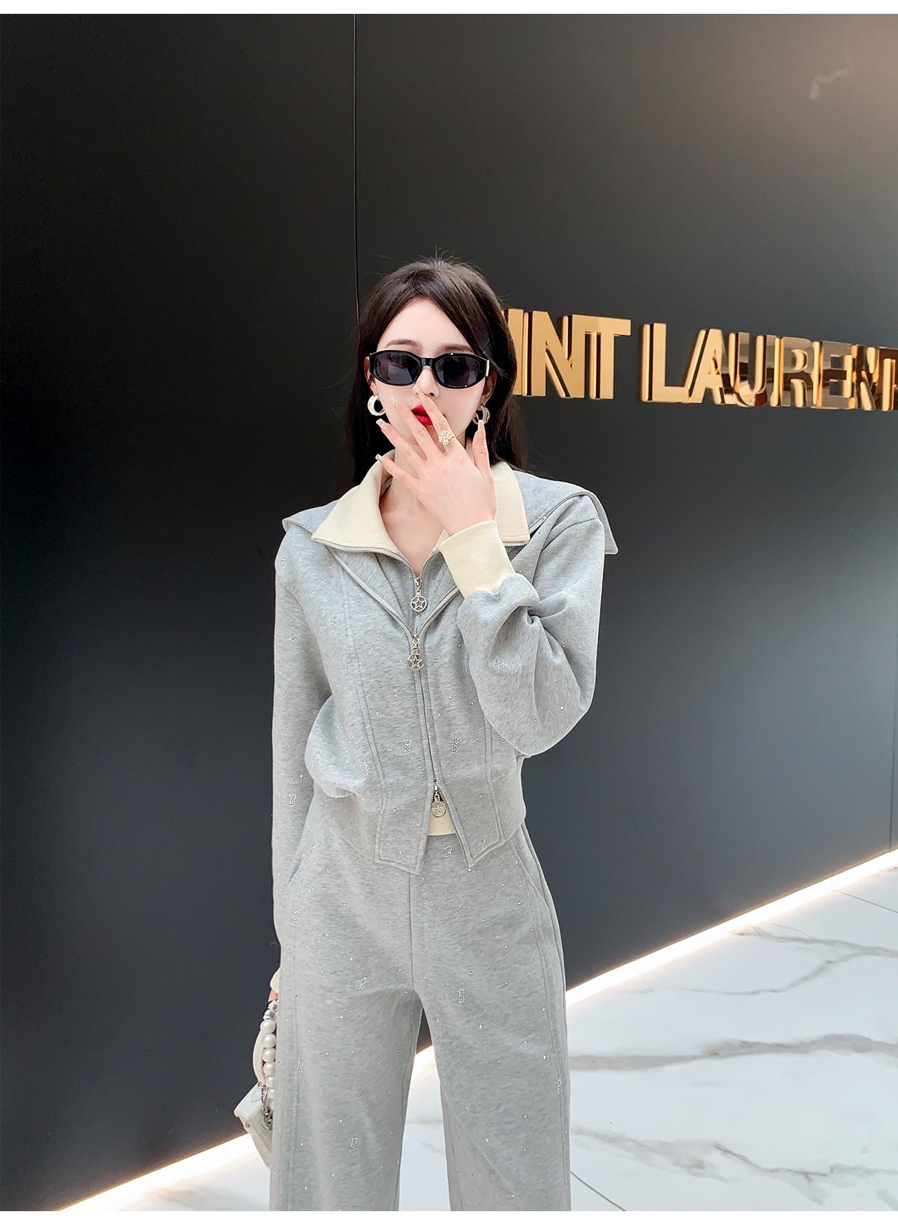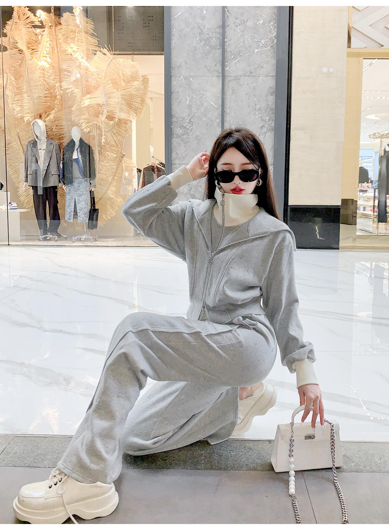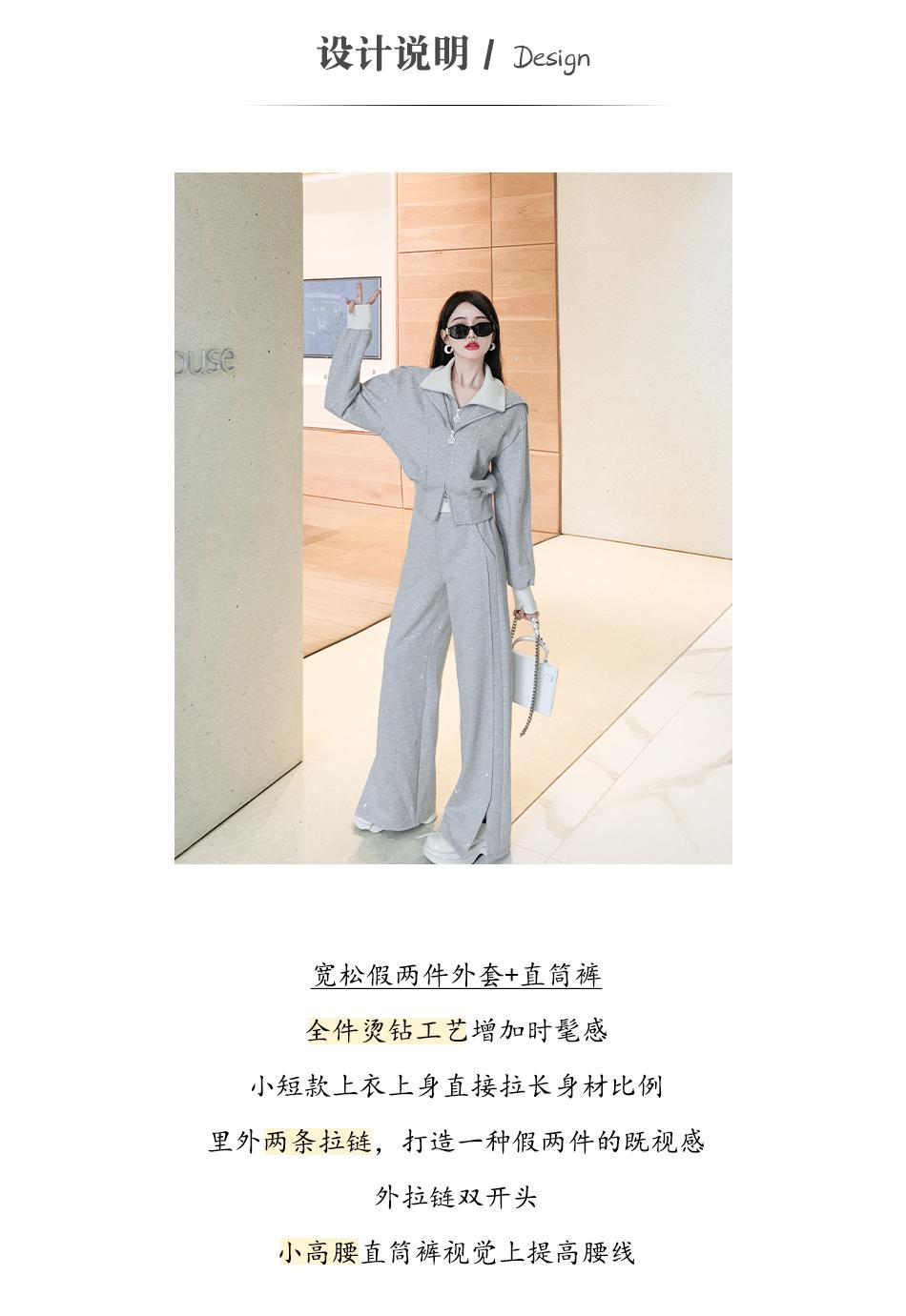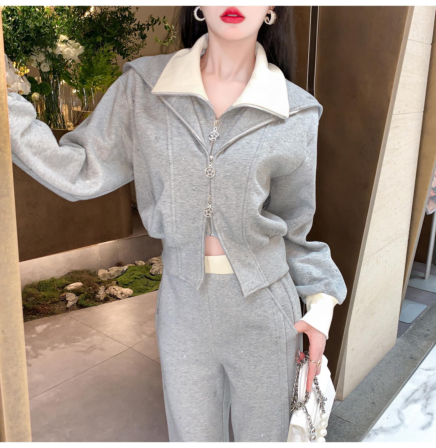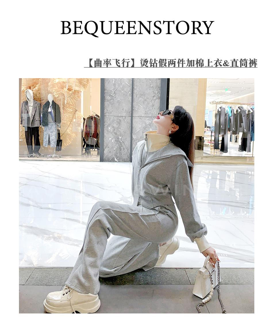 BeQueenStory【曲率飞行】运动风烫钻宽松假两件加棉上衣直筒裤套装