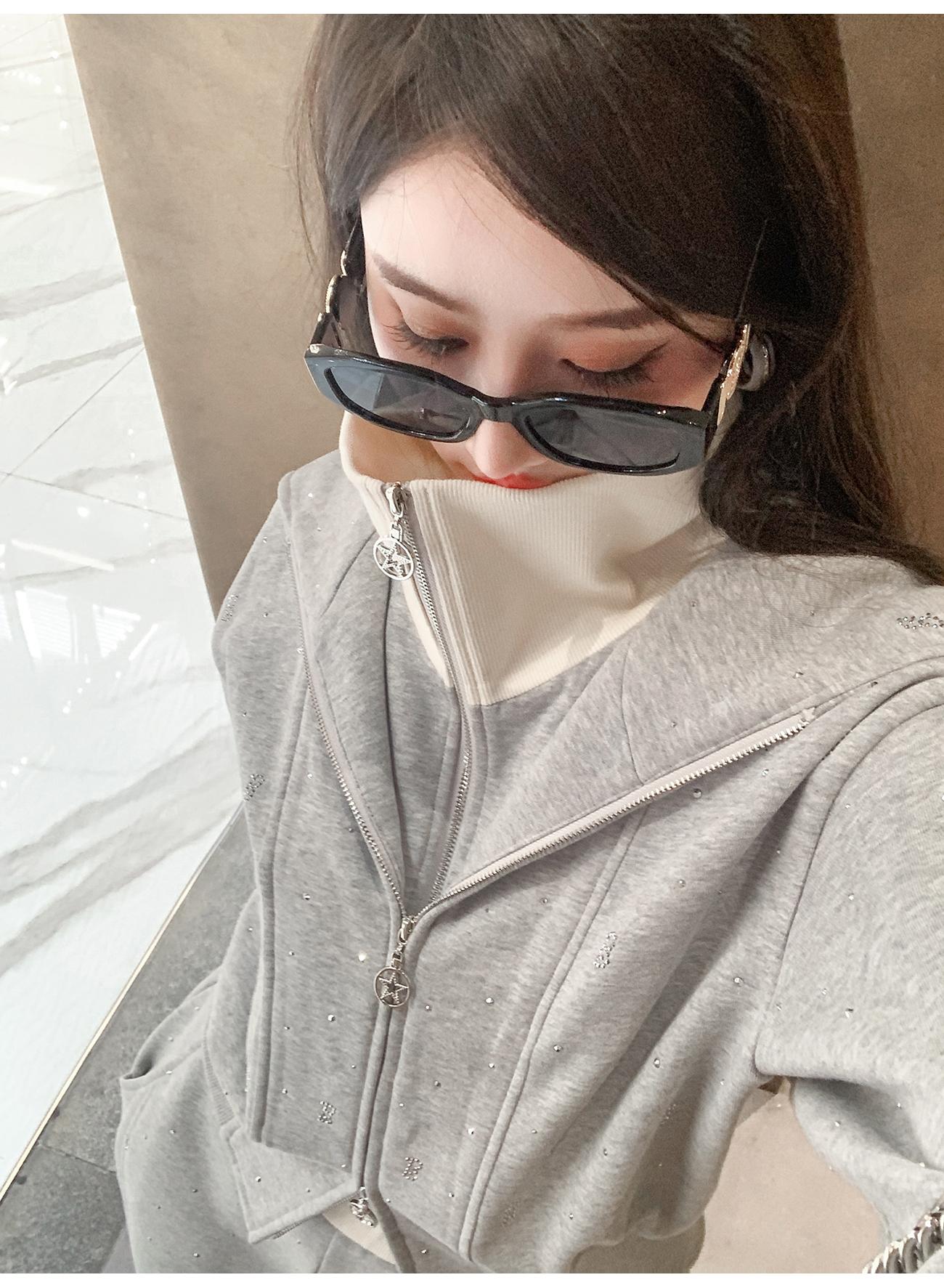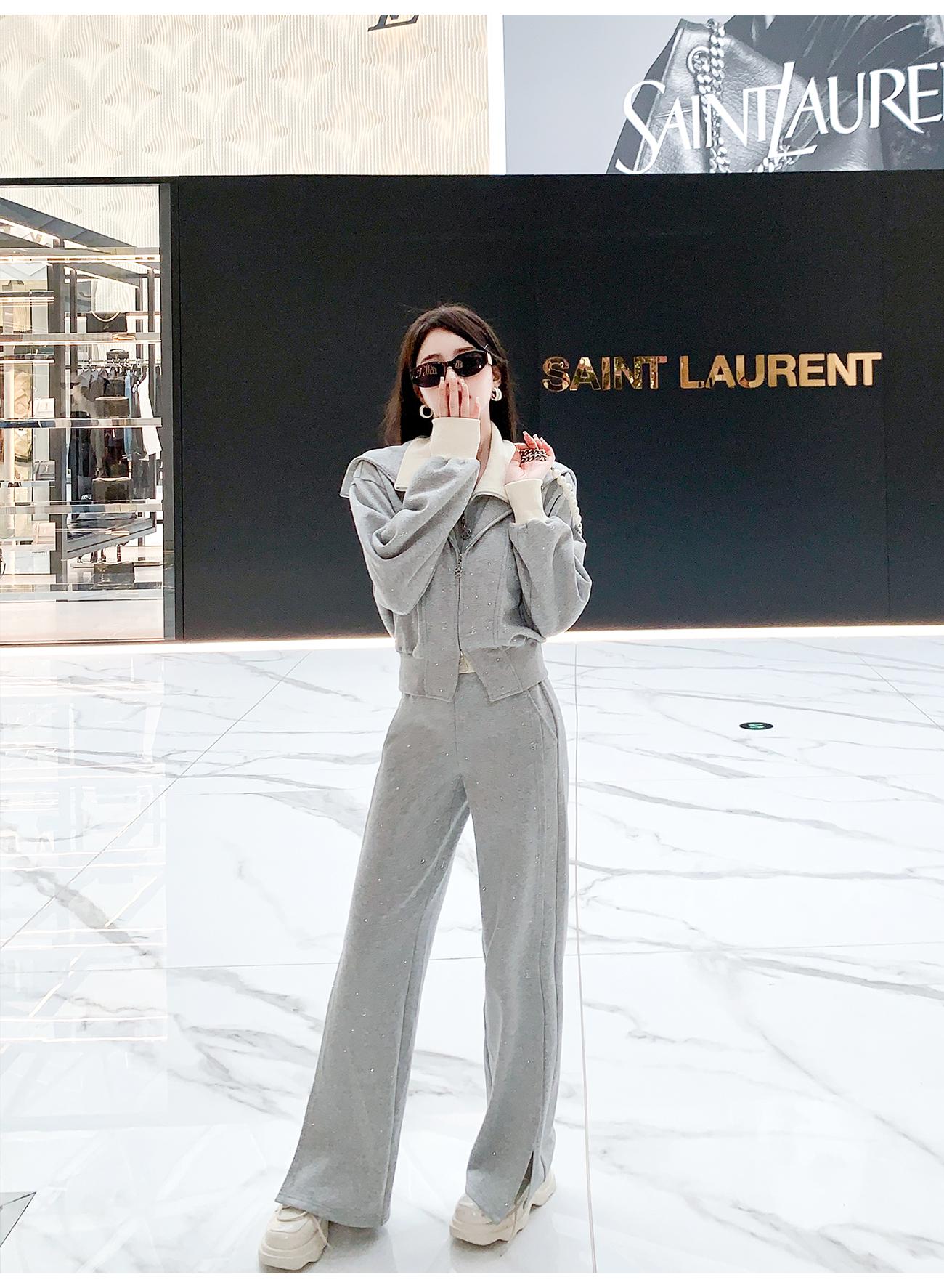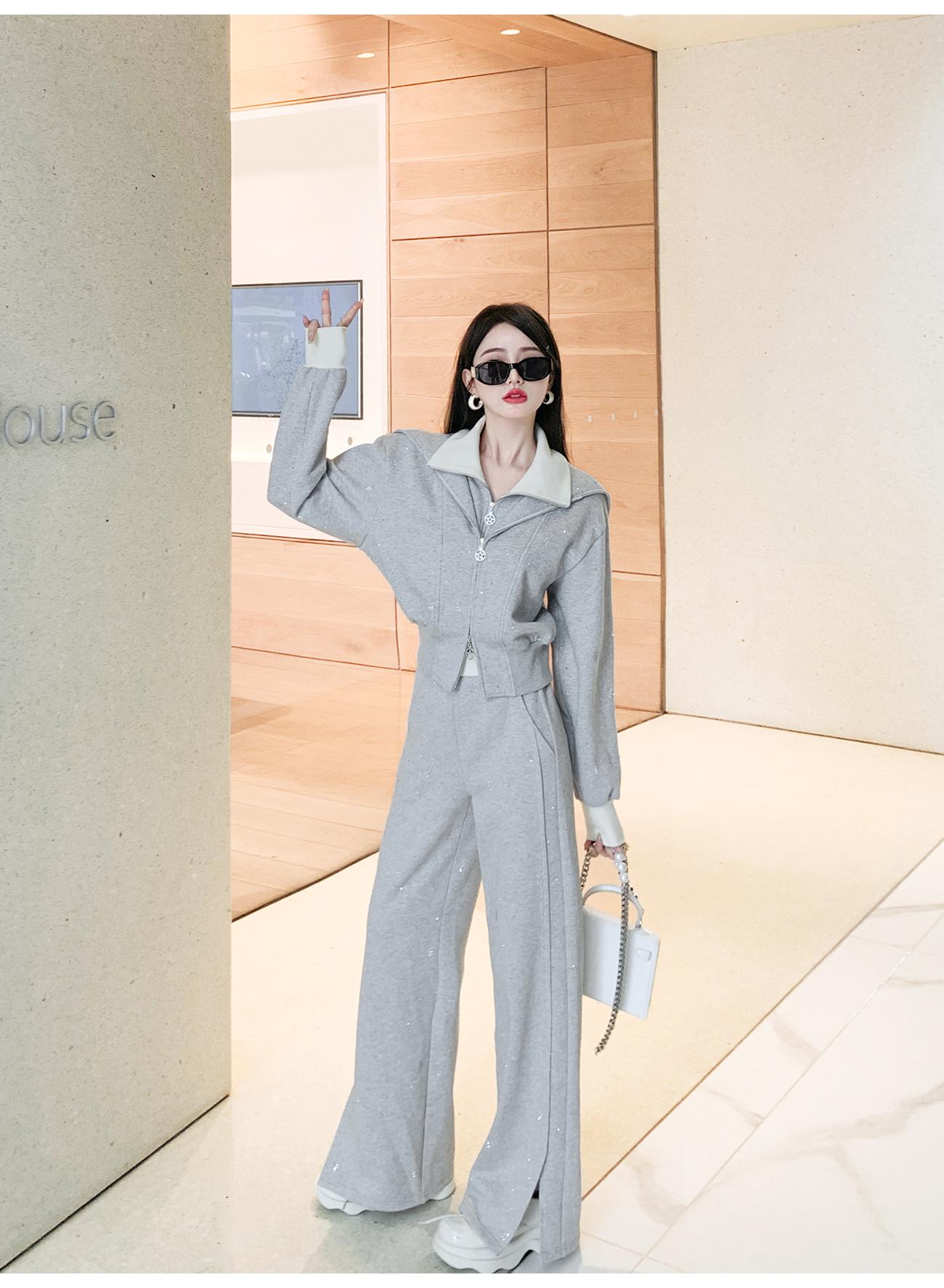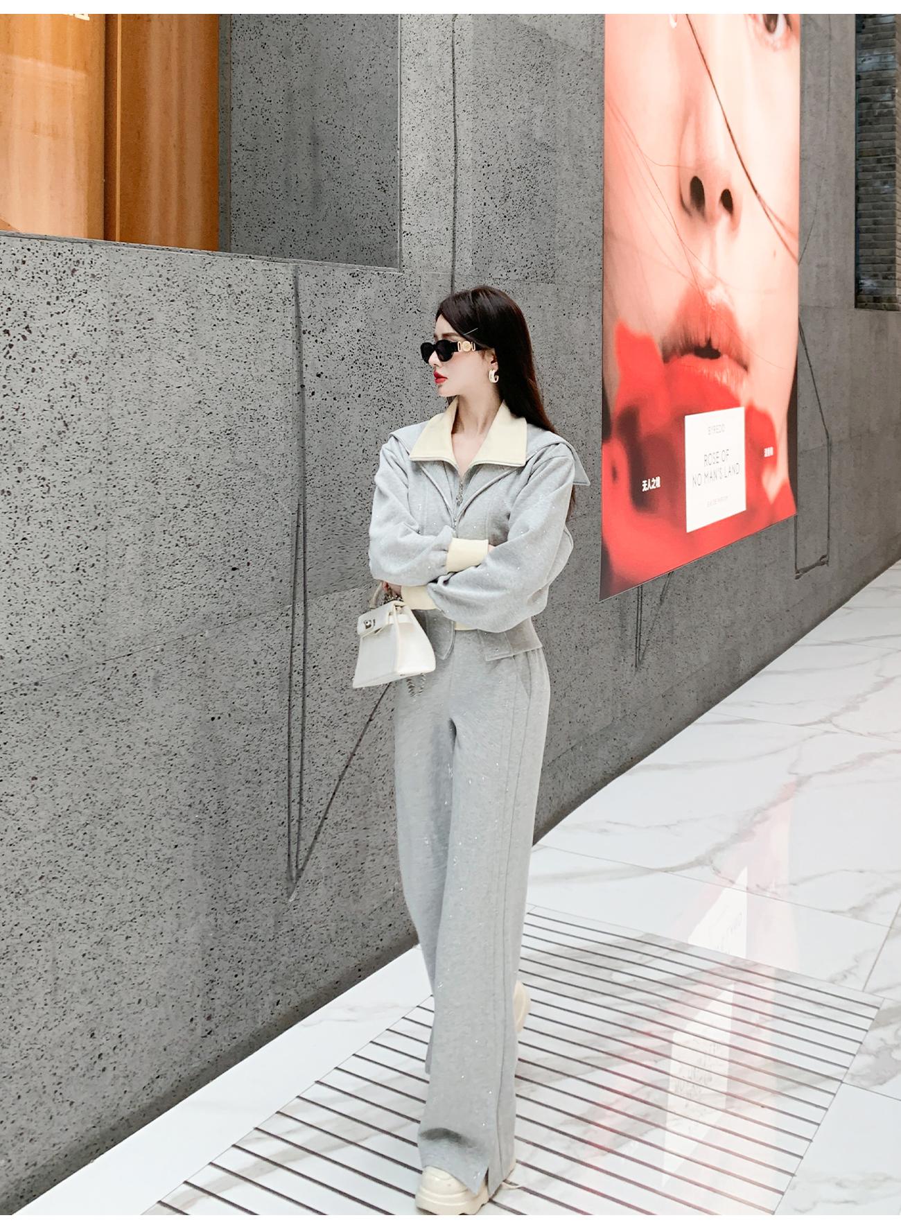 BeQueenStory【曲率飞行】运动风烫钻宽松假两件加棉上衣直筒裤套装