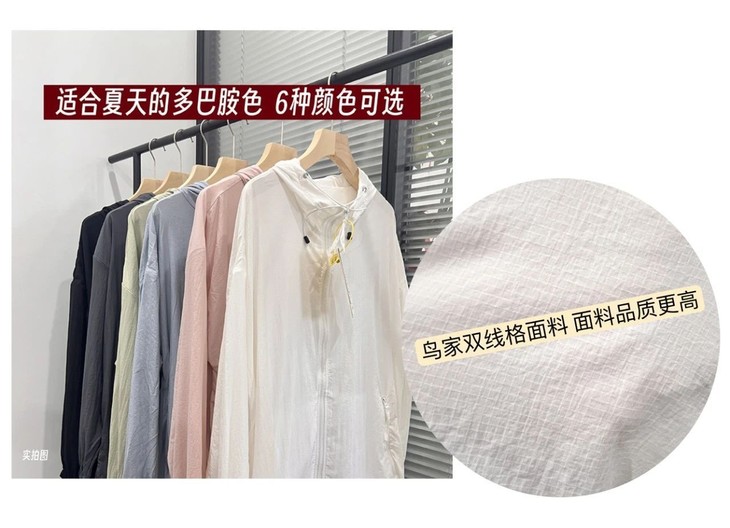 今天这款防晒衣,用的就是🐦家同款面料双线格的面料制作而成。 远看看不出细节,近看就可以发现,面料内有一行行细密的格纹。