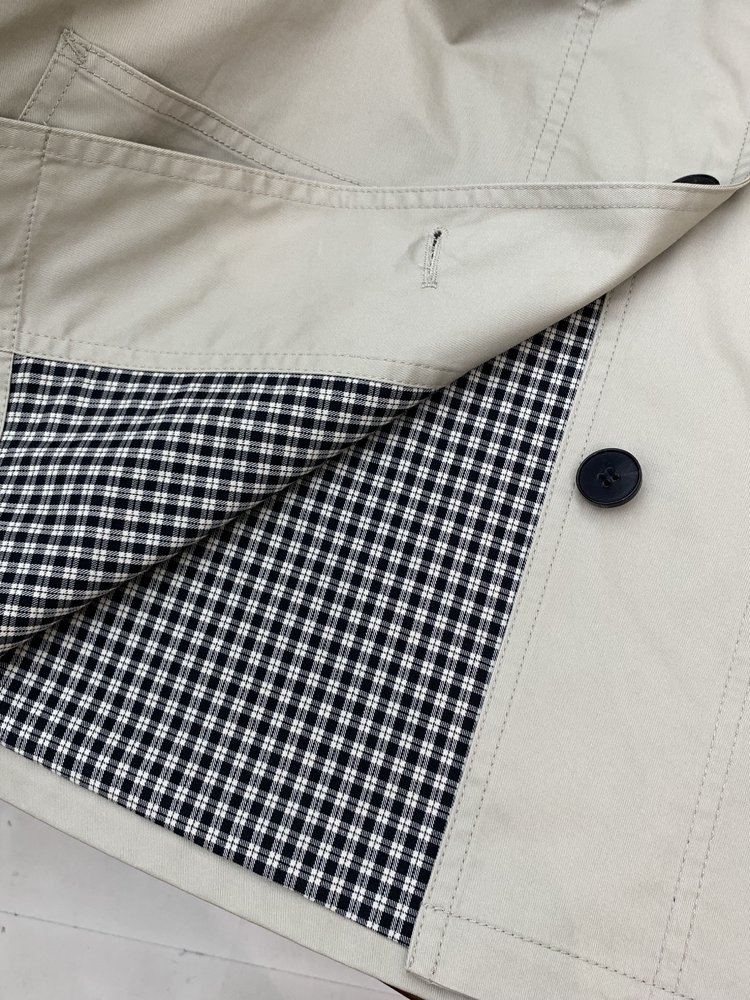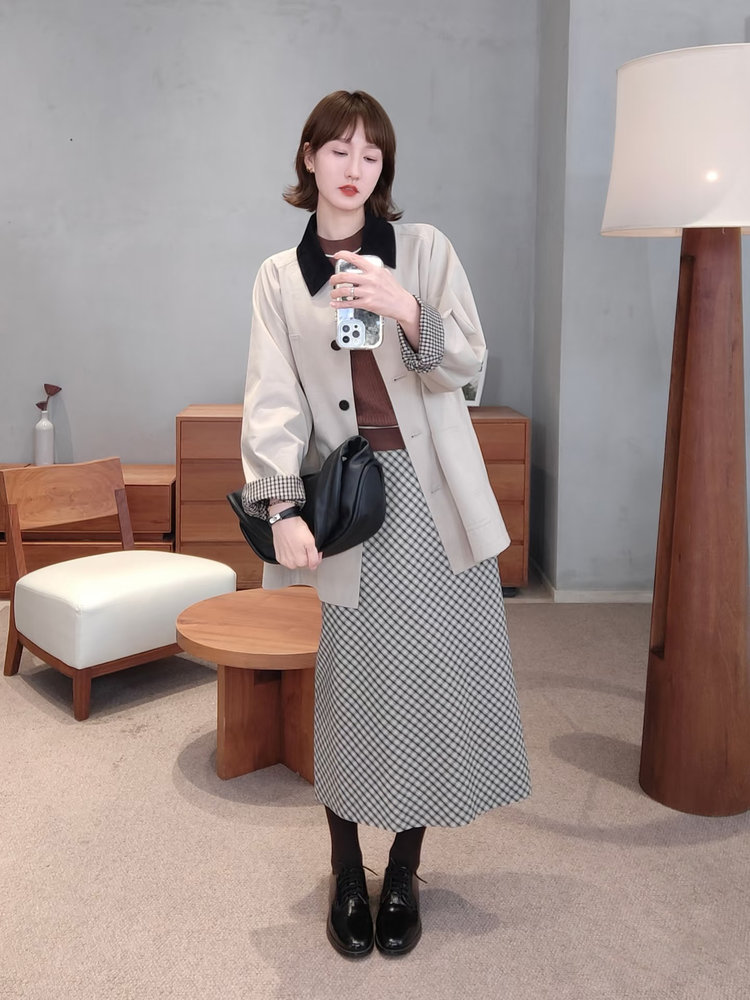 内搭选用纯棉黑米白格纹面料