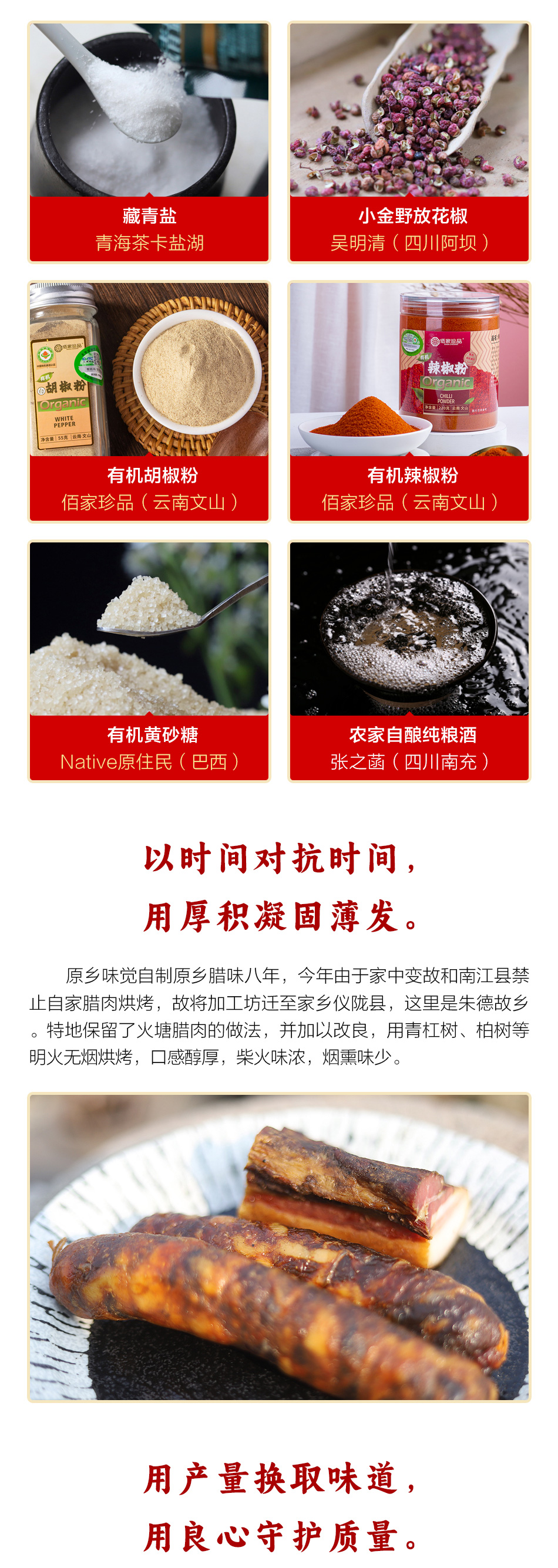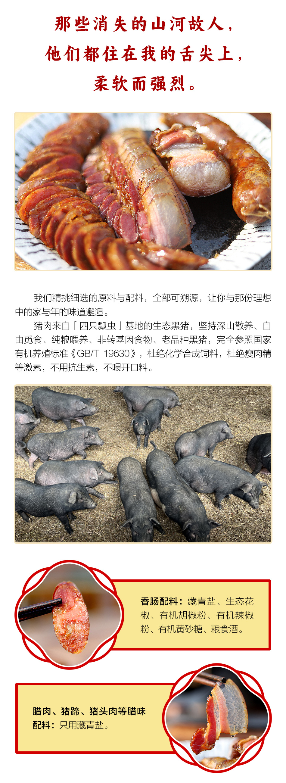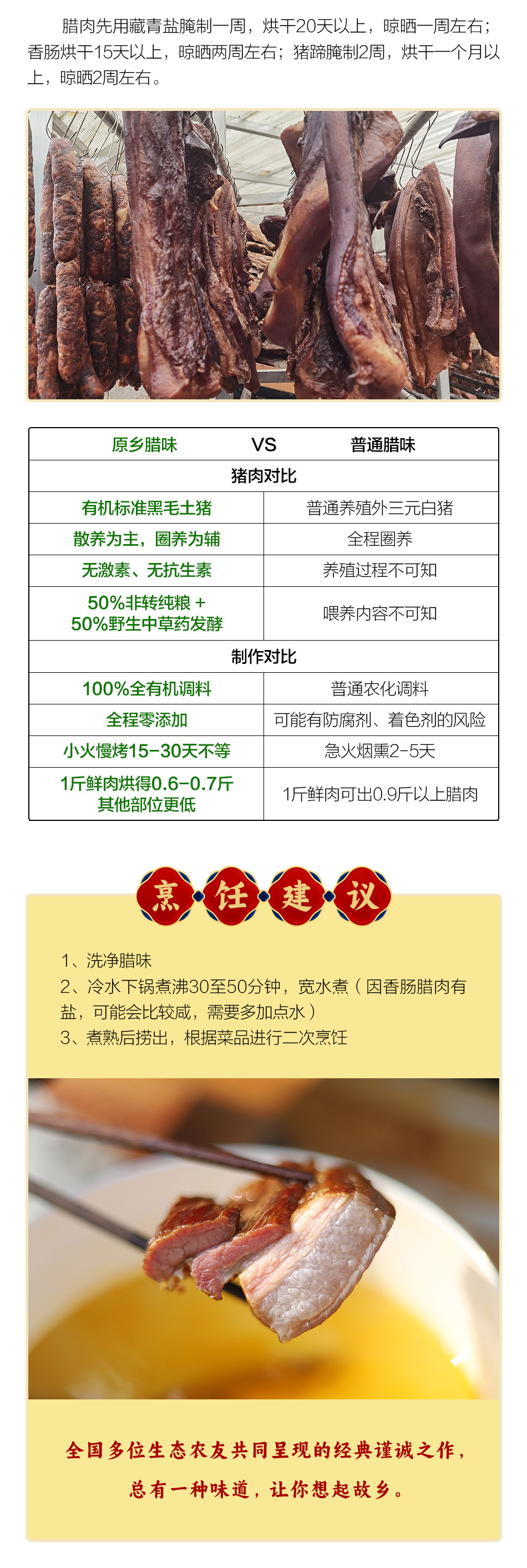 【温馨提示】 1、生态土猪肉部分可能会偏肥,贵州黑毛土猪,难以刮干净,部分猪皮上可能会有少许猪毛,介意慎拍。 2、川味腊味,香肠口味中辣,腊味香肠含盐较高,高血压、高血脂等患者建议少吃。