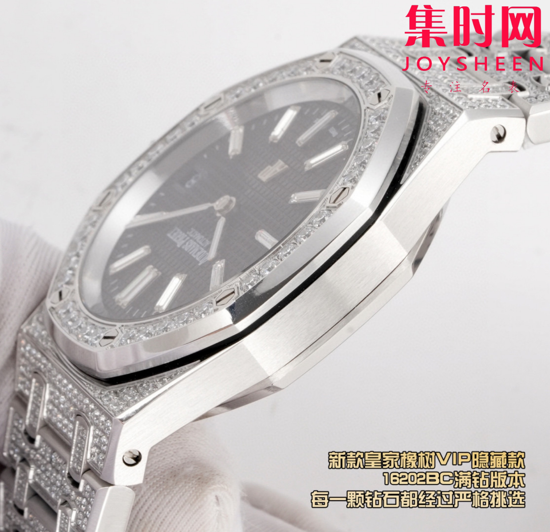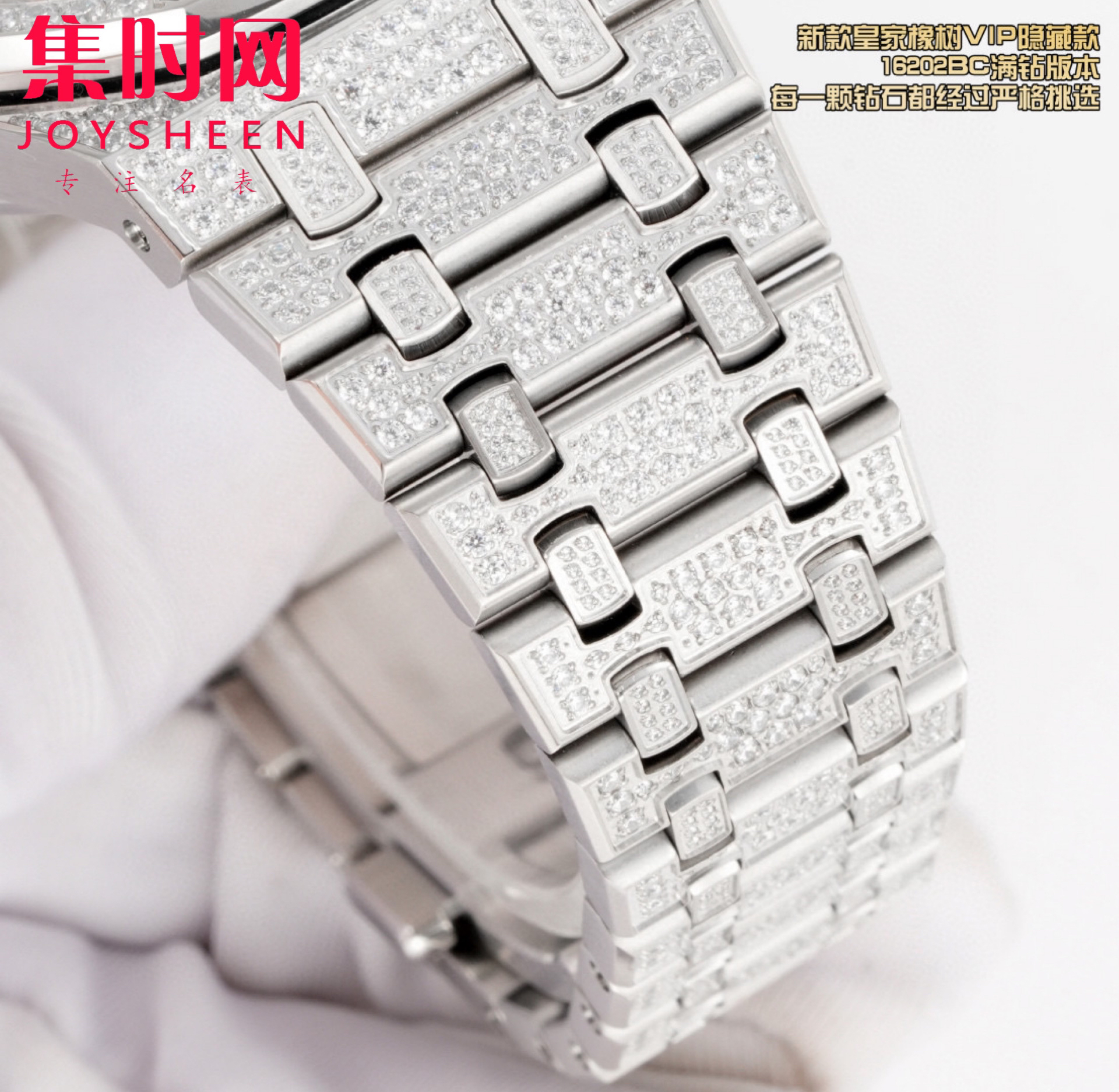 爱彼AP OMF新款皇家橡树vip隐藏款 皇家橡树满钻满天星 16202BC满钻版 男士腕表 表壳表带都采用先电白金在镶钻,质感重量达到完mei平衡。搭配高透防眩光蓝宝石玻璃镜面。自1972年由传奇制表大师杰拉尔德·吉尔多设计以来,一直是高级制表界的革命性象征,16202BC满钻版本,延续了经典的八角表圈设计同时,全表面共镶嵌进口莫桑钻,每一颗钻石都经过严格挑选,并达到VVS标准,璀璨程度叹为观止,超薄厚度9mm 表壳尺寸39mm,搭载Cal.7121自动上链机械机芯,满动储高达55小时,这款满钻在阳光或灯光璀璨夺目,大方异彩。是钢壳表无法取代的。喜欢的朋友赶紧下手,数量有限。