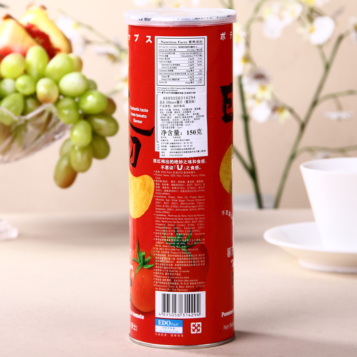马来西亚EDOpack巨浪大切番茄味薯片 配料表:马铃薯、棕榈油、马铃薯淀粉、葡萄糖、食盐、白砂糖、面包糠、调味料、增味剂、食用色素、抗结剂,甜味剂、抗氧化剂; 储藏方法:请存放于阴凉干爽处; 保质期:12个月; 品牌: EDOpack; 系列: 薯片; 规格: 150g; 产地:马来西亚。 |