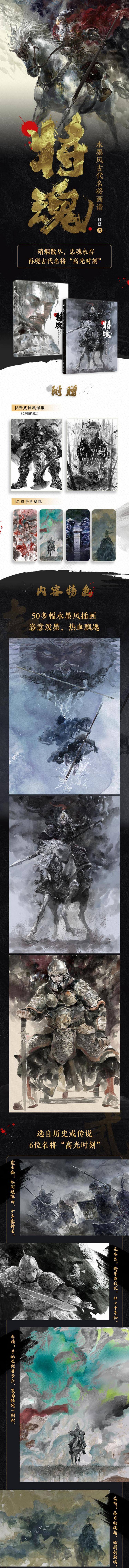 1.50多幅水墨风插画,恣意泼墨,热血飘逸 2.选自历史或传说,6位名将“高光时刻” 3.手绘汉、唐、宋、明甲胄及军刀 4.附原创水墨机甲武侠故事 5.大16开,软精装,内外双封设计,赠8开海报