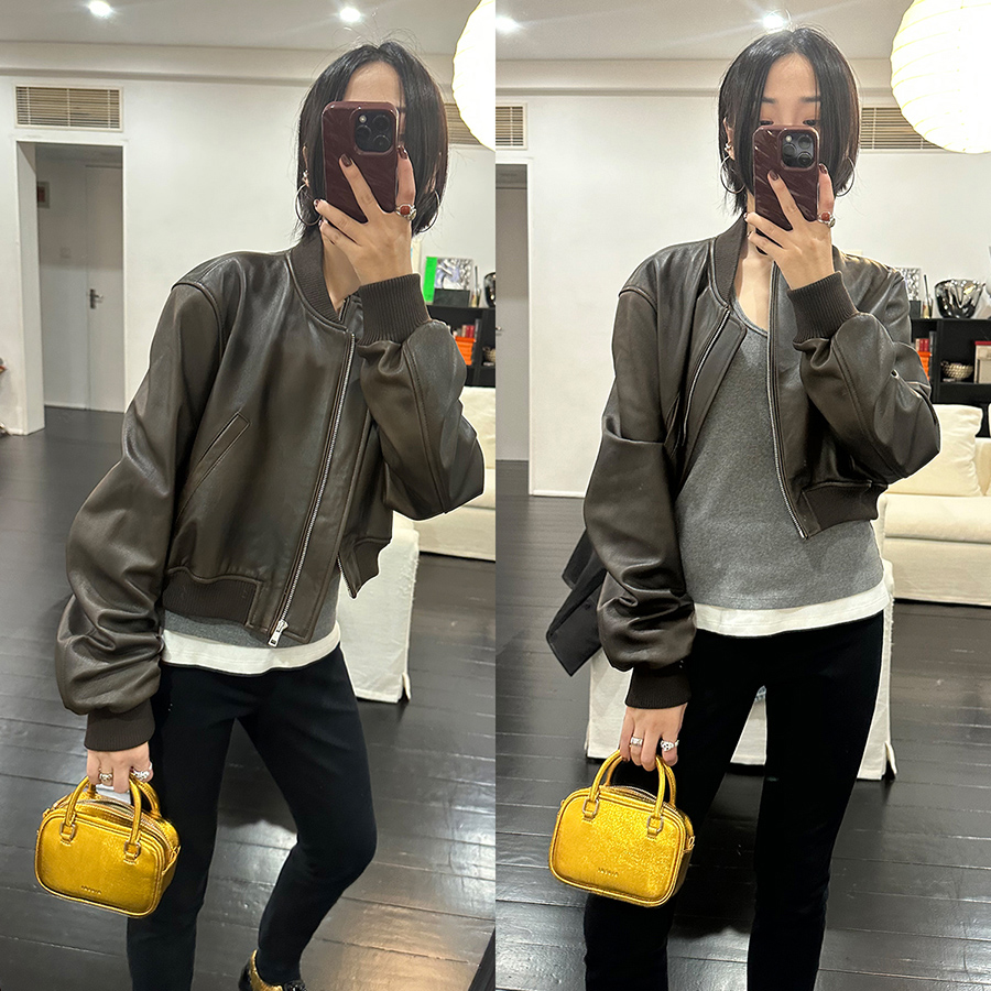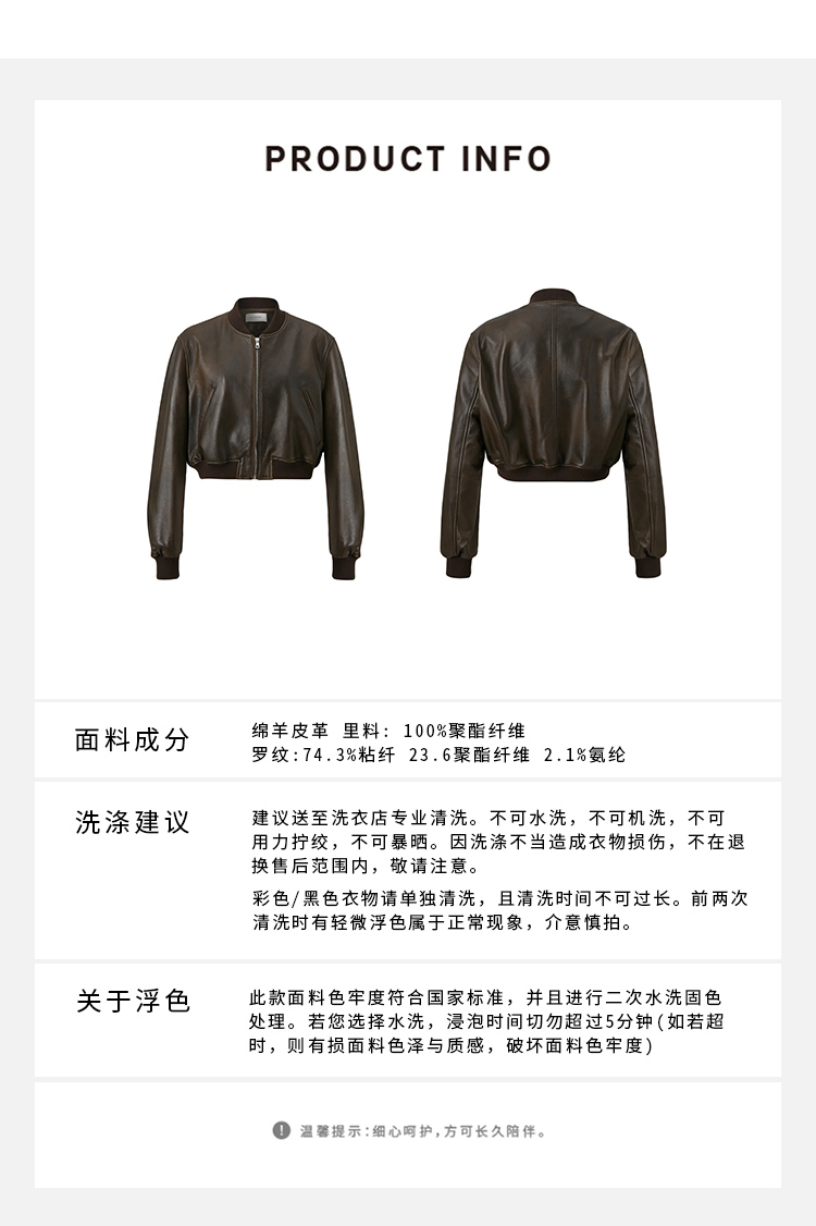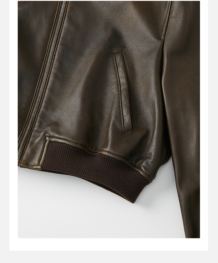 HIDEMI 做旧擦色绵羊皮拉链极简短款棒球皮衣外套