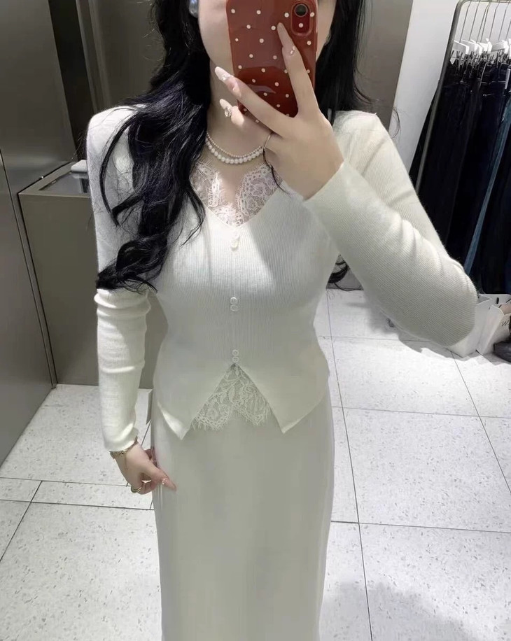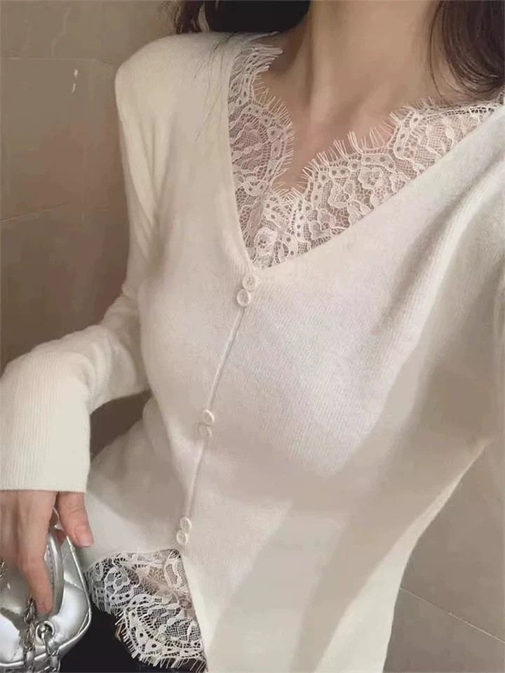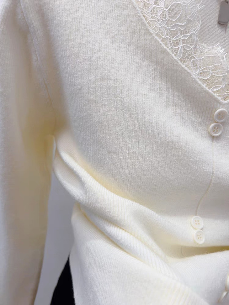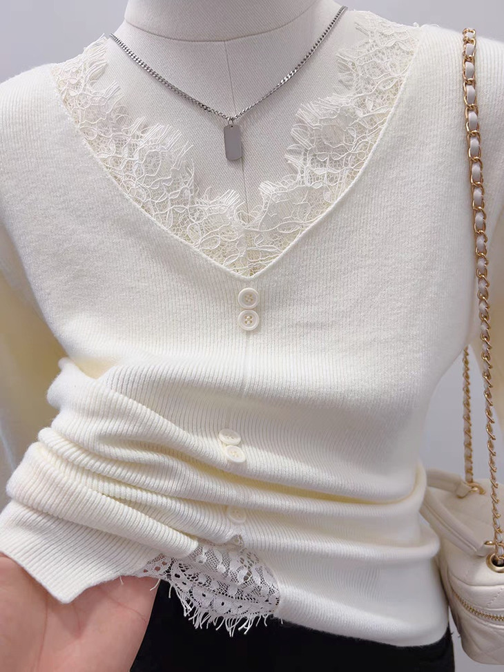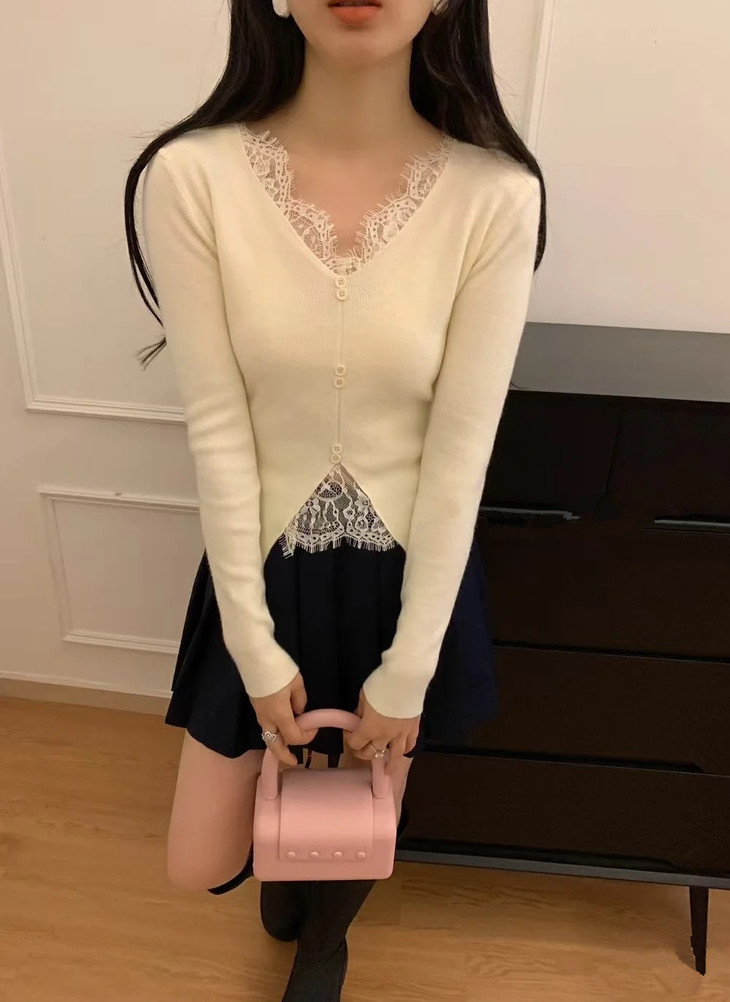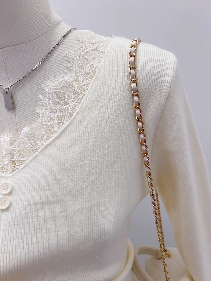 【伊泺杉蕾丝拼接针织衫】 时尚穿搭必备的蕾丝花边长袖针织衫 V领设计显露锁骨,拉长脖颈线条 纯色设计简单好搭配,轻松出门 蕾丝花边增加整体设计感 亲肤的针织面料手感柔软穿着舒适 修身版型不紧绷巨显瘦的别致内搭‼️上身秒变纸片人‼️