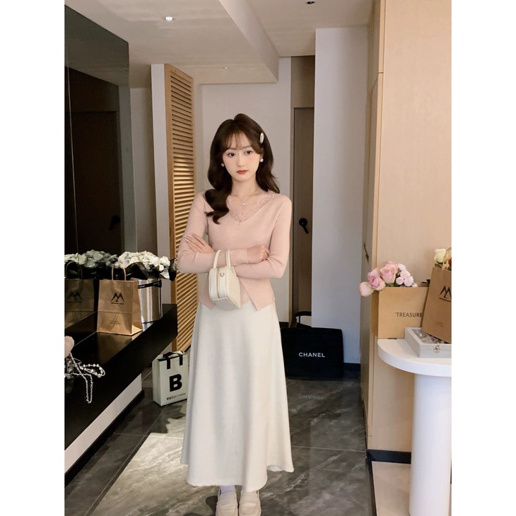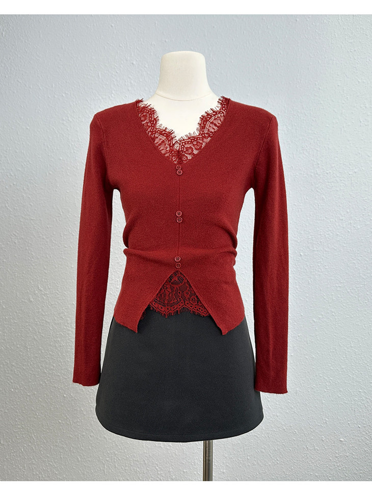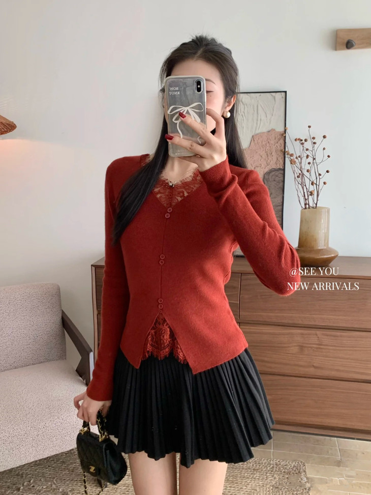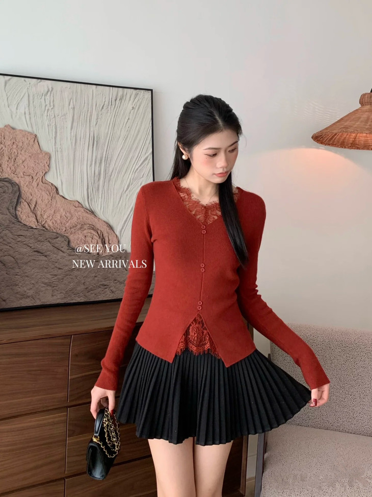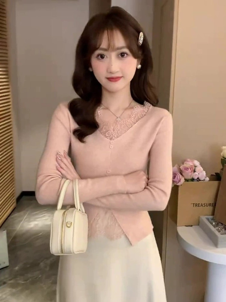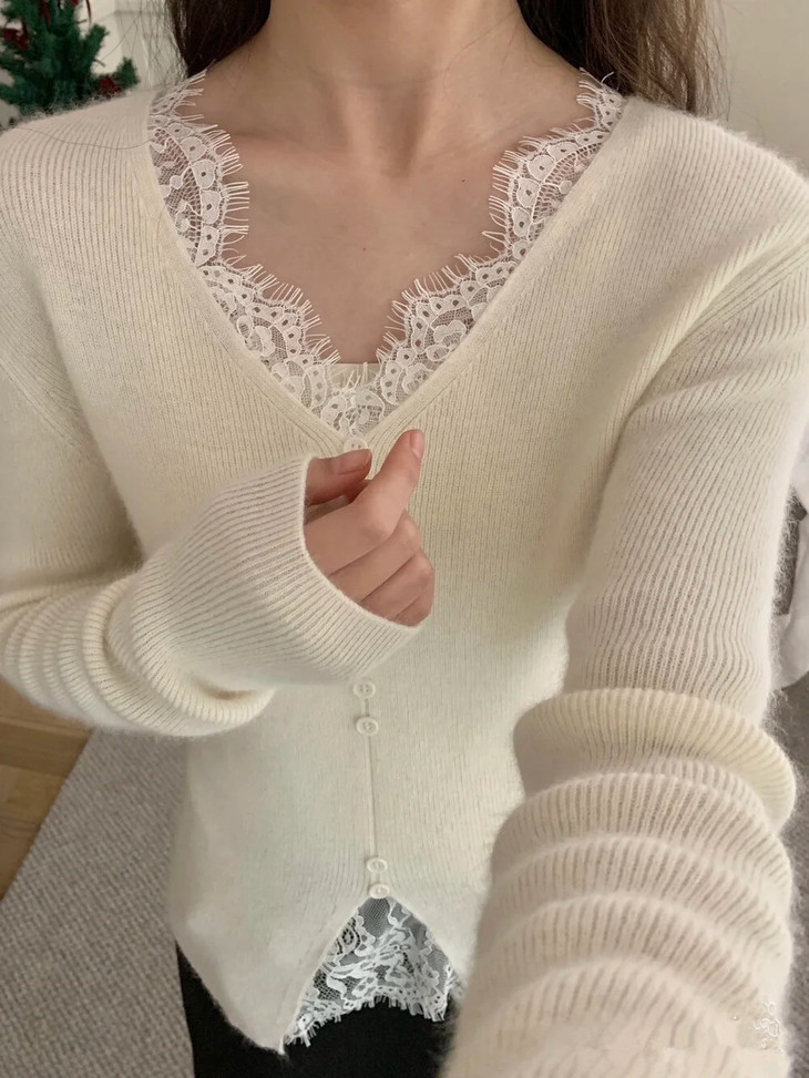 【伊泺杉蕾丝拼接针织衫】 时尚穿搭必备的蕾丝花边长袖针织衫 V领设计显露锁骨,拉长脖颈线条 纯色设计简单好搭配,轻松出门 蕾丝花边增加整体设计感 亲肤的针织面料手感柔软穿着舒适 修身版型不紧绷巨显瘦的别致内搭‼️上身秒变纸片人‼️