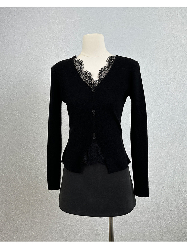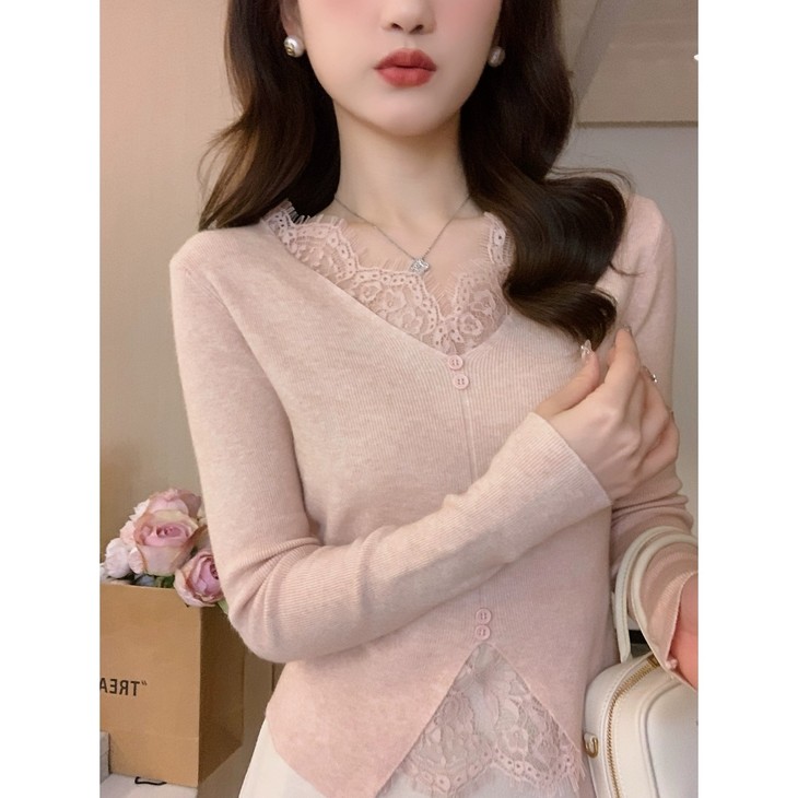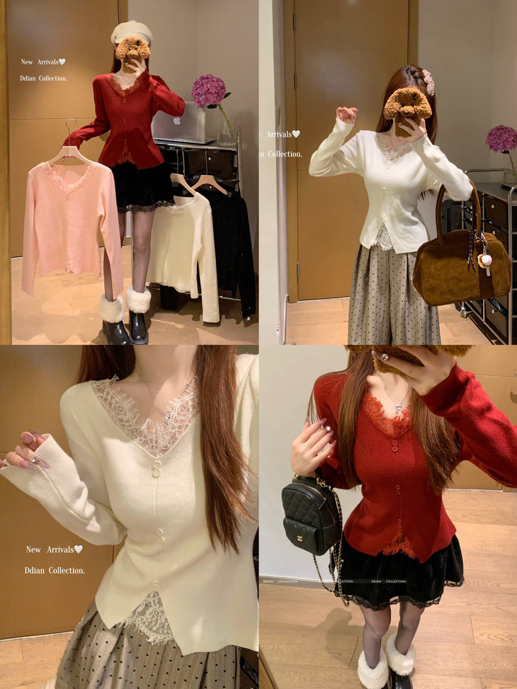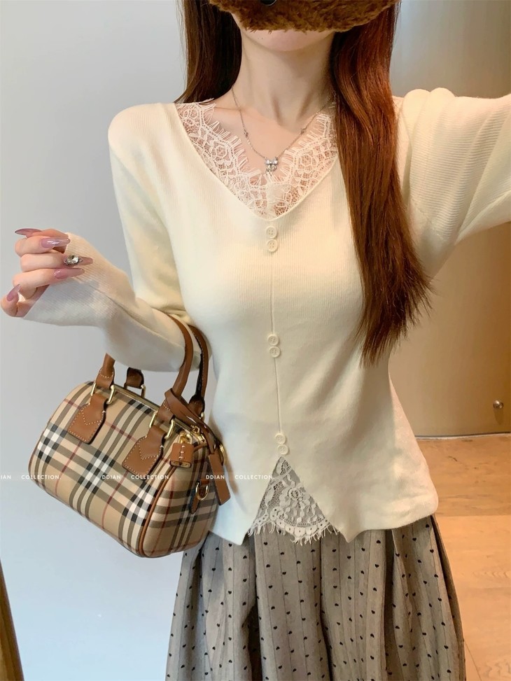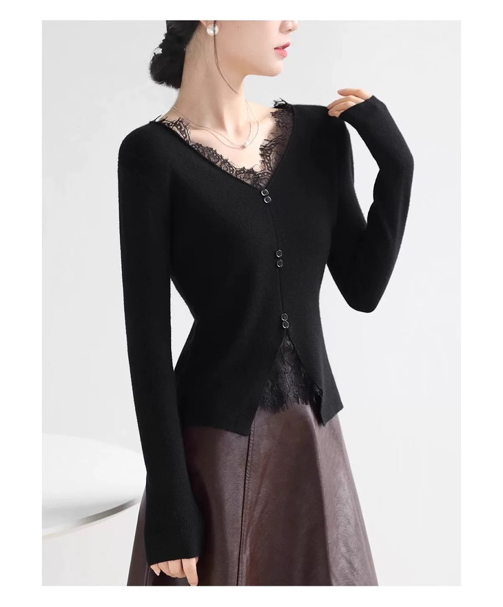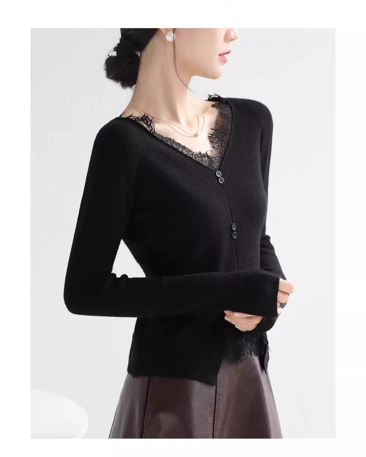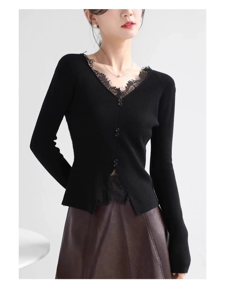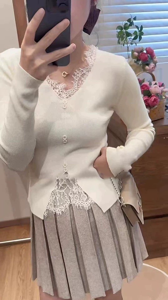 🌈高品质!!超绝纯欲风【伊泺杉蕾丝拼接针织衫】修身版型不紧绷巨显瘦的别致内搭‼️👏上身秒变纸片人‼️ ✔领口花型蕾丝睫毛边点缀真的很精致~