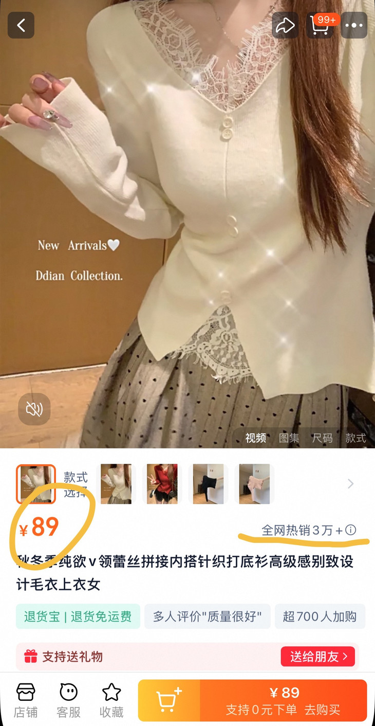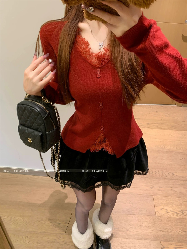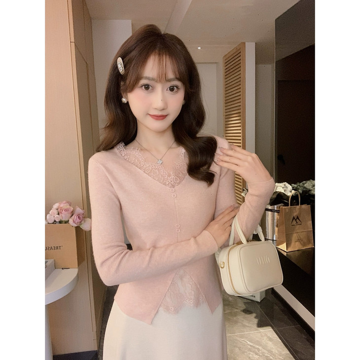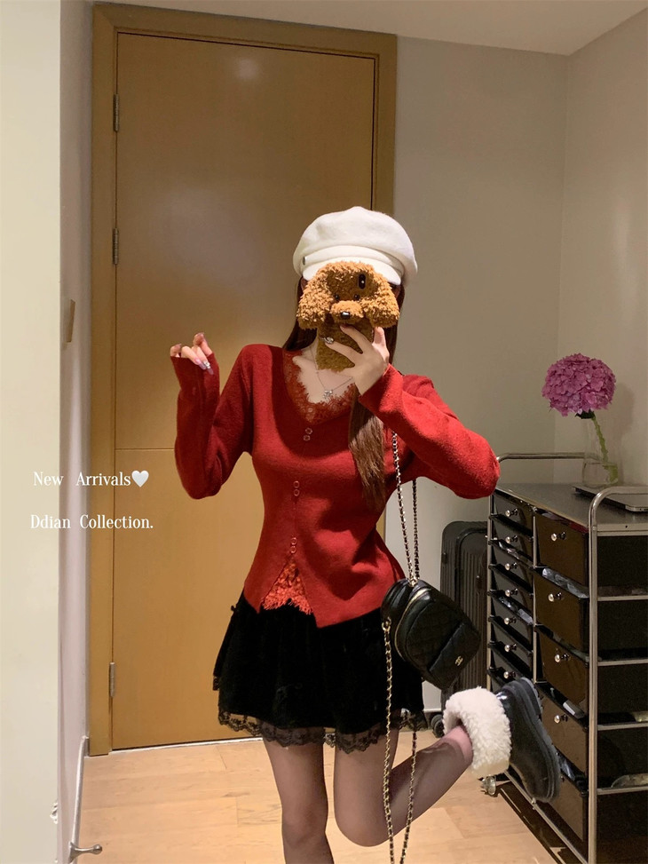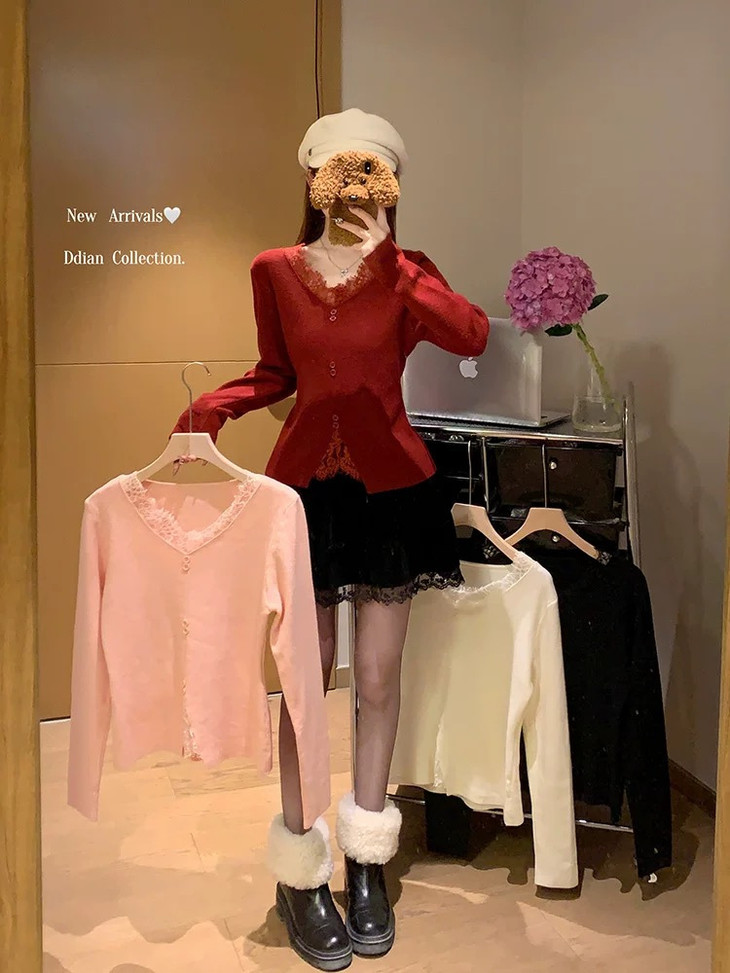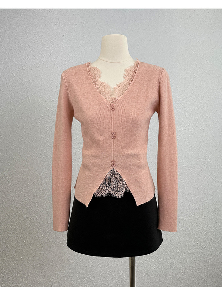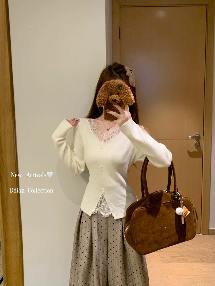 🌈高品质!!超绝纯欲风【伊泺杉蕾丝拼接针织衫】修身版型不紧绷巨显瘦的别致内搭‼️👏上身秒变纸片人‼️ ✔领口花型蕾丝睫毛边点缀真的很精致~