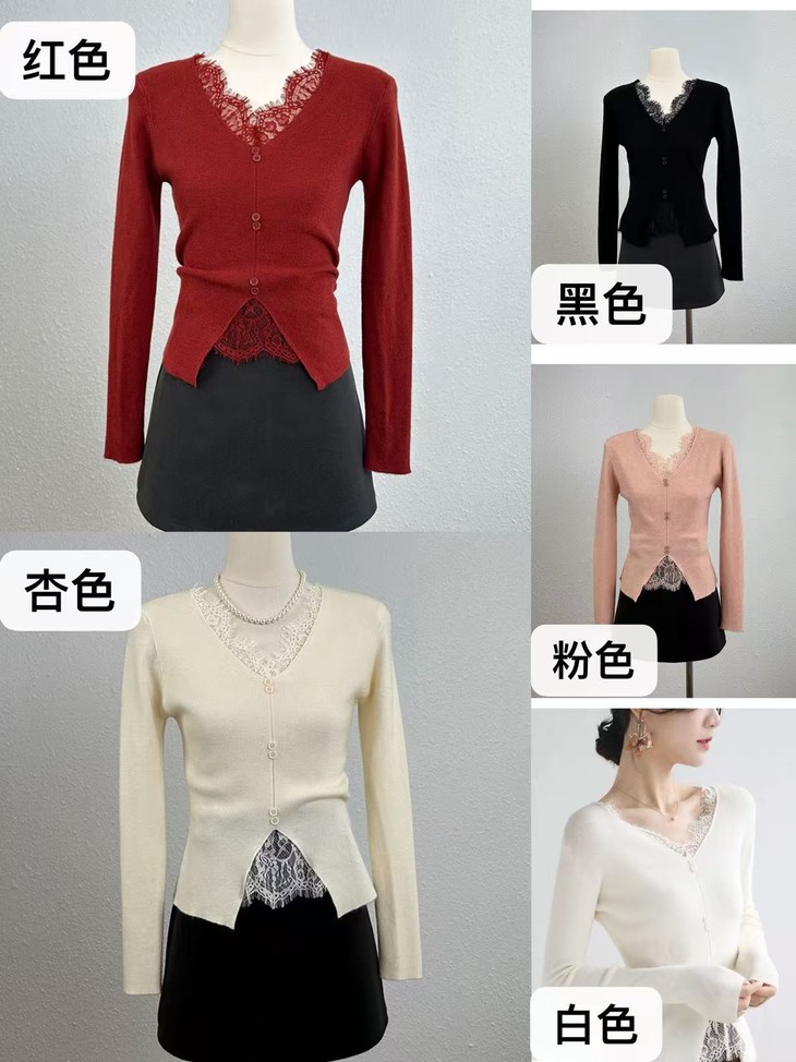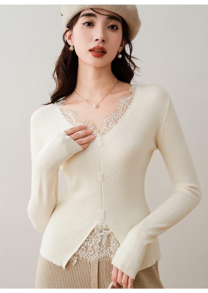 春季怎么能少的了轻松穿出好身材的上衣呢------【伊泺杉蕾丝拼接针织衫】 领口花型蕾丝睫毛边点缀真的很精致 不易走光 巨巨巨有魅力 V领搭配合身打底 露出迷人的脖颈线 穿出好身材打底衫 不要太迷人 整体修身版型但不紧绷 可以来一打这样的打底衫 狠显瘦又百搭