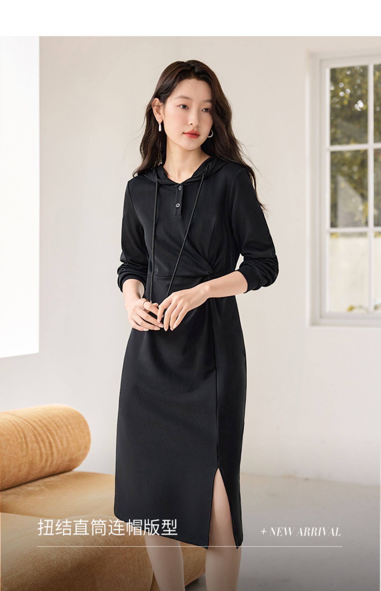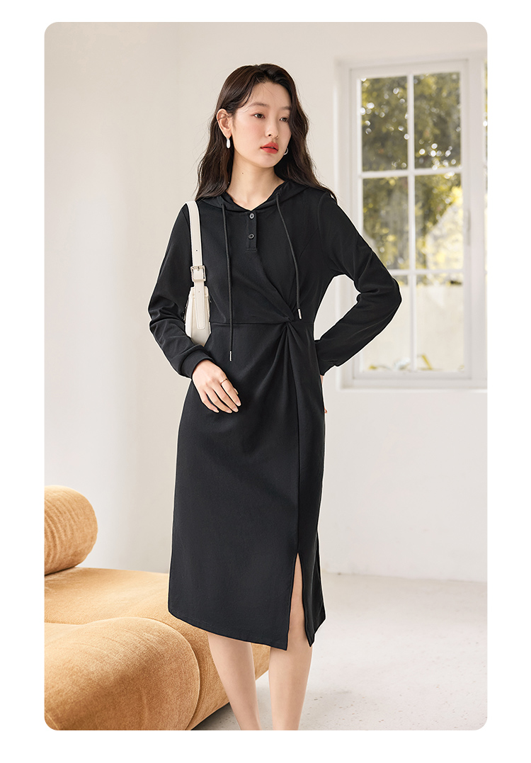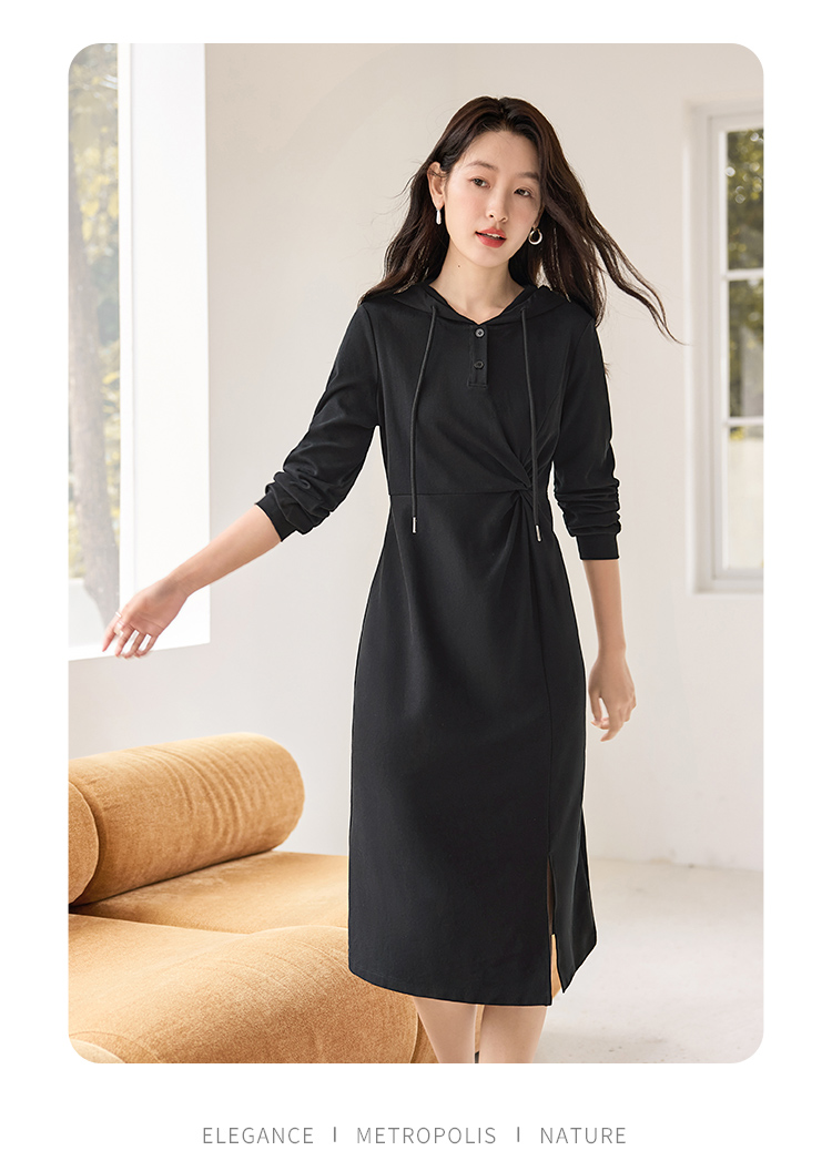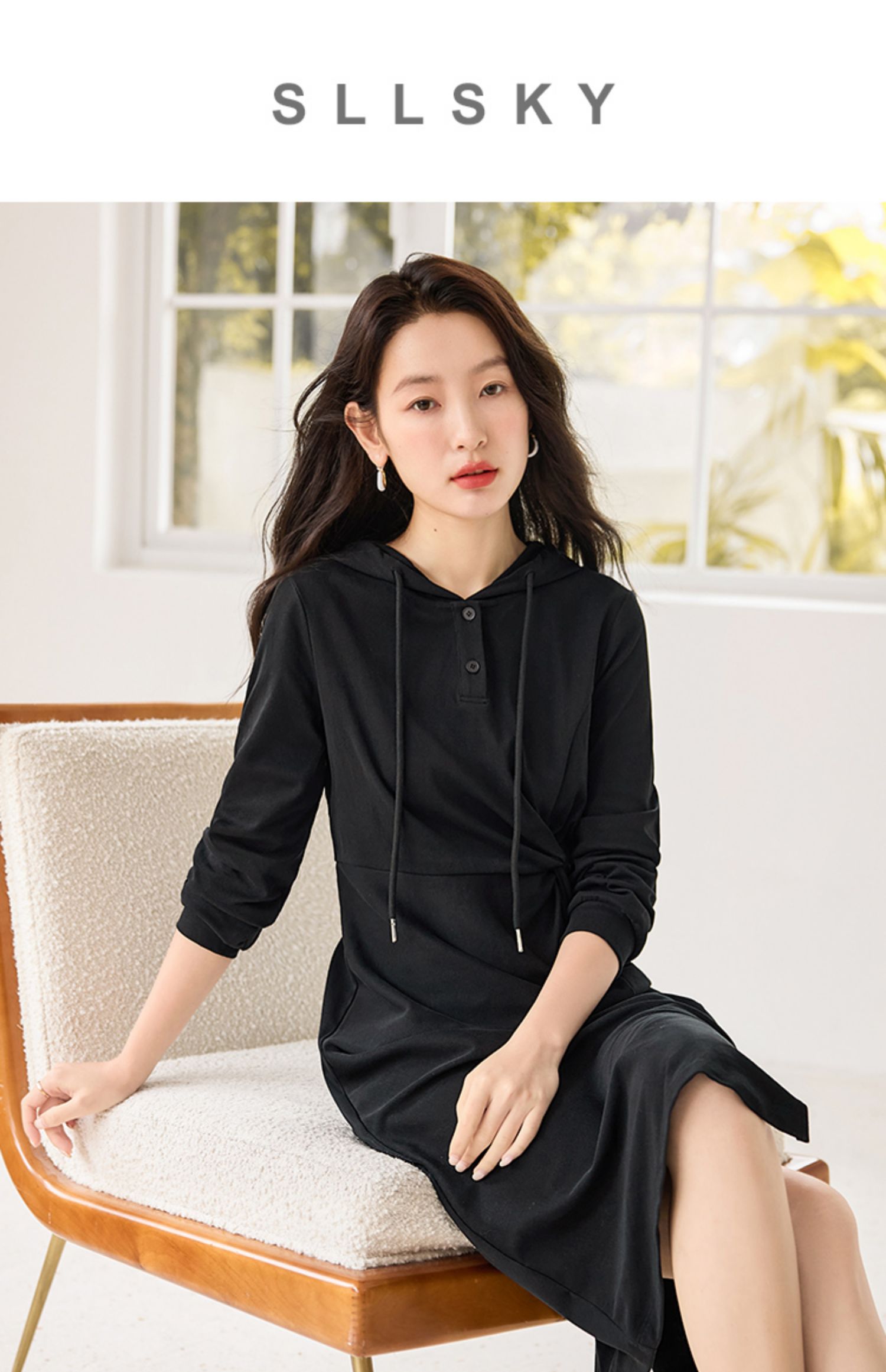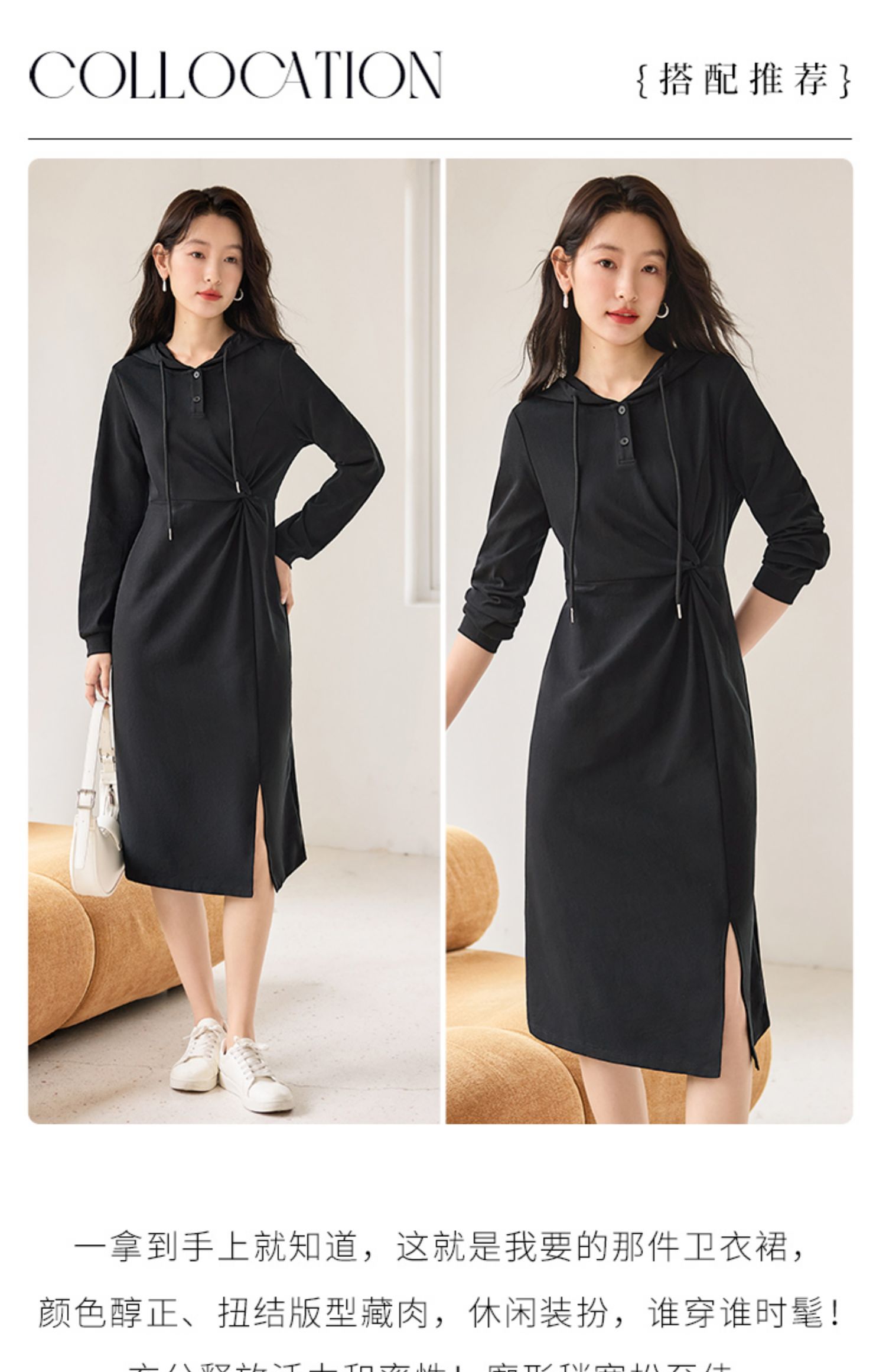 【开门红】熙世界黑色连帽卫衣连衣裙秋2025新款气质收腰显瘦休闲开叉裙子