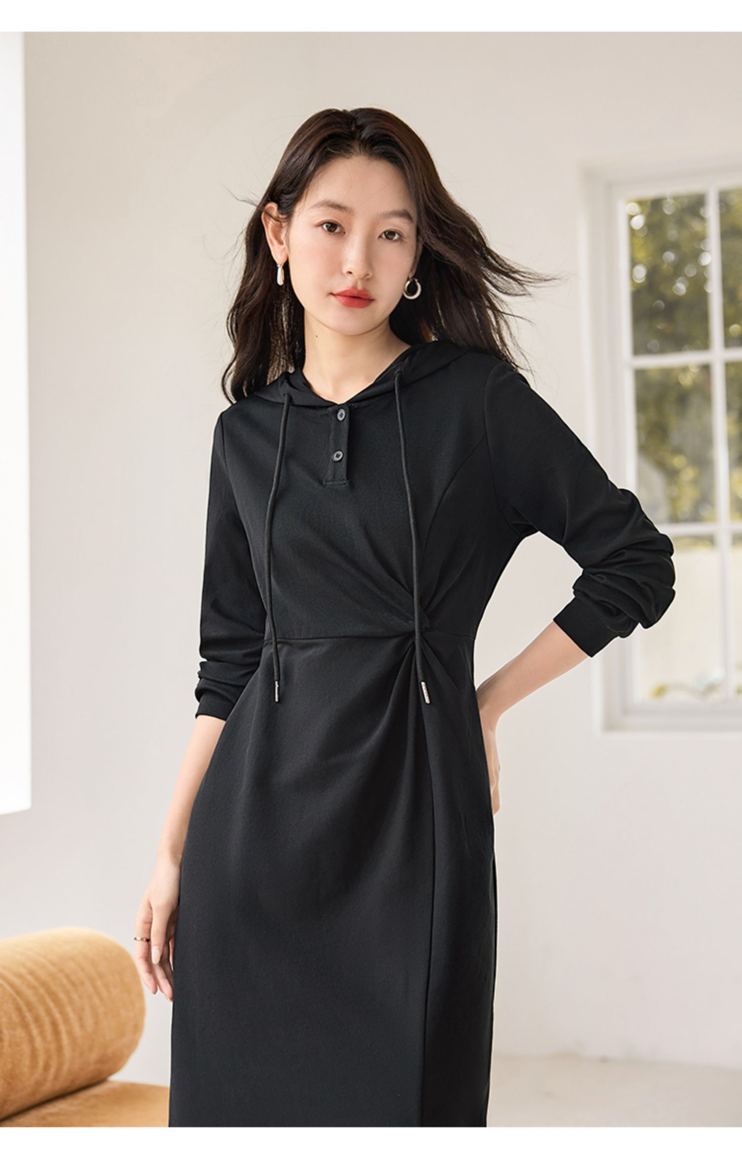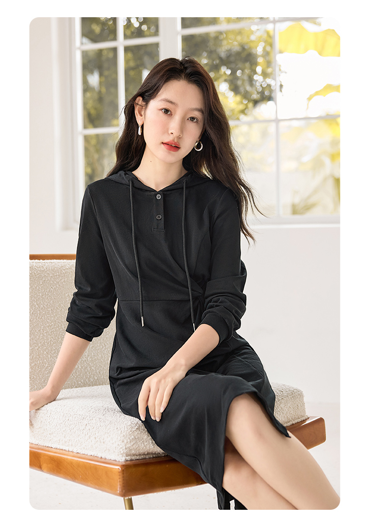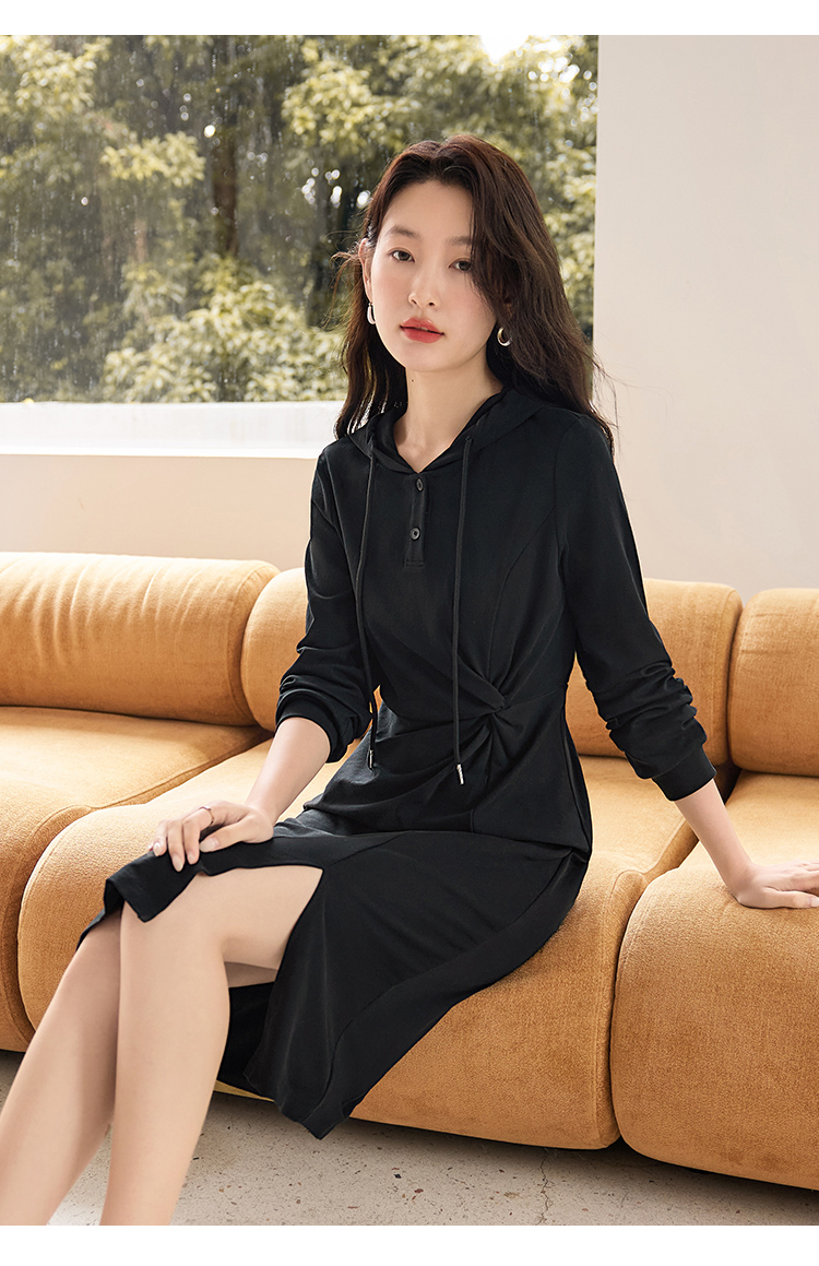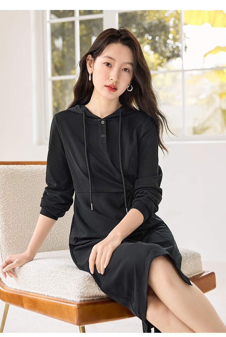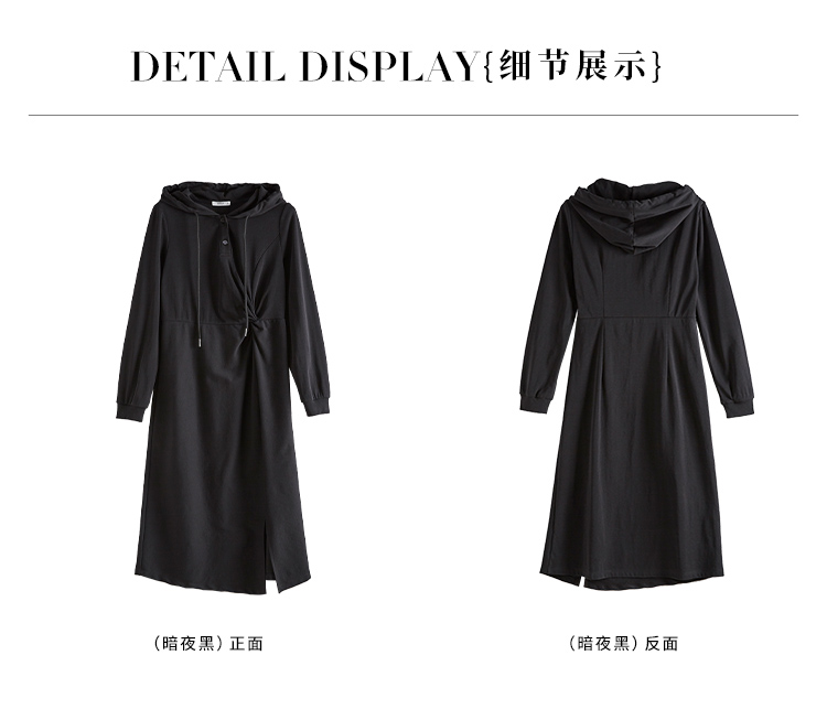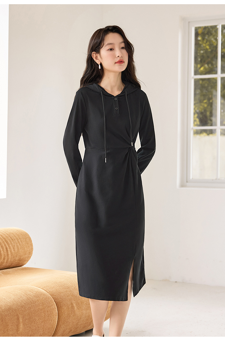 【开门红】熙世界黑色连帽卫衣连衣裙秋2025新款气质收腰显瘦休闲开叉裙子