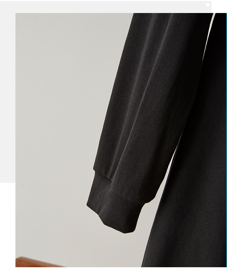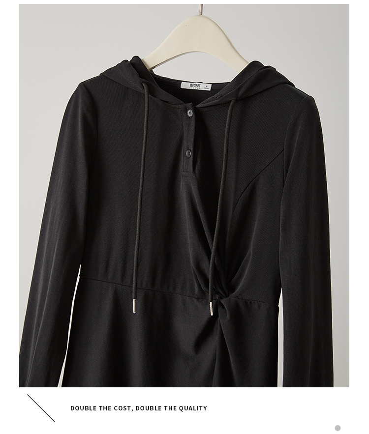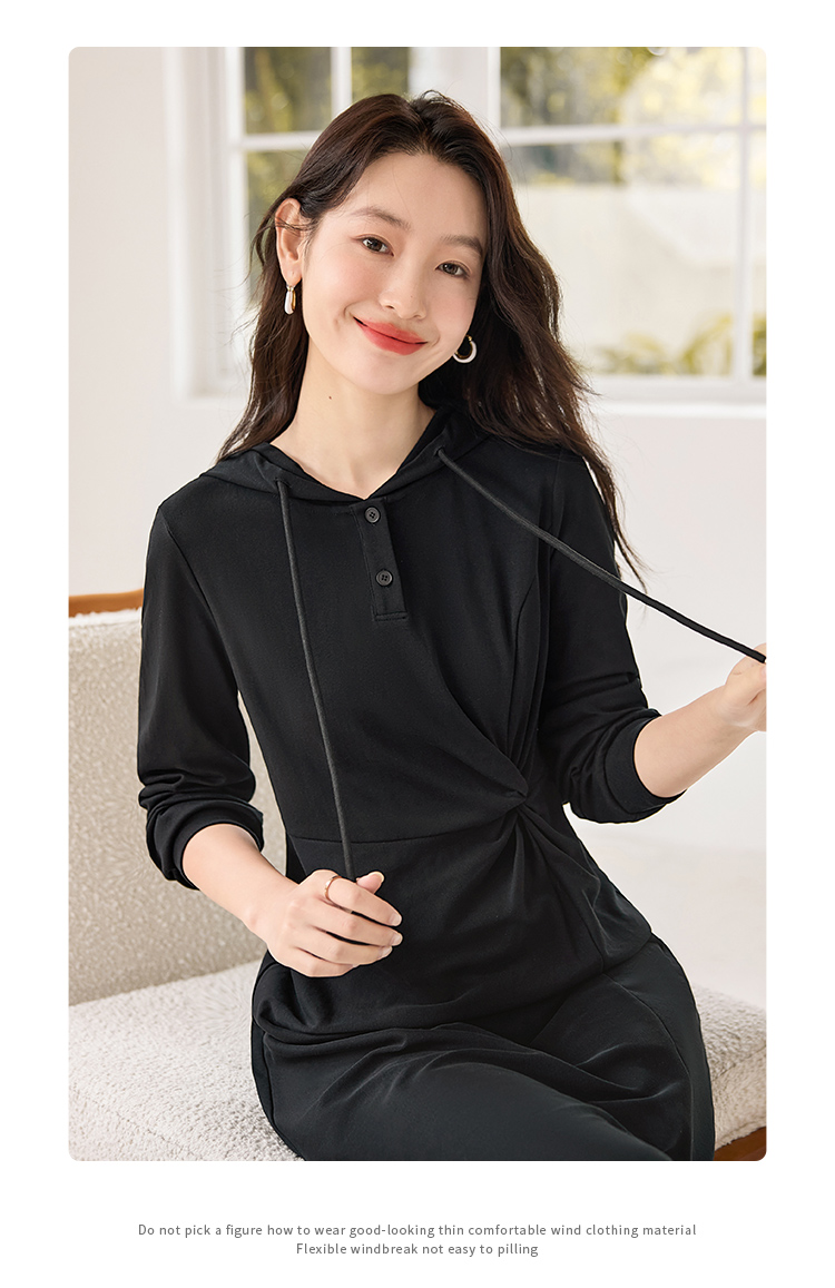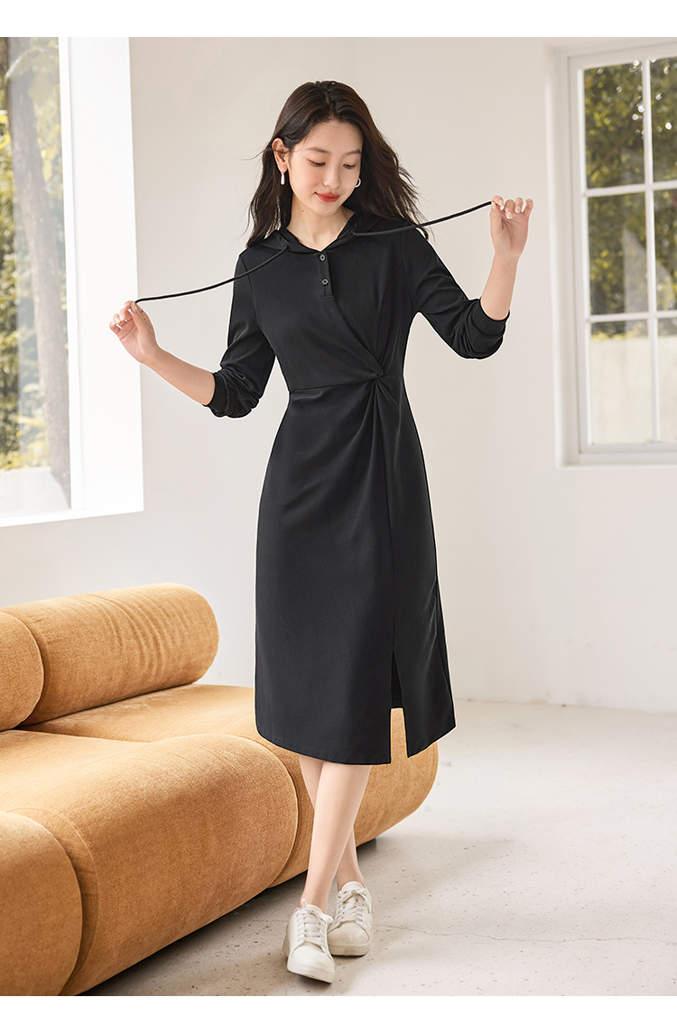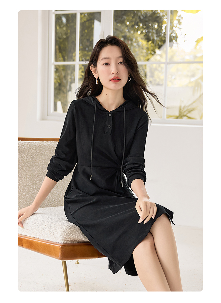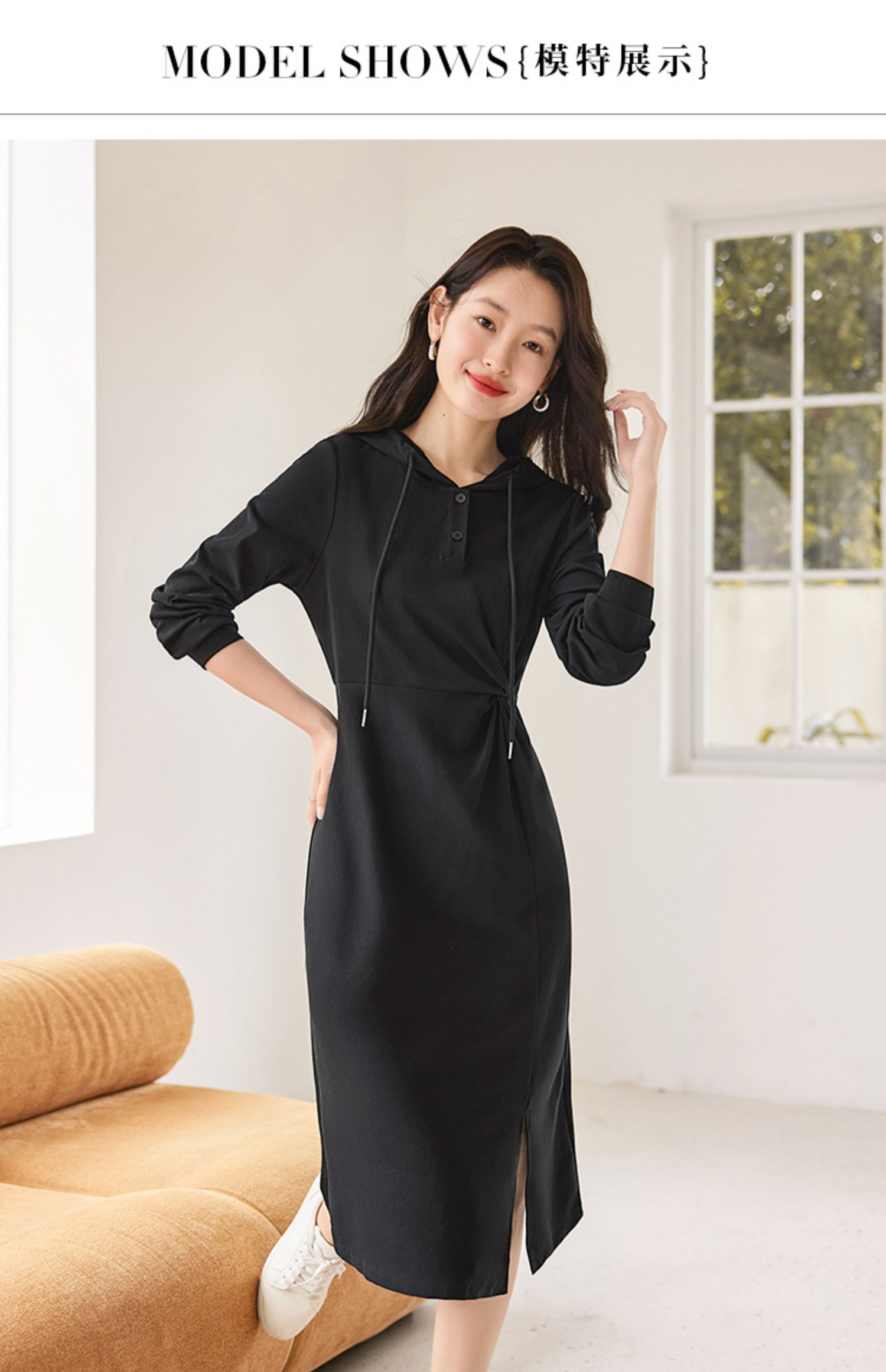 【开门红】熙世界黑色连帽卫衣连衣裙秋2025新款气质收腰显瘦休闲开叉裙子