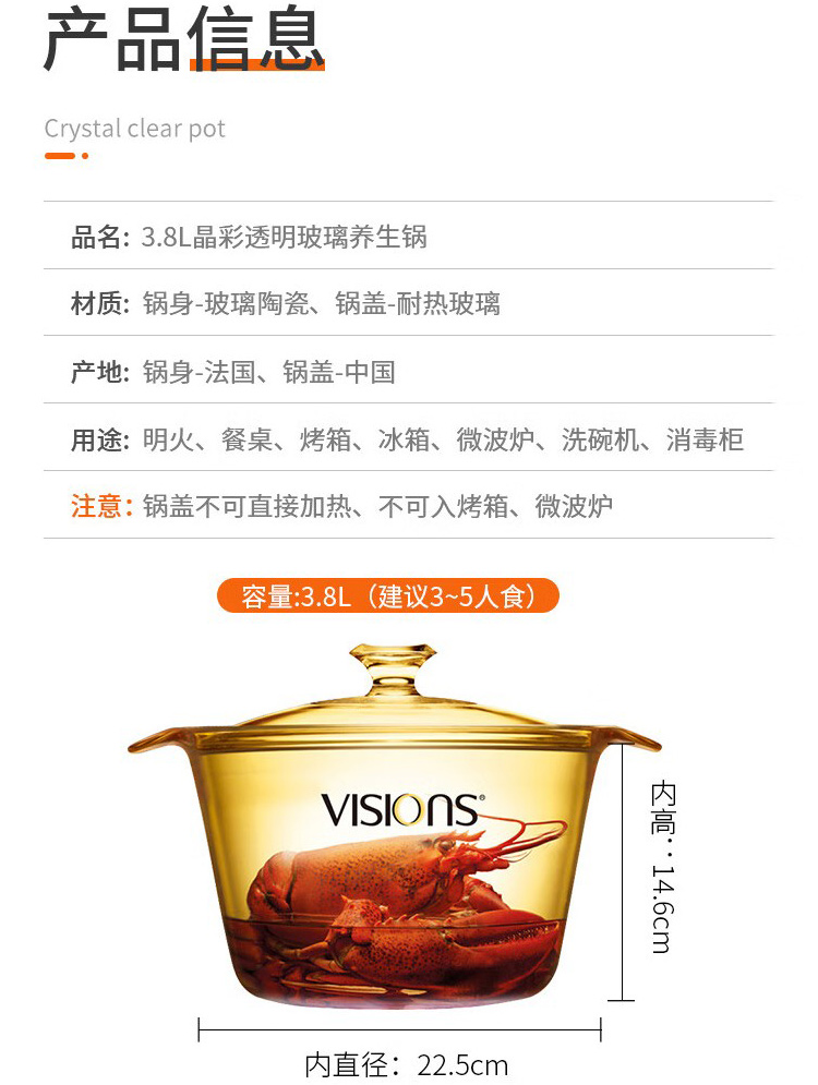 康宁(VISIONS)晶彩系列时尚养生锅3.8LVS-38-FL/E/LN/ZK